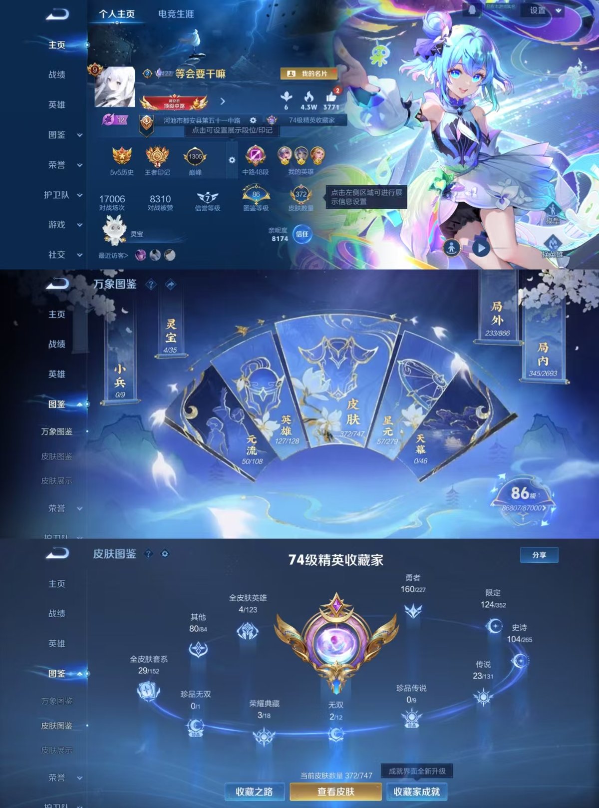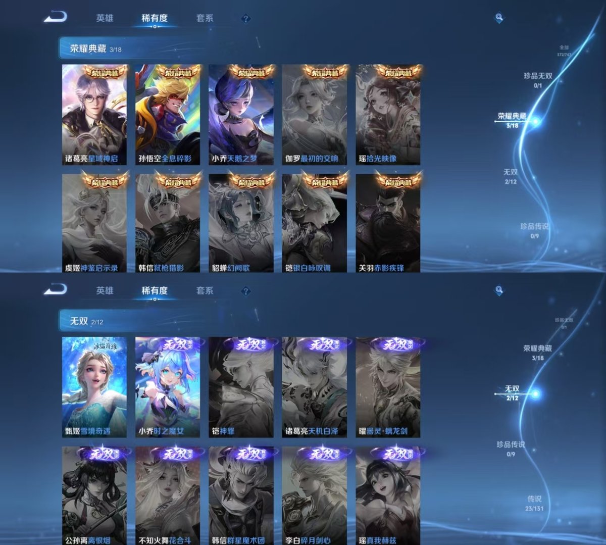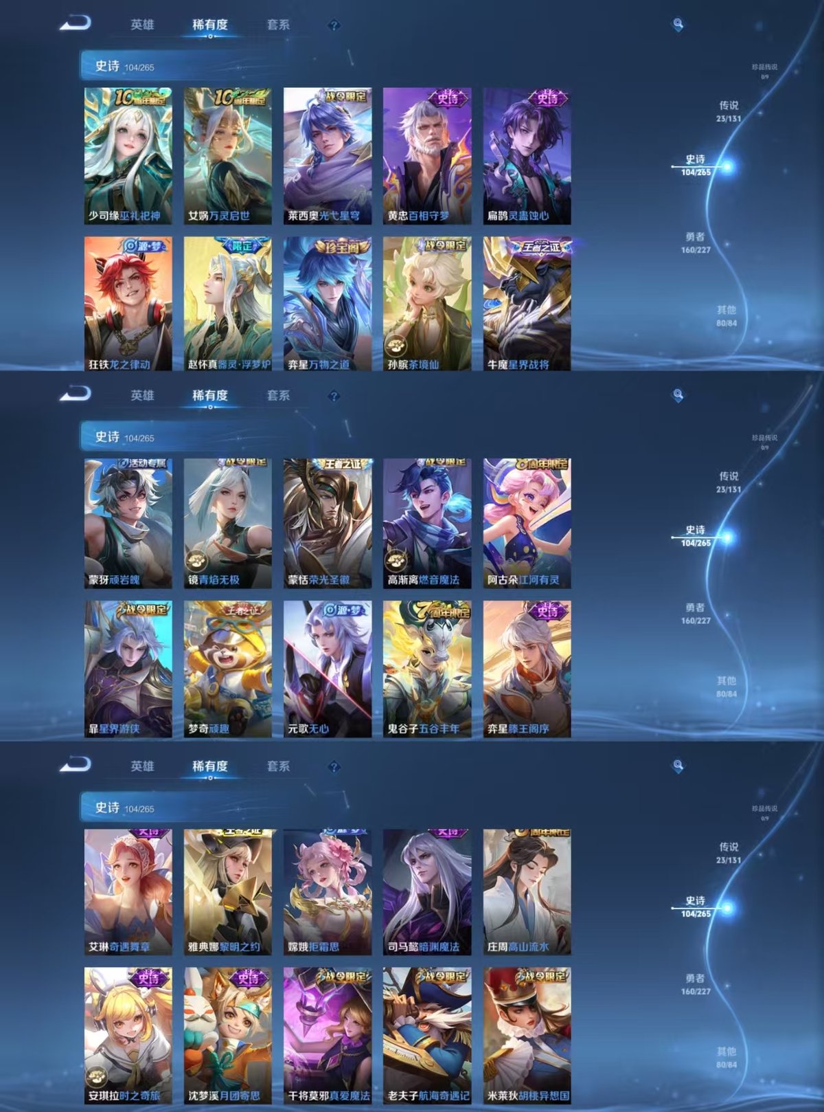 2307602-实名: 可修改 贵族等级: v9 英雄数: 127 皮肤数: 372 荣耀水晶: 天鹅之梦全息碎影星域神启 无双皮: 小乔时之魔女雪境奇遇-甄姬 传说皮: 黄金狮子座黄金射手座冠军飞将久胜战神炽阳神光一念神魔仲夏夜之梦地狱之眼胖达荣荣乞巧织情游龙清影鹤羽星尊神树通天纵目迁山 限定皮: 冰锋战神遇见飞天李小龙游园惊梦梁祝时雨天司龙胆