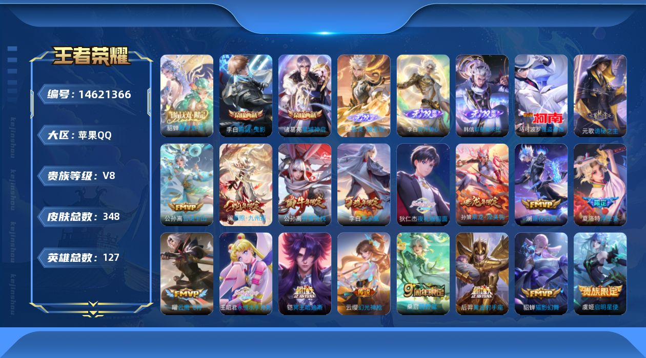 [14621366]可二次 贵族8-348皮-2典藏-19传说-3无双-1珍品传说-珍品无双1-全皮4-改名卡4-星传说皮幽冥之眼 苹果手q128区348皮2典藏19传说3无双1珍品传说1珍品无双v8 营地id436554641最强王者【珍品传说皮肤】:怪盗基德【珍品无双皮肤】:馥梦繁花【无双皮肤】:器灵·螭龙剑群星魔术团碎月剑心【荣耀典藏】:星域神启鸣剑·曳影【优质限定皮肤】:祈雪灵祝