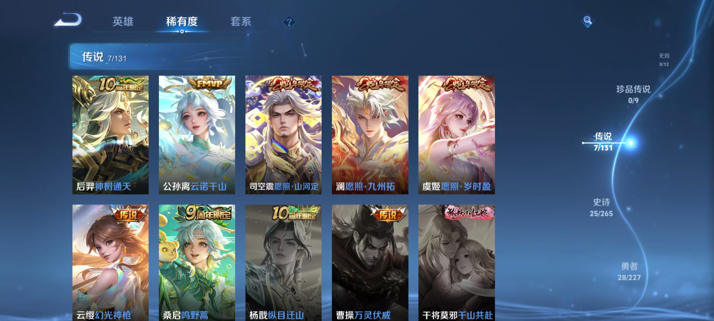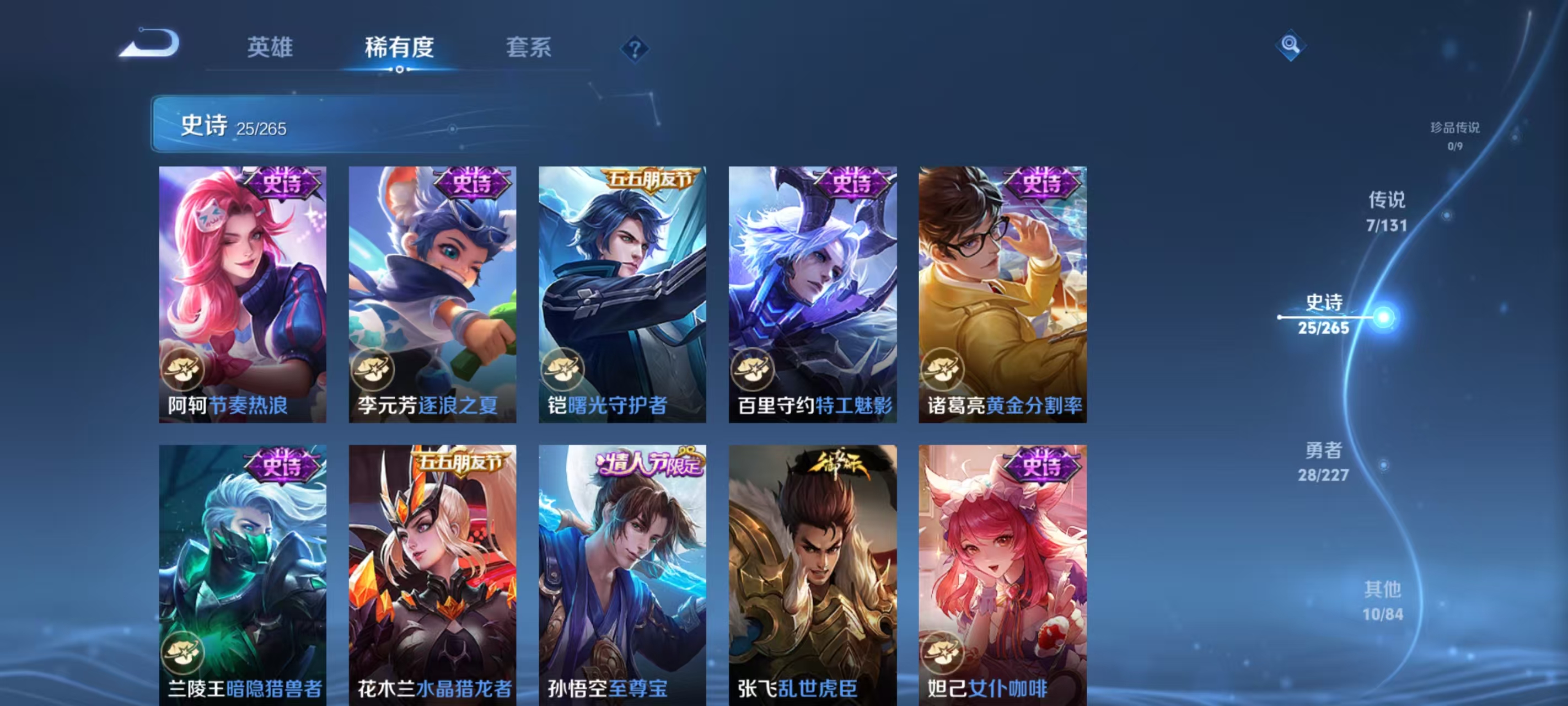 打野小号 70皮肤7传说 至尊宝,山海·玄木吟,神树通天,鸣野蒿,云诺千山,愿照·岁时盈,幻光神呛,愿照·山河定,愿照·九州拓 乱世虎臣,鹰眼统帅,逐浪之夏,黄金分割率,巫礼祀神,水晶猎龙者,涂山容容,织梦人,百相守梦,暗隐猎兽者,水果甜心,鬼剑武藏,魔术师,鸭鸭历险记,女仆咖啡,曙光守护者,特工魅影,化蝶舞,茶境仙,节奏热浪,偶像歌手,皇家上将,器灵·浮梦炉
