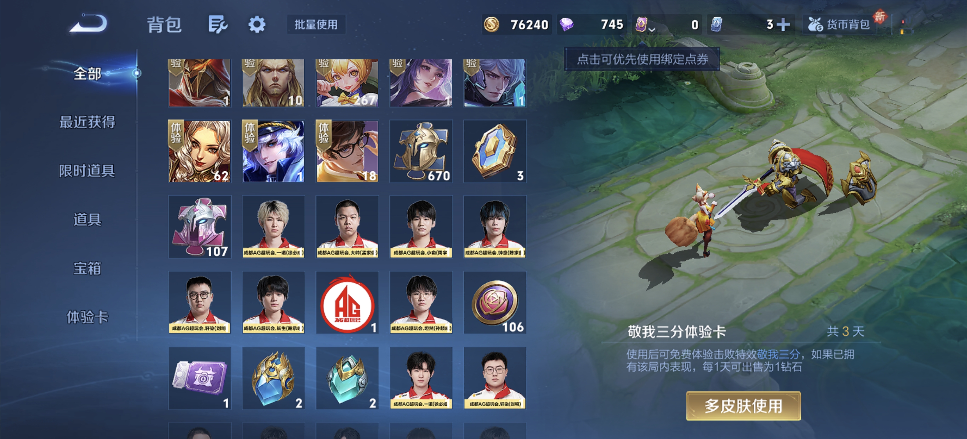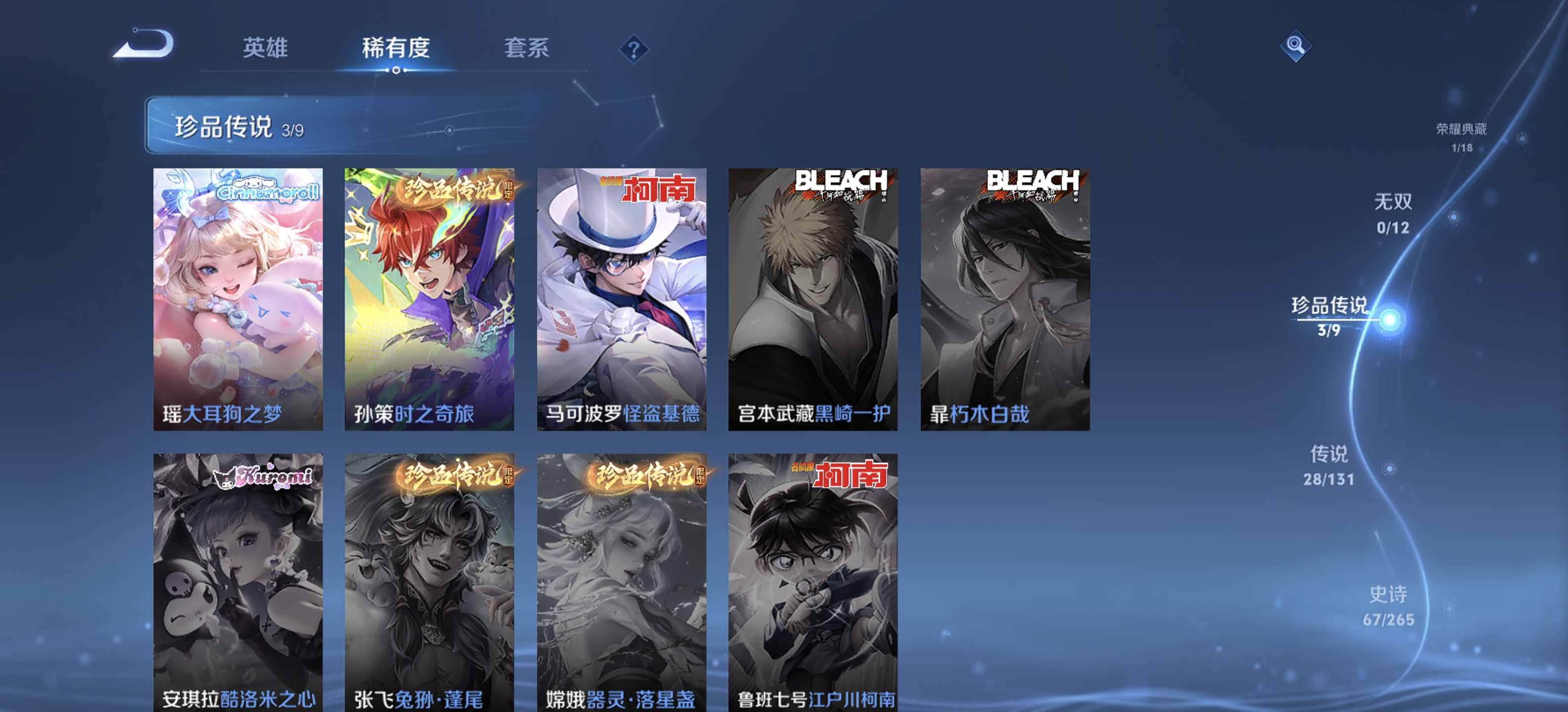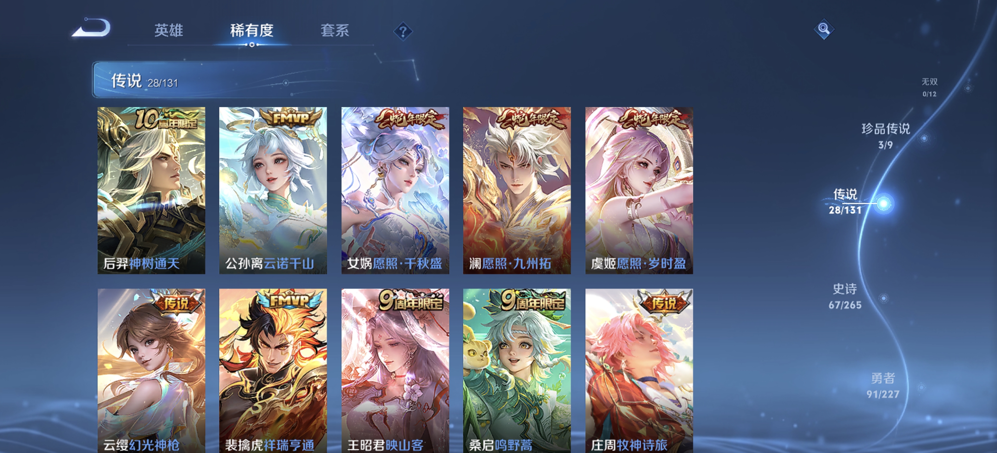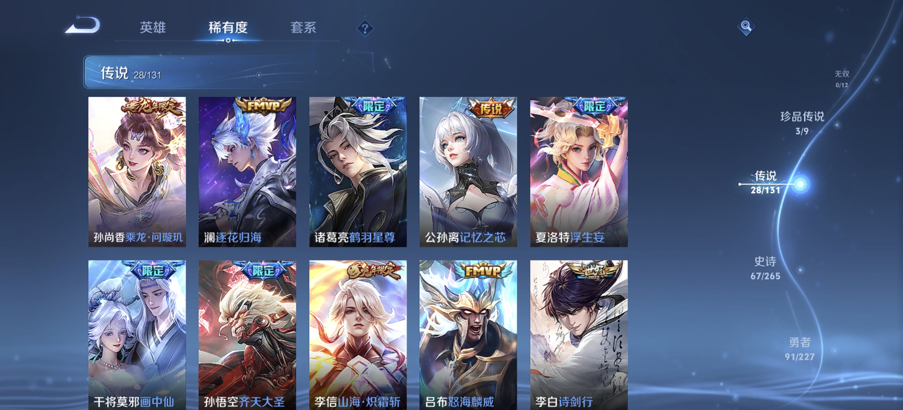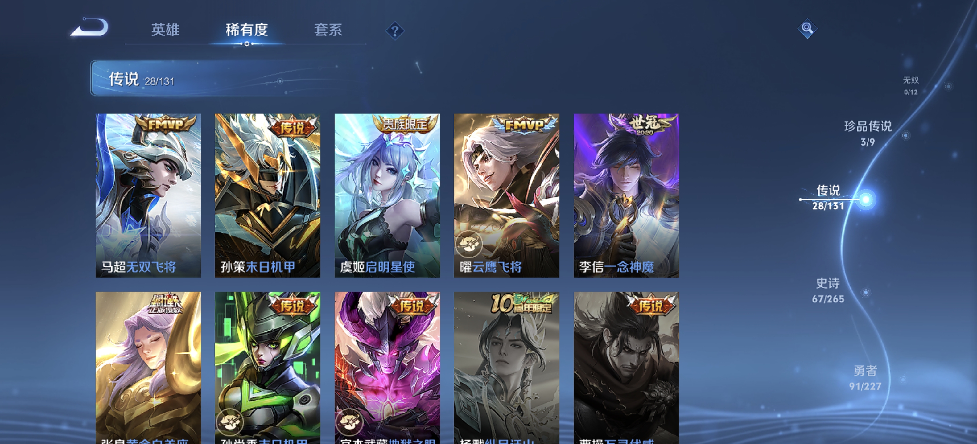 贵族等级 8级 皮肤 204 荣耀皮肤1 弑呛猎影 珍品传说3 时之奇旅,怪盗基德,大耳狗之梦 传说皮肤28 地狱之眼,神树通天,乘龙·问璇玑,祥瑞亨通,云诺千山,愿照·千秋盛,愿照·岁时盈,幻光神呛,愿照·九州拓,浮生妄,无双飞将,末日机甲,黄金白羊座,怒海麟威,山海·炽霜斩,齐天大圣,映山客,鸣野蒿,牧神诗旅,一念神魔,画中仙,记忆之芯,逐花归海,末日机甲,诗剑行,云鹰飞将,启明星使,鹤羽星尊史诗皮肤67 顽趣,江河有灵,德古拉伯爵,光弋星穹,绅士熊喵,涂山容容,千年之狐,云间偶戏,百相守梦,百相守梦,缤纷独角兽,龙之律动,鸭鸭历险记,化蝶舞,暗影游猎,天才门将,修罗,器灵·浮梦炉,万物之道,功夫厨神,茶境仙,地狱岩魂,特工魅影,箭羽风息,摇滚巨星,逐浪之夏,百相守梦,冰雪圆舞曲,电玩小子,乘风破浪,圣诞恋歌,陌上桑,乱世虎臣,魅语,电玩高手,末日机甲,曙光守护者,时之恋人,永昼,星界特工,青蛇,魔术师,暗夜猫娘,鬼剑武藏,冰冠公主,破空之剑,未来纪元,暗隐猎兽者,节奏热浪,猫狗日记,真我赫兹,女仆咖啡,皇家上将,猫狗日记,水晶猎龙者,顽岩魄,夏日便利店,紫霞仙子,星夜王子,鹰眼统帅,心灵骇客,金属风暴,水果甜心,魅力维加斯,天秀·启明,暗夜贵公子,雪豹·霜爪