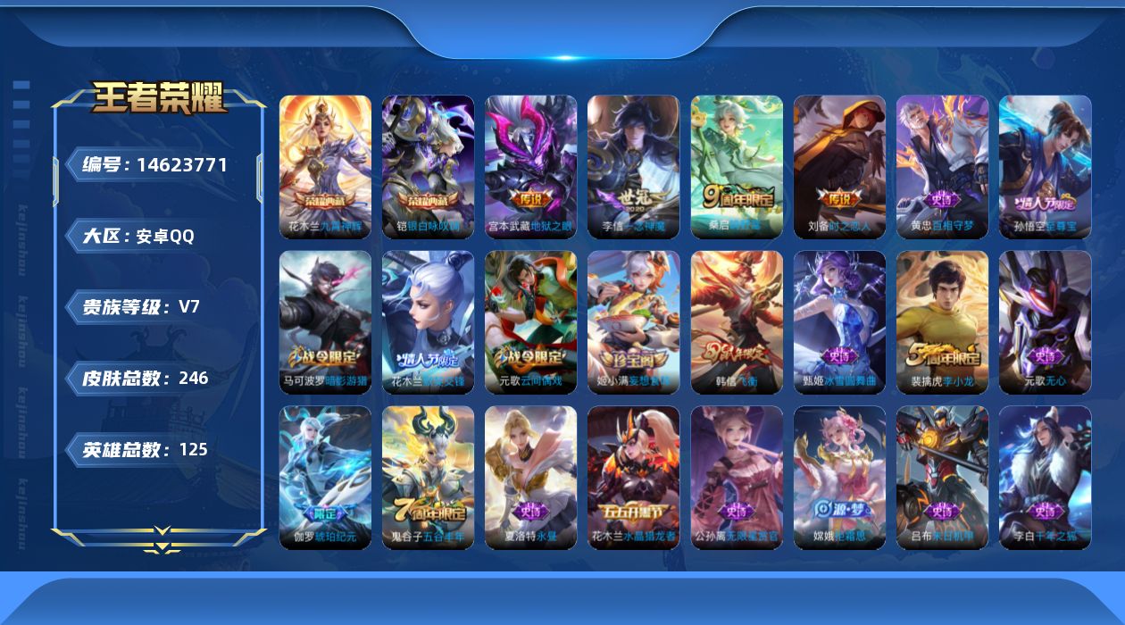 v7 2典藏 4传说 125英雄 246皮肤 可修改实名 【英雄全皮】:蒙恬全皮 【稀有英雄】:大司命韩信韩跳跳夏洛特夏师傅艾琳橘右京橘子娜可露露鸟人不知火舞赵云金蝉唐僧戈娅 【荣耀水晶】:九霄神辉木兰典藏银白咏叹调倪克斯侍卫 【传说皮】:地狱之眼