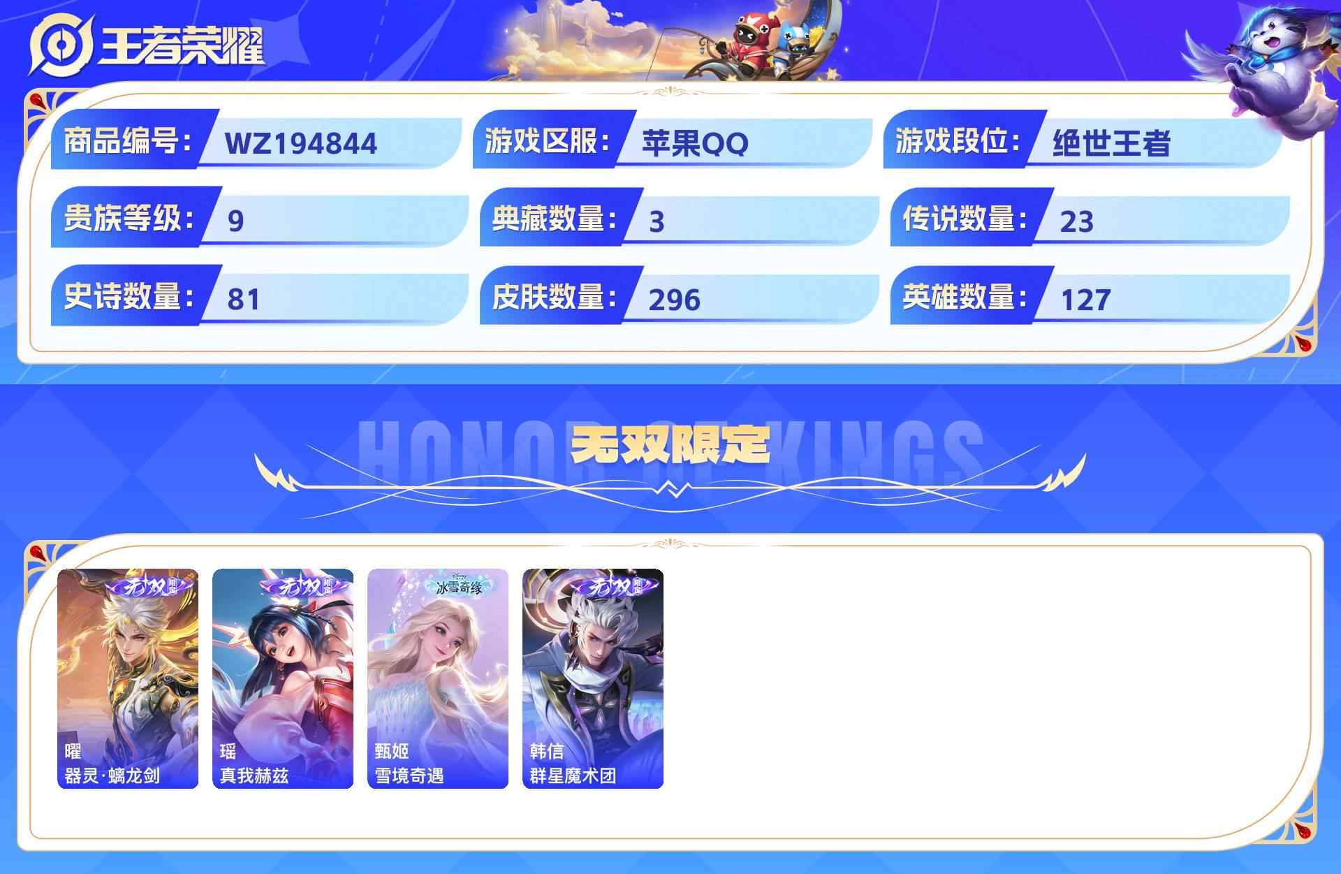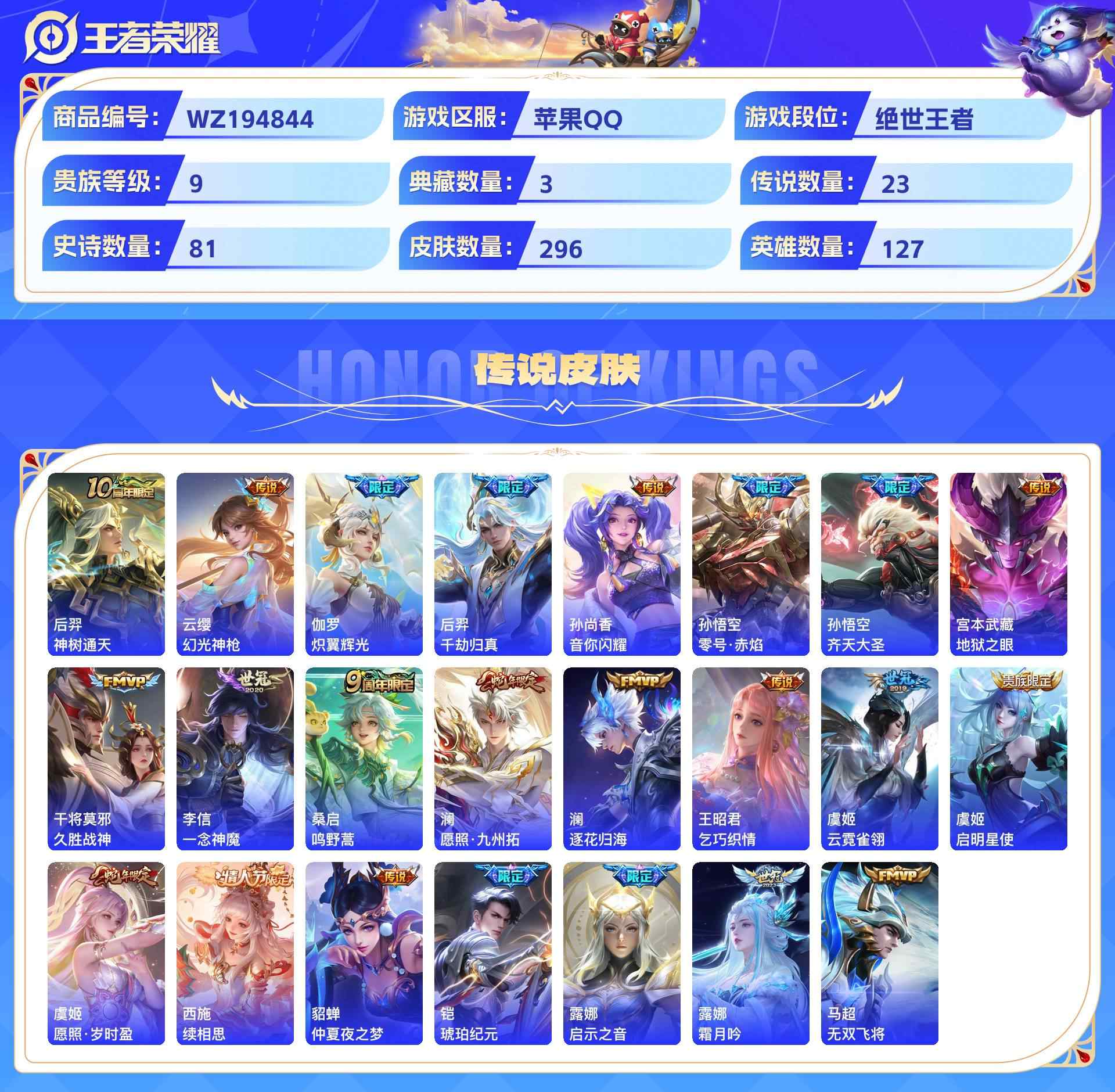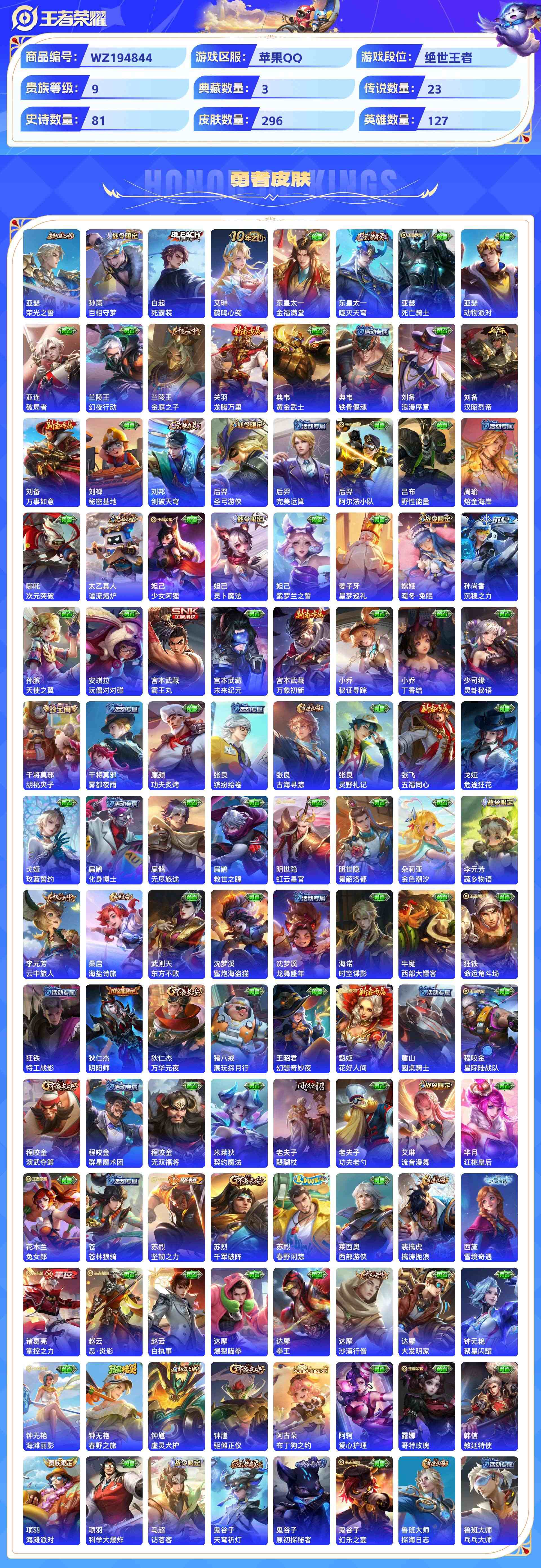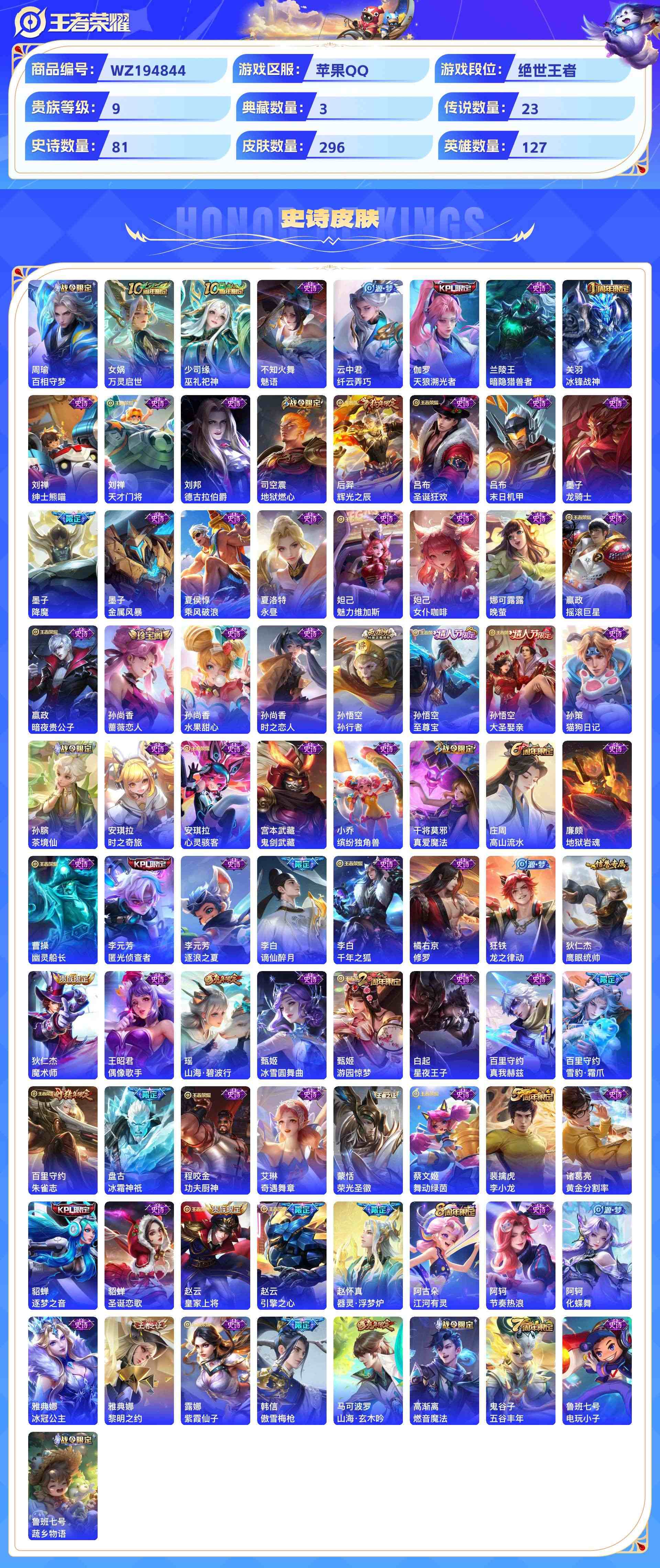 wz194844|精品号苹果qq 贵族9级 296皮 3典藏(全息碎影星域神启弑呛猎影) 5珍品传说(全息碎影星域神启弑呛猎影) 4无双(全息碎影星域神启弑呛猎影) 23传说 (神树通天幻光神呛炽翼辉光千劫归真音你闪耀零号·赤焰齐天大圣)81史诗1星传说28个性按键2天幕