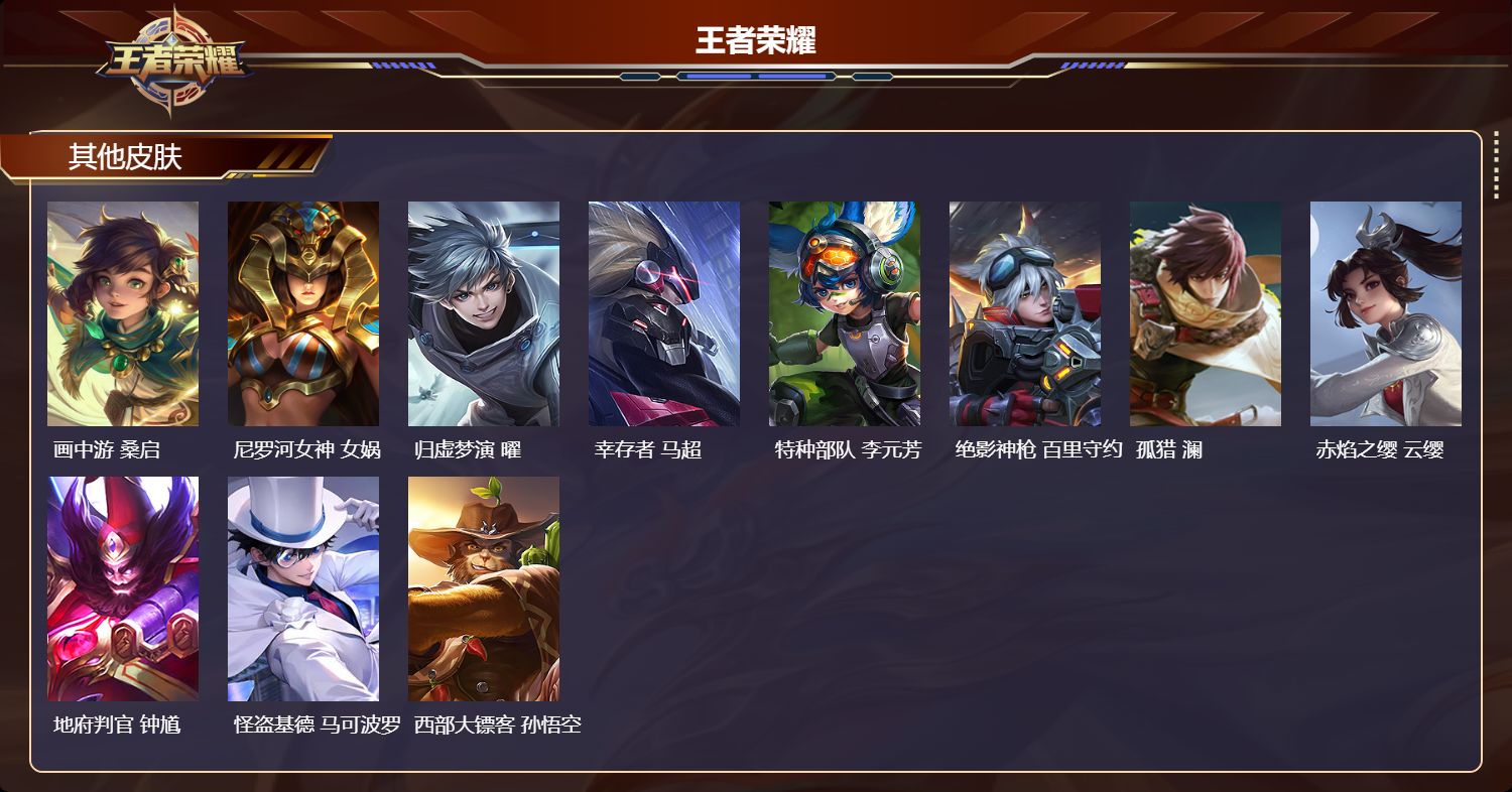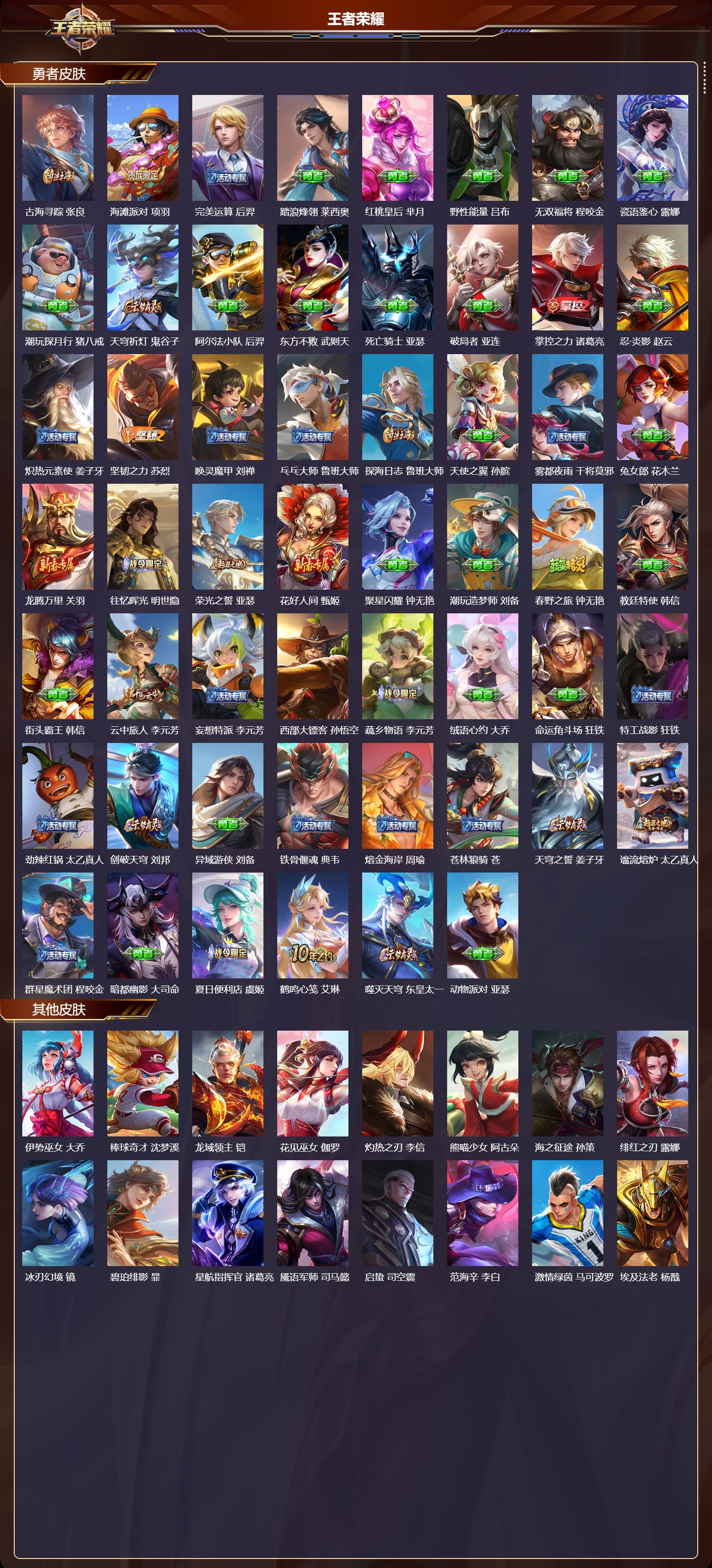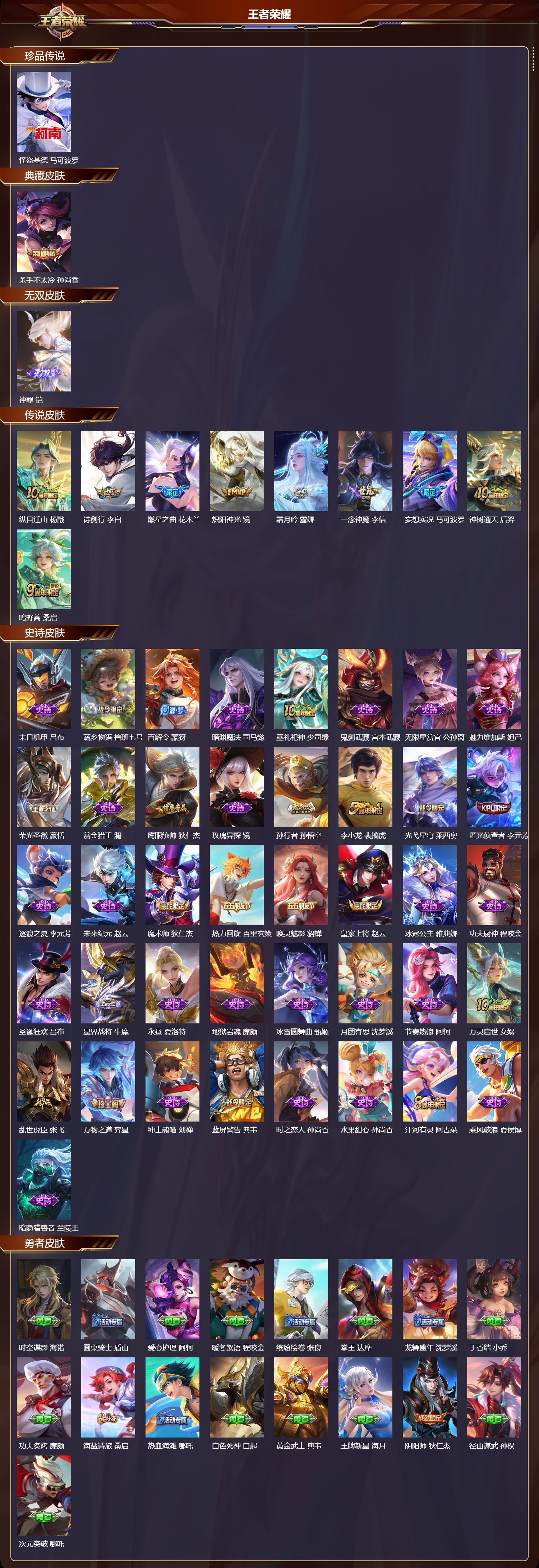 安卓qq/无双王者/149皮肤/122英雄/1典藏/0珍品无双/1无双/1珍品传说/9传说/41史诗/7稀有英雄【1 珍品传说】怪盗基德 马可波罗【1 典藏皮肤】杀手不太冷 孙尚香【1 无双皮肤】神罪 铠【9 传说皮肤】纵目迁山 杨戬诗剑行 李白燃星之曲 花木兰炽阳神光 镜霜月吟 露娜一念神魔 李信妄想实况 马可波罗神树通天 后羿鸣野蒿 桑启【41 史诗皮肤】末日机甲 吕布