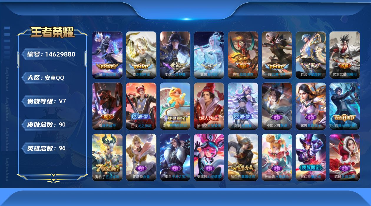 [14629880]安卓q-v7-永恒钻石v段位-96英雄-90皮肤-9传说-19史诗 【英雄全皮】:孙权全皮,空空儿全皮 【传说皮肤】:典韦战鼓燎原,澜逐花归海,露娜霜月吟,宫本武藏惊梅引,赵云淬星耀世,铠绛天战甲,镜炽阳神光,曜云鹰飞将,李信一念神魔 【限定皮肤】:姜子牙天穹之誓,狄仁杰阴阳师,赵云皇家上将,狄仁杰魔术师,达摩沙漠行僧,项羽海滩派对,孙悟空大圣娶亲,李元芳云中旅人,鬼谷子五谷丰年,沈梦溪大漠名商,鲁班大师探海日志,桑启海盐诗旅,张良古海寻踪,鬼谷子天穹祈灯 【赛季限定】:达摩沙漠行僧,张良古海寻踪,李元芳云中旅人,沈梦溪大漠名商,鲁班大师探海日志,桑启海盐诗旅,鬼谷子天穹祈灯,姜子牙天穹之誓 【史诗皮肤】:露娜紫霞仙子,赵云皇家上将,貂蝉圣诞恋歌,狄仁杰魔术师,孙尚香水果甜心,妲己魅力维加斯,李白千年之狐,安琪拉心灵骇客,铠曙光守护者,孙悟空大圣娶亲,狄仁杰鹰眼统帅,不知火舞魅语,钟馗乐园奇幻夜,夏洛特永昼,鬼谷子五谷丰年,孙膑茶境仙,阿轲化蝶舞,刘禅鸭鸭历险记,狂铁龙之律动 【其他皮肤】:项羽海滩派对,韩信街头霸王,赵云忍炎影,宫本武藏未来纪元,安琪拉玩偶对对碰,孙膑天使之翼,妲己少女阿狸,亚瑟死亡骑士,达摩拳王,甄姬花好人间,狄仁杰阴阳师,苏烈坚韧之力,刘禅秘密基地,达摩沙漠行僧,沈梦溪大漠名商,李元芳云中旅人,桑启海盐诗旅,莱西奥西部游侠,鲁班大师探海日志,张良古海寻踪,曹操决胜大满贯,后羿完美运算,鬼谷子天穹祈灯,姜子牙天穹之誓,太乙真人谧流熔炉,马超访茗客,明世隐景韶洛都,戈娅玫蓝誓约,刘备浪漫序章,钟馗虚灵犬护,沈梦溪鸭鸭历险记,苏烈春野闲踪,张良灵野札记,阿古朵布丁狗之约,露娜命运加冕,雅典娜潮玩士官长,白起死霸装,甄姬逆浪荇歌,空空儿戏梦巡演,莱西奥踏浪烽翎,哪吒罗小黑战记,孙权径山谋武,艾琳鹤鸣心笺,曹操逐霄之志,花木兰剑舞者,王昭君精灵公主,小乔万圣前夜,后羿精灵王,刘禅英喵野望,李元芳特种部队,夏侯惇战争骑士,雅典娜战争女神,马可波罗激情绿茵,杨戬埃及法老,东皇太一东海龙王,伽罗花见巫女,李信灼热之刃,嫦娥露花倒影,镜冰刃幻境,澜孤猎,司空震启蛰,云缨赤焰之缨 【营地id】:1704703708 【由于赛季三个月更新一次,段位皆有上号为准,对段位有要求这谨慎下单!!!】