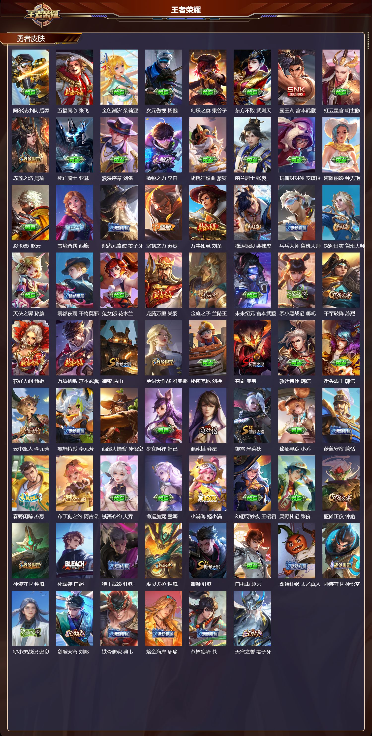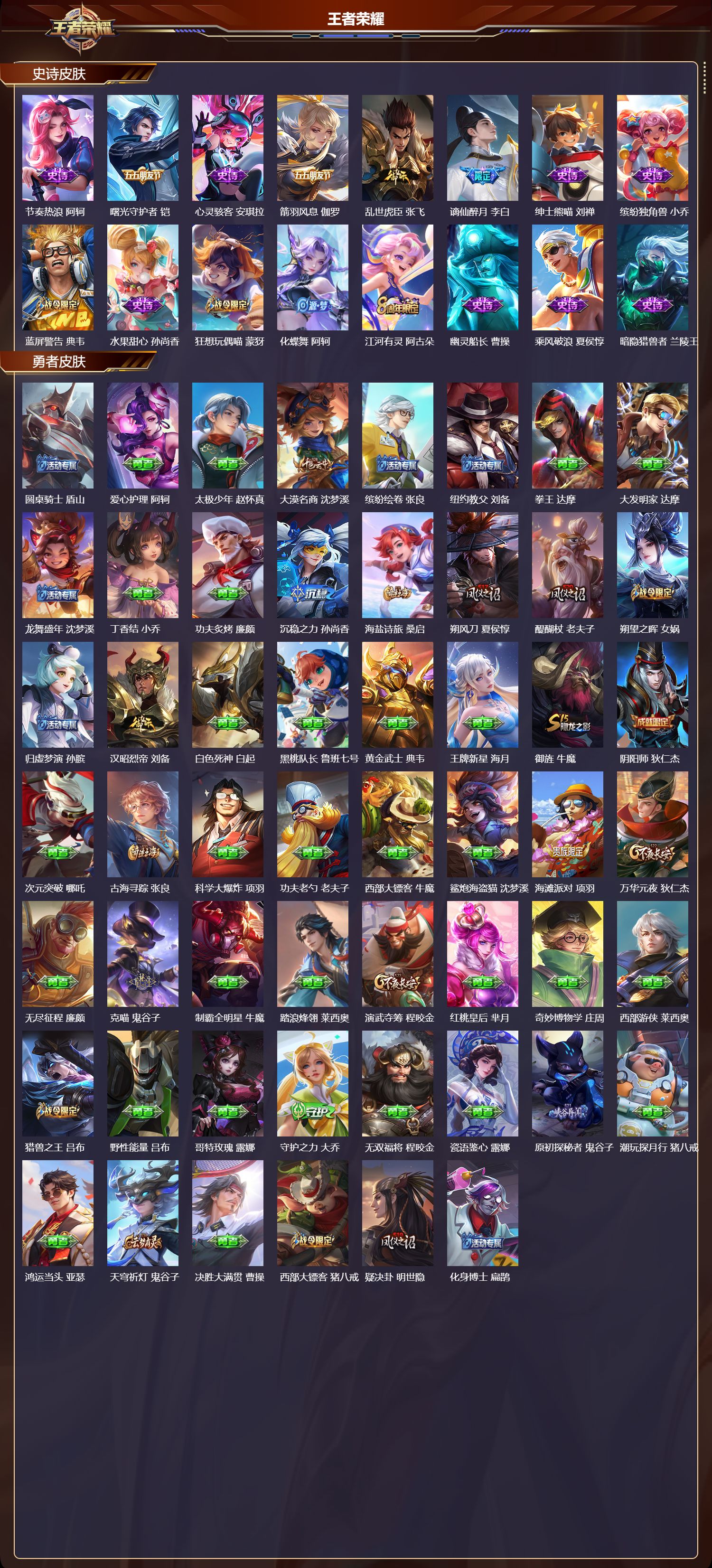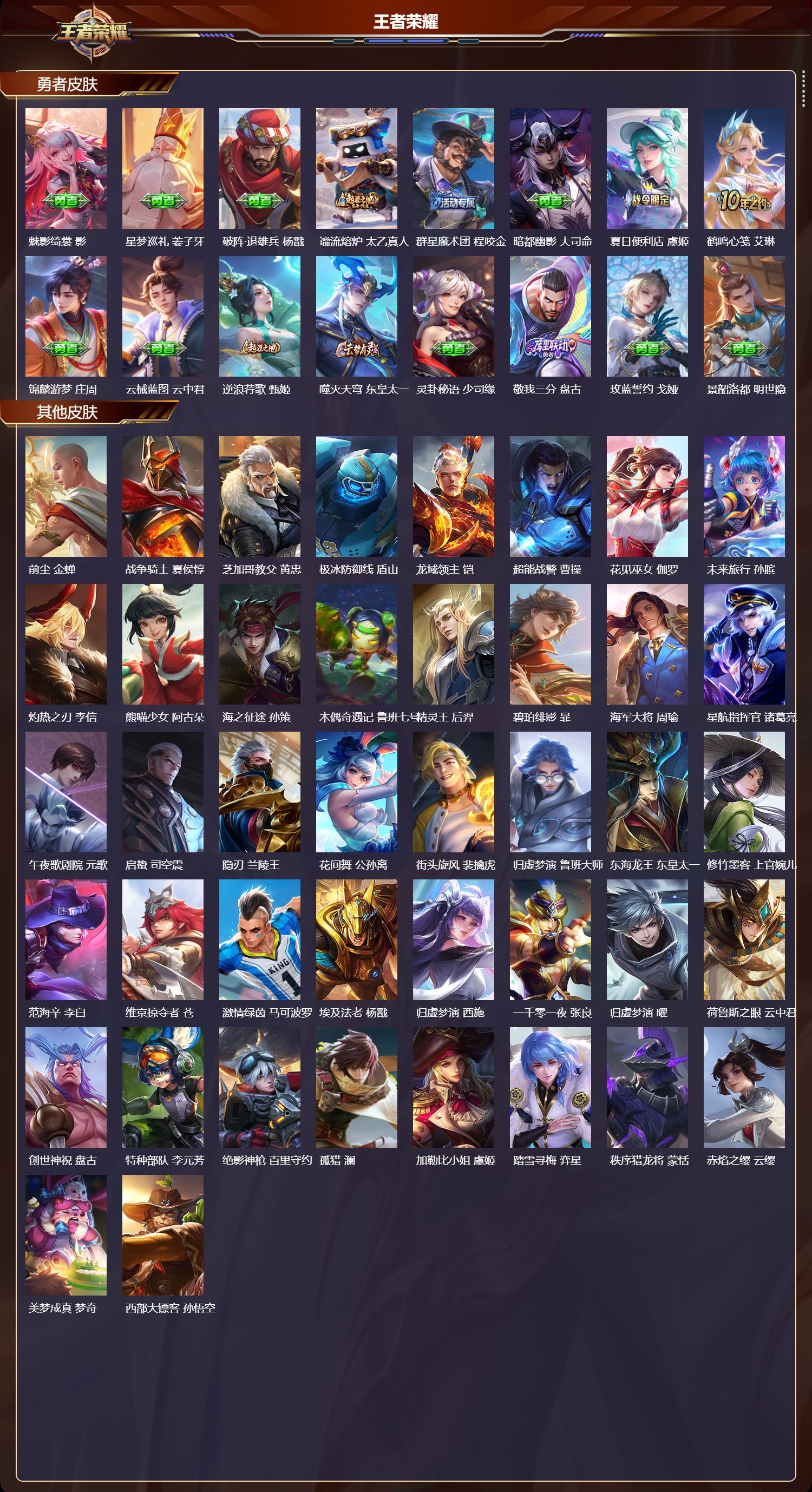 安卓qq/永恒钻石/268皮肤/126英雄/1典藏/0珍品无双/0无双/0珍品传说/7传说/78史诗/8稀有英雄【1 典藏皮肤】拾光映像 瑶【7 传说皮肤】白虎志 百里玄策浮生妄 夏洛特炽阳神光 镜异界灵契 孙尚香幻光神呛 云缨愿照·千秋盛 女娲鸣野蒿 桑启【78 史诗皮肤】末日机甲 吕布白昼王子 嬴政暗影游猎 马可波罗冰霜恋舞曲 干将莫邪狮舞东方 鲁班七号猫狗日记 大乔