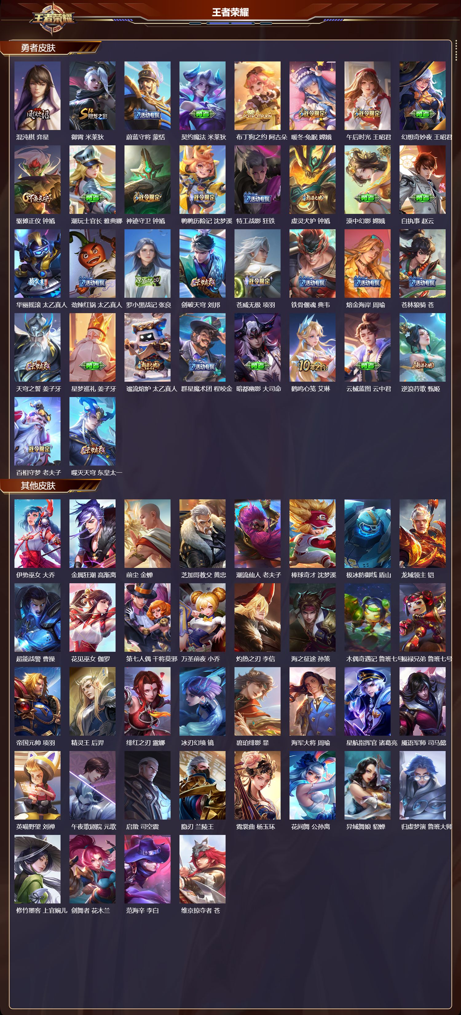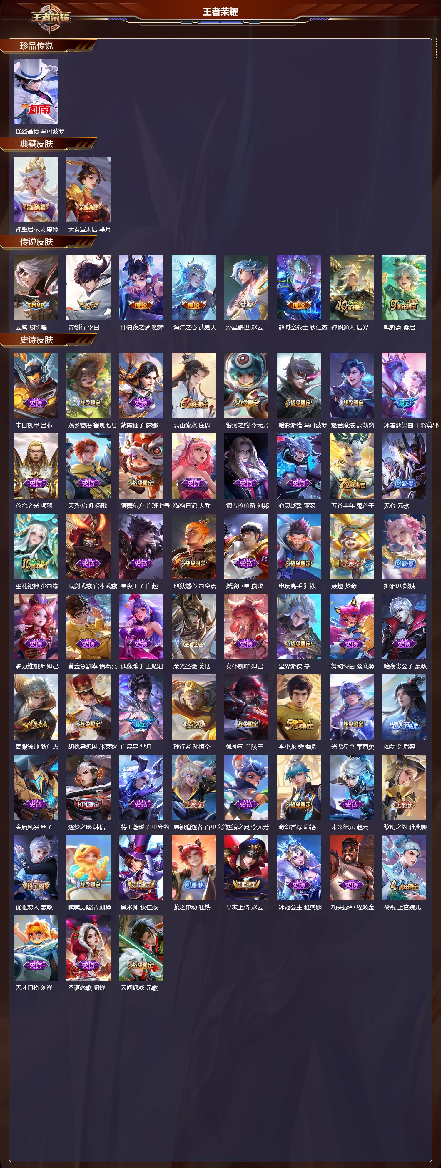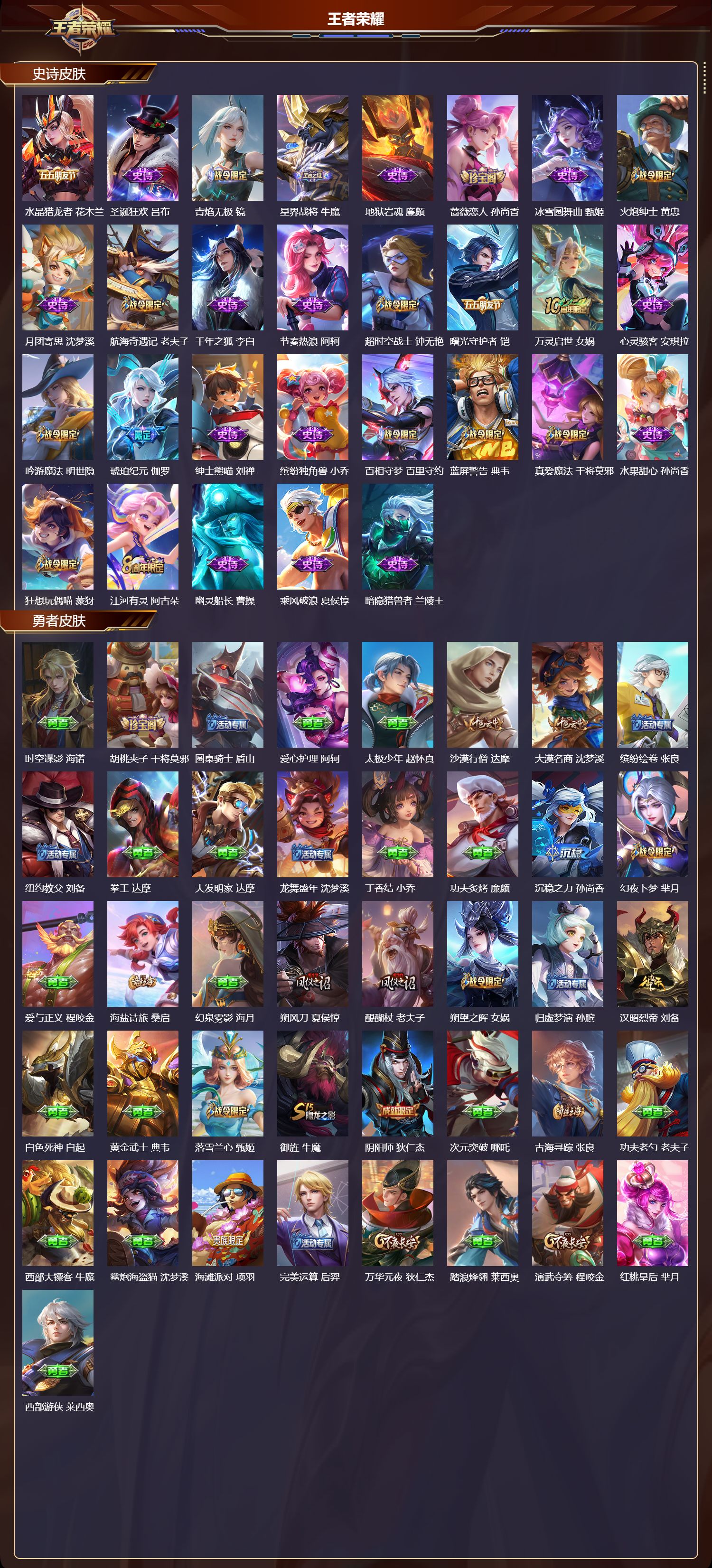安卓qq/荣耀王者/310皮肤/127英雄/2典藏/0珍品无双/0无双/1珍品传说/8传说/88史诗/9稀有英雄【1 珍品传说】怪盗基德 马可波罗【2 典藏皮肤】神鉴启示录 虞姬大秦宣太后 芈月【8 传说皮肤】云鹰飞将 曜诗剑行 李白仲夏夜之梦 貂蝉海洋之心 武则天淬星耀世 赵云超时空战士 狄仁杰神树通天 后羿鸣野蒿 桑启【88 史诗皮肤】末日机甲 吕布