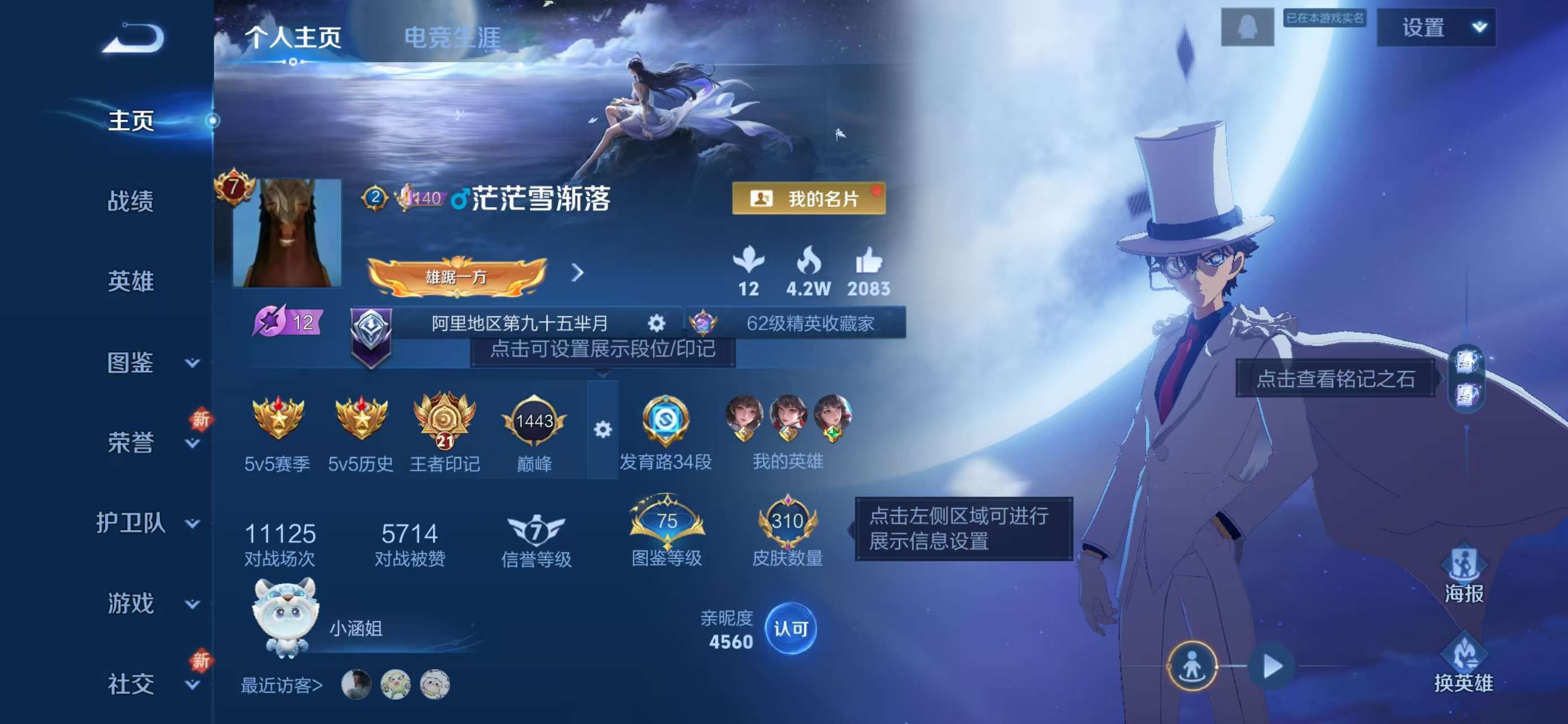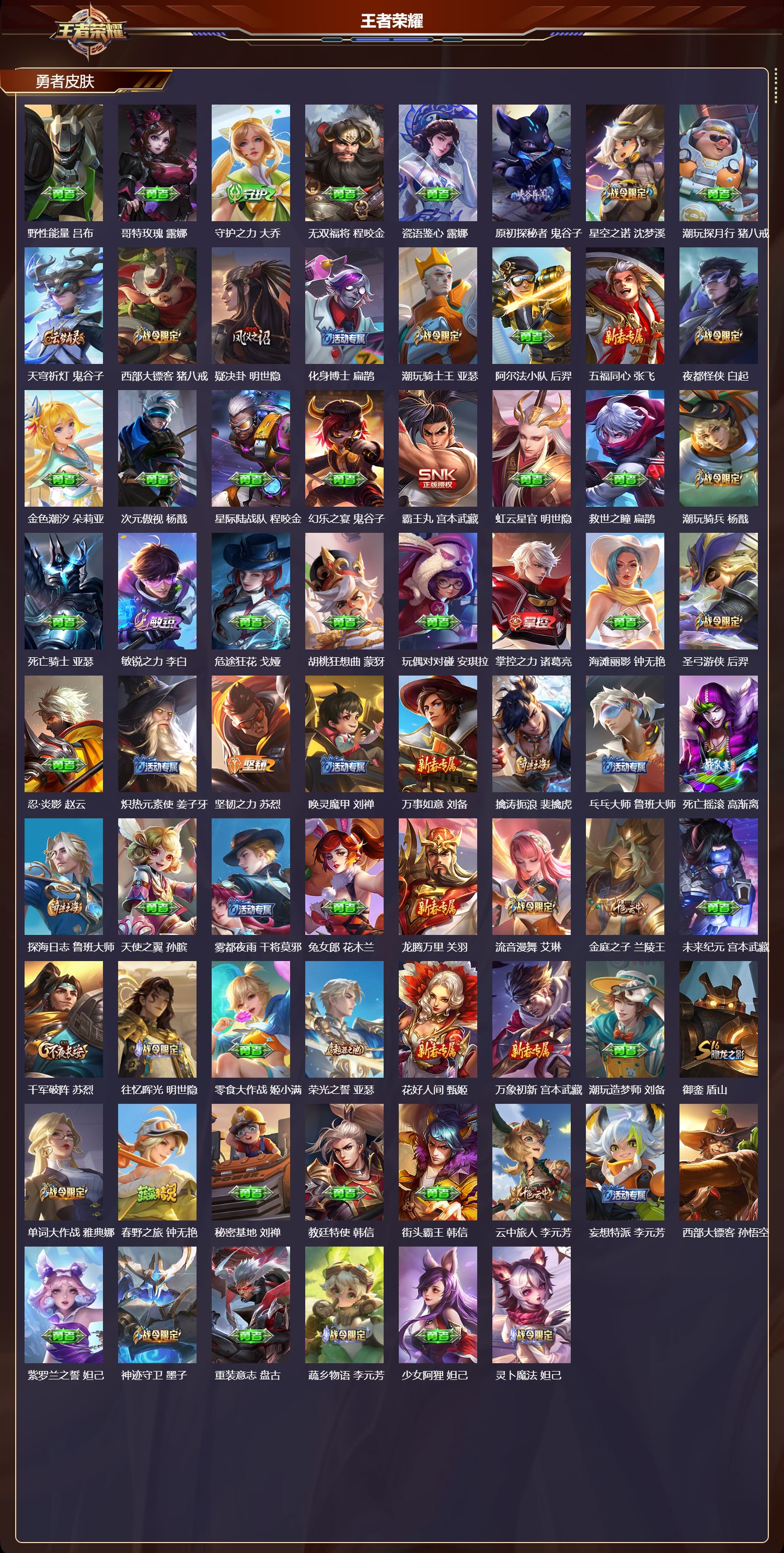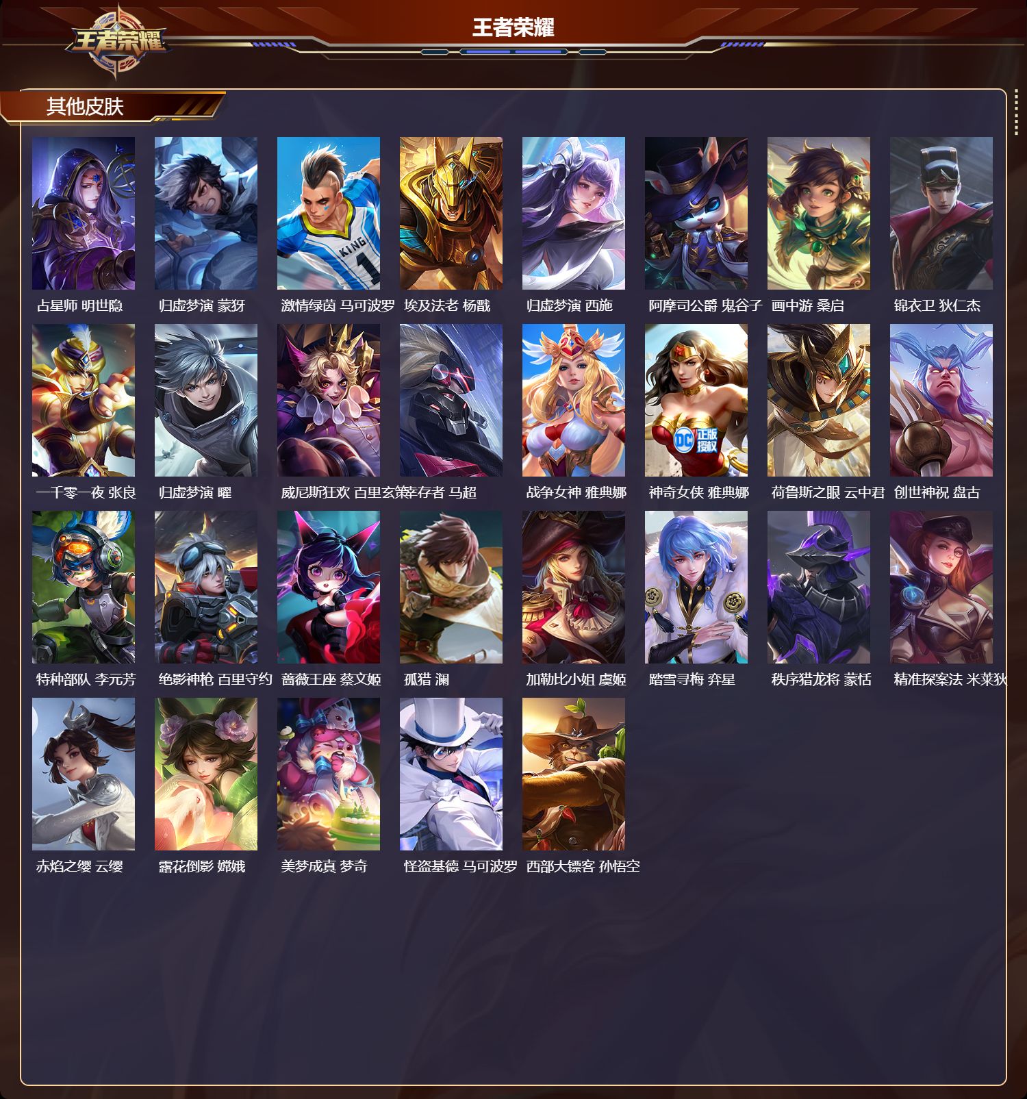 安卓qq/荣耀王者/310皮肤/127英雄/2典藏/0珍品无双/0无双/1珍品传说/8传说/88史诗/9稀有英雄【1 珍品传说】怪盗基德 马可波罗【2 典藏皮肤】神鉴启示录 虞姬大秦宣太后 芈月【8 传说皮肤】云鹰飞将 曜诗剑行 李白仲夏夜之梦 貂蝉海洋之心 武则天淬星耀世 赵云超时空战士 狄仁杰神树通天 后羿鸣野蒿 桑启【88 史诗皮肤】末日机甲 吕布