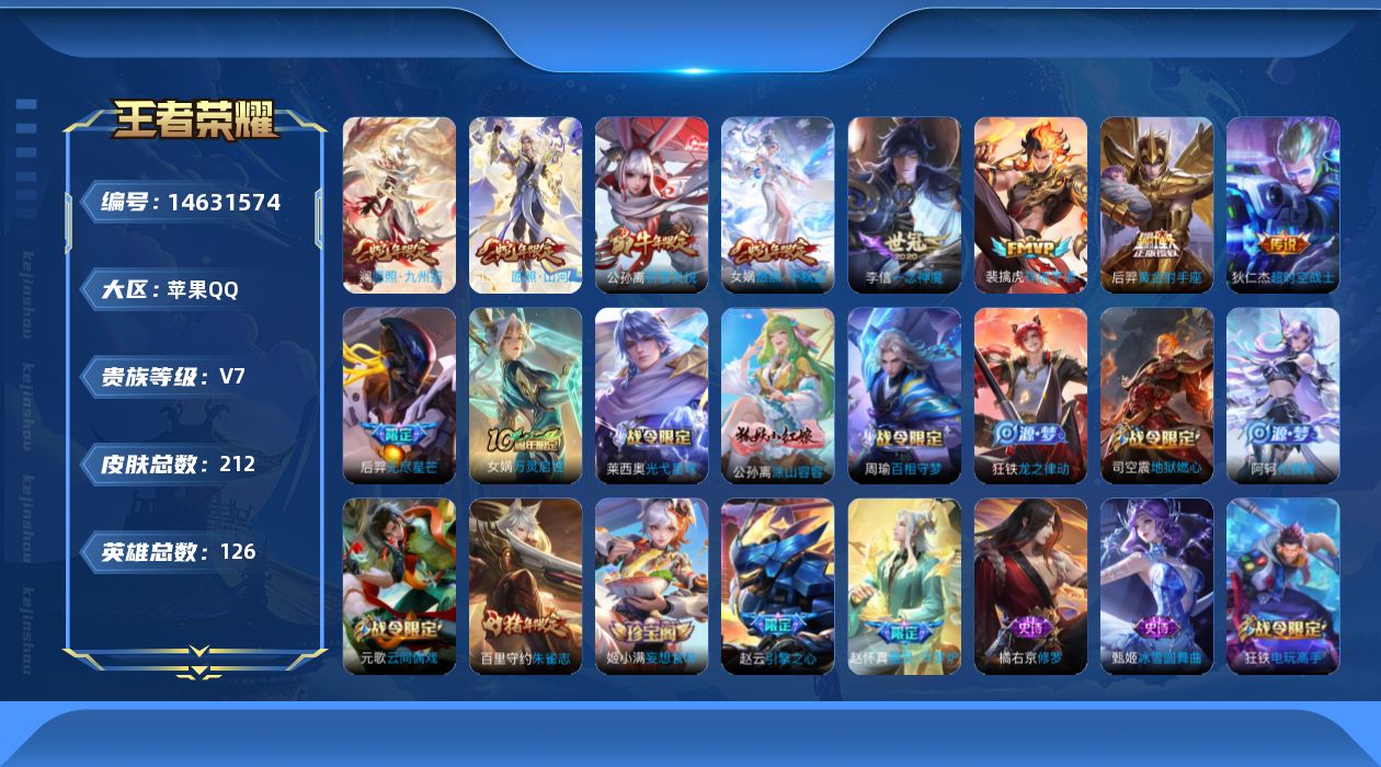 [14631574]连体和平 苹果q-v6-至尊星耀ii段位-126英雄-212皮肤-10传说-65史诗 【英雄全皮】:孙权全皮,鲁班大师全皮,司空震全皮,戈娅全皮 【传说皮肤】:后羿神树通天,司空震愿照山河定,女娲愿照千秋盛,澜愿照九州拓,裴擒虎祥瑞亨通,后羿无尽星芒,公孙离祈雪灵祝,李信一念神魔,后羿黄金射手座,狄仁杰超时空战士 【限定皮肤】:虞姬夏日便利店,姜子牙天穹之誓,狄仁杰阴阳师,赵云皇家上将,赵云引擎之心,墨子降魔,孙尚香蔷薇恋人,鲁班七号乒乒小将,扁鹊奇幻香踪,元歌云间偶戏,元歌无心,狄仁杰魔术师,达摩沙漠行僧,项羽海滩派对,王昭君午后时光,兰陵王金庭之子,孙悟空美猴王,后羿无尽星芒,李元芳云中旅人,杨戬潮玩骑兵,鬼谷子五谷丰年,百里守约朱雀志,公孙离祈雪灵祝,沈梦溪大漠名商,裴擒虎李小龙,裴擒虎擒涛扼浪,狂铁电玩高手,米莱狄胡桃异想国,云中君纤云弄巧,西施玲珑珍味,鲁班大师匿光启智者,鲁班大师探海日志,桑启海盐诗旅,戈娅驭风魔法,艾琳流音漫舞,司空震地狱燃心,阿古朵江河有灵,张良古海寻踪,蒙犽百解令,高渐离燃音魔法,妲己灵卜魔法,鬼谷子天穹祈灯,姬小满妄想食味,百里玄策超元猎域,沈梦溪龙舞盛年,鲁班七号蔬乡物语,李元芳蔬乡物语,刘邦剑破天穹,程咬金群星魔术团,周瑜熔金海岸 【年限皮肤】:百里守约朱雀志,孙悟空美猴王,公孙离祈雪灵祝 【赛季限定】:达摩沙漠行僧,兰陵王金庭之子,张良古海寻踪,李元芳云中旅人,沈梦溪大漠名商,裴擒虎擒涛扼浪,鲁班大师探海日志,桑启海盐诗旅,鬼谷子天穹祈灯,刘邦剑破天穹,姜子牙天穹之誓 【战令限定】:虞姬夏日便利店,扁鹊奇幻香踪,元歌云间偶戏,王昭君午后时光,艾琳流音漫舞,杨戬潮玩骑兵,狂铁电玩高手,米莱狄胡桃异想国,西施玲珑珍味,司空震地狱燃心,戈娅驭风魔法,高渐离燃音魔法,妲己灵卜魔法,鲁班七号蔬乡物语,李元芳蔬乡物语 【史诗皮肤】:鲁班七号电玩小子,项羽苍穹之光,赵云皇家上将,赵云未来纪元,貂蝉圣诞恋歌,甄姬冰雪圆舞曲,狄仁杰魔术师,廉颇地狱岩魂,宫本武藏鬼剑武藏,孙尚香蔷薇恋人,孙尚香水果甜心,嬴政摇滚巨星,墨子金属风暴,曹操幽灵船长,吕布末日机甲,张飞乱世虎臣,韩信白龙吟,赵云引擎之心,花木兰水晶猎龙者,雅典娜冰冠公主,安琪拉心灵骇客,铠曙光守护者,蔡文姬舞动绿茵,李元芳逐浪之夏,程咬金功夫厨神,阿轲节奏热浪,大乔猫狗日记,百里