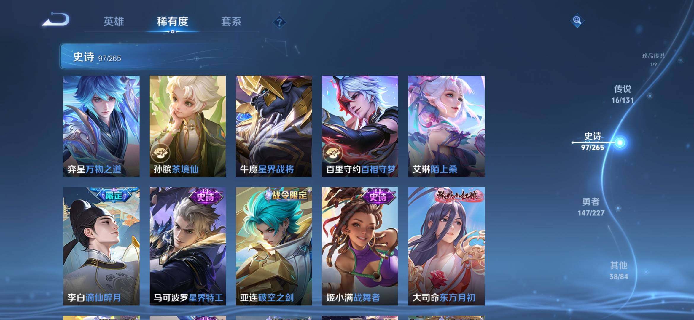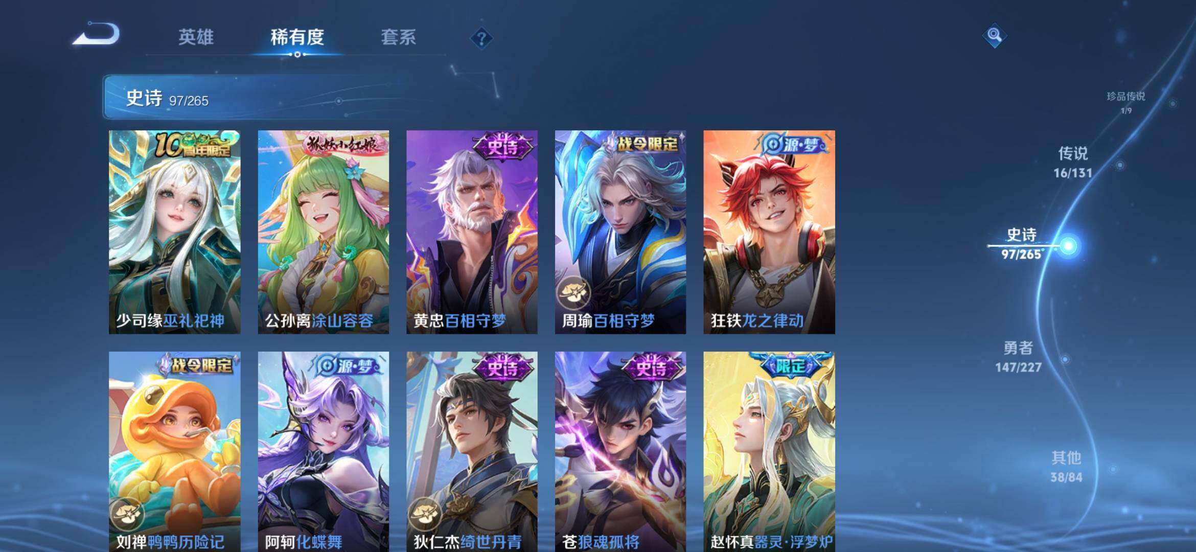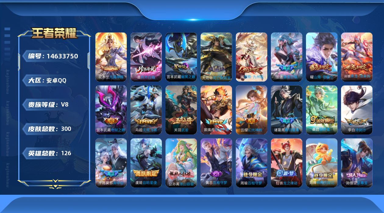 [14633750]安卓q-v8-至尊星耀ii段位-126英雄-300皮肤-1典藏皮肤-1珍品传说-16传说-97史诗 【英雄全皮】:孙权全皮,苍全皮,鬼谷子全皮,大司命全皮,赵怀真全皮,空空儿全皮,影全皮 【荣耀典藏】:花木兰九霄神辉 【珍品传说】:暃朽木白哉 【传说皮肤】:后羿神树通天,大司命死亡执政官,澜愿照九州拓,云缨幻光神呛,裴擒虎祥瑞亨通,桑启鸣野蒿,亚连落雪白狼,孙策乘龙淬吴钩,诸葛亮鹤羽星尊,干将莫邪画中仙,曜山海苍雷引,李白诗剑行,马超无双飞将,虞姬启明星使,关羽武圣,宫本武藏地狱之眼 【限定皮肤】:蔡文姬夏日便利店,大乔绒语心约,虞姬夏日便利店,姜子牙天穹之誓,李白谪仙醉月,狄仁杰阴阳师,赵云皇家上将,赵云引擎之心,墨子降魔,孙尚香蔷薇恋人,鲁班七号狮舞东方,钟无艳超时空战士,扁鹊奇幻香踪,元歌无心,甄姬落雪兰心,典韦蓝屏警告,典韦岱宗,马可波罗暗影游猎,狄仁杰魔术师,达摩沙漠行僧,项羽海滩派对,老夫子醍醐杖,老夫子航海奇遇记,关羽武圣,韩信傲雪梅呛,王昭君午后时光,兰陵王金庭之子,花木兰默契交锋,孙悟空至尊宝,孙悟空孙行者,李元芳银河之约,李元芳匿光侦查者,李元芳云中旅人,虞姬启明星使,钟馗驱傩正仪,干将莫邪画中仙,鬼谷子原初探秘者,鬼谷子五谷丰年,诸葛亮鹤羽星尊,百里玄策原初追逐者,百里守约朱雀志,沈梦溪大漠名商,沈梦溪匿光破解者,裴擒虎擒涛扼浪,狂铁电玩高手,云中君纤云弄巧,上官婉儿梁祝,嫦娥拒霜思,曜山海苍雷引,西施玲珑珍味,鲁班大师探海日志,桑启海盐诗旅,戈娅驭风魔法,艾琳流音漫舞,赵怀真鹤归松栖,司空震地狱燃心,阿古朵江河有灵,张良古海寻踪,蒙犽百解令,蒙恬荣光圣徽,高渐离燃音魔法,妲己灵卜魔法,鬼谷子天穹祈灯,孙策乘龙淬吴钩,亚连落雪白狼,沈梦溪龙舞盛年,鲁班七号蔬乡物语,李元芳蔬乡物语,刘邦剑破天穹,上官婉儿群星魔术团,镜青焰无极,项羽苍威无极,刘备异域游侠,周瑜熔金海岸 【年限皮肤】:百里守约朱雀志,典韦岱宗,关羽武圣,曜山海苍雷引,孙策乘龙淬吴钩 【赛季限定】:达摩沙漠行僧,老夫子醍醐杖,兰陵王金庭之子,张良古海寻踪,李元芳云中旅人,钟馗驱傩正仪,鬼谷子原初探秘者,百里玄策原初追逐者,沈梦溪大漠名商,裴擒虎擒涛扼浪,鲁班大师探海日志,桑启海盐诗旅,鬼谷子天穹祈灯,蒙恬荣光圣徽,刘邦剑破天穹,姜子牙天穹之誓 【战令限定】:蔡文姬夏日便利店,虞姬夏