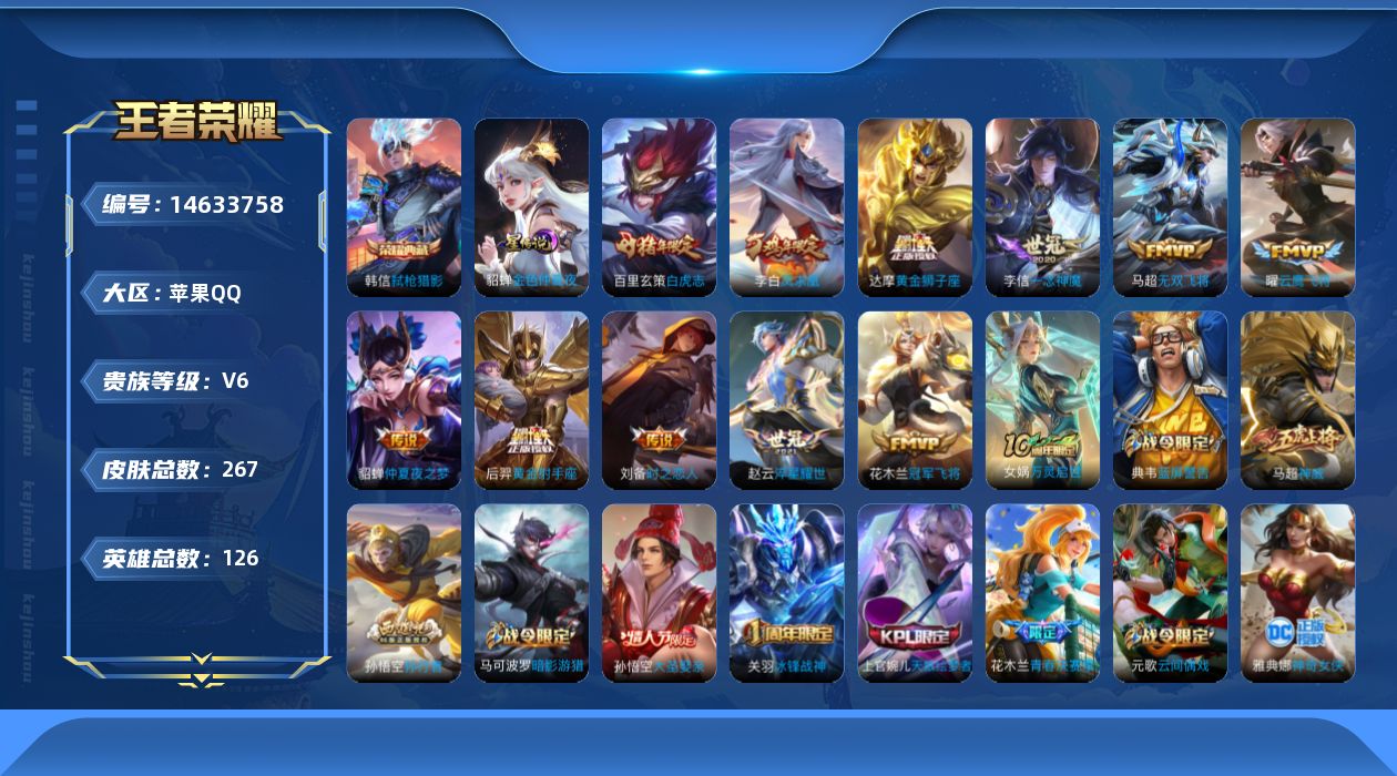 [14633758]苹果q-v6-最强王者段位-126英雄-267皮肤-1典藏皮肤-11传说-77史诗 【英雄全皮】:孙权全皮,猪八戒全皮,蒙恬全皮 【荣耀典藏】:韩信弑呛猎影 【传说皮肤】:马超无双飞将,赵云淬星耀世,曜云鹰飞将,李信一念神魔,刘备时之恋人,达摩黄金狮子座,百里玄策白虎志,花木兰冠军飞将,后羿黄金射手座,貂蝉仲夏夜之梦,李白凤求凰 【限定皮肤】:白起狰,狄仁杰阴阳师,虞姬凯尔特女王,赵云皇家上将,墨子神迹守卫,嬴政优雅恋人,嬴政白昼王子,鲁班七号狮舞东方,庄周云端筑梦师,庄周高山流水,高渐离死亡摇滚,阿轲迷踪丽影,孙膑妖精王,扁鹊炼金王,芈月重明,芈月幻夜卜梦,吕布猎兽之王,周瑜赤莲之焰,元歌云间偶戏,元歌无心,夏侯惇朔风刀,甄姬游园惊梦,曹操烛龙,典韦穷奇,典韦蓝屏警告,马可波罗逐梦之星,马可波罗暗影游猎,狄仁杰魔术师,狄仁杰万华元夜,达摩星际陆战队,达摩沙漠行僧,项羽海滩派对,老夫子醍醐杖,老夫子航海奇遇记,关羽冰锋战神,程咬金演武夺筹,刘邦夺宝奇兵,韩信飞衡,兰陵王金庭之子,花木兰青春决赛季,花木兰瑞麟志,亚瑟潮玩骑士王,孙悟空美猴王,孙悟空大圣娶亲,孙悟空孙行者,牛魔御旌,后羿圣弓游侠,李元芳云中旅人,钟馗神迹守卫,钟馗驱傩正仪,杨玉环遇见飞天,女娲朔望之晖,干将莫邪真爱魔法,雅典娜单词大作战,雅典娜黎明之约,蔡文姬繁星吟游,太乙真人饕餮,鬼谷子原初探秘者,鬼谷子五谷丰年,黄忠火炮绅士,苏烈千军破阵,百里玄策白虎志,百里玄策原初追逐者,弈星混沌棋,梦奇顽趣,沈梦溪大漠名商,明世隐疑决卦,裴擒虎李小龙,裴擒虎擒涛扼浪,狂铁御狮,米莱狄御霄,米莱狄胡桃异想国,云中君纤云弄巧,伽罗天狼溯光者,盾山御銮,猪八戒西部大镖客,猪八戒猪悟能,上官婉儿梁祝,上官婉儿天狼绘梦者,嫦娥拒霜思,蒙犽狂想玩偶喵,鲁班大师探海日志,桑启海盐诗旅,艾琳女武神,张良古海寻踪,蒙恬荣光圣徽,沈梦溪龙舞盛年 【年限皮肤】:百里玄策白虎志,花木兰瑞麟志,孙悟空美猴王,李白凤求凰,韩信飞衡,马超神威 【赛季限定】:孙膑妖精王,扁鹊炼金王,白起狰,芈月重明,夏侯惇朔风刀,曹操烛龙,典韦穷奇,狄仁杰万华元夜,达摩沙漠行僧,老夫子醍醐杖,程咬金演武夺筹,兰陵王金庭之子,张良古海寻踪,牛魔御旌,李元芳云中旅人,虞姬凯尔特女王,钟馗驱傩正仪,雅典娜黎明之约,太乙真人饕餮,鬼谷子原初探秘者,苏烈千军破阵,百