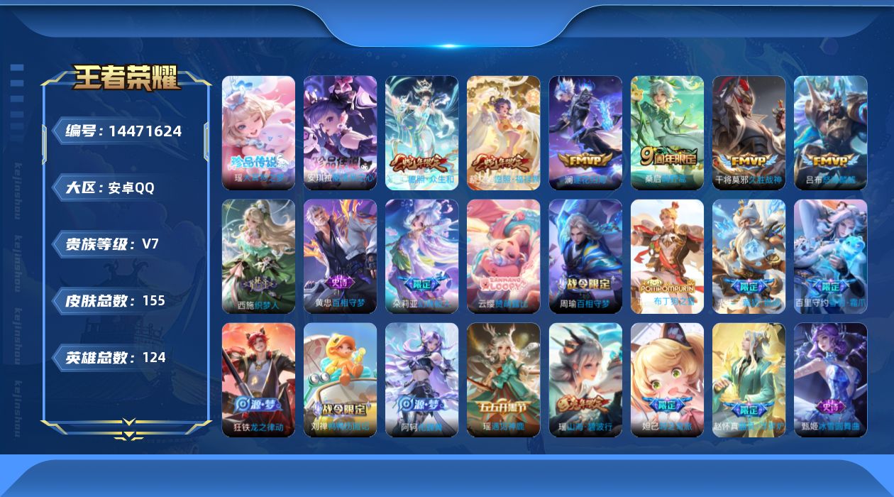 [14471624]按键17女号 积分夺宝 341 安卓q-v7-155皮肤-2珍品传说-6传说-44史诗 【英雄全皮】:空空儿全皮,影全皮 【珍品传说】:瑶大耳狗之梦,安琪拉酷洛米之心 【传说皮肤】:妲己愿照众生和,蔡文姬愿照福禄聚,桑启鸣野蒿,澜逐花归海,吕布怒海麟威,干将莫邪久胜战神 【限定皮肤】:蔡文姬夏日便利店,大乔绒语心约,虞姬夏日便利店,姜子牙天穹之誓,狄仁杰阴阳师,赵云皇家上将,妲己时之奇旅,狄仁杰魔术师,项羽海滩派对,安琪拉魔法小厨娘,裴擒虎擒涛扼浪,瑶山海碧波行,鲁班大师探海日志,张良古海寻踪,鬼谷子天穹祈灯,沈梦溪龙舞盛年,刘邦剑破天穹,周瑜熔金海岸 【年限皮肤】:瑶山海碧波行 【赛季限定】:张良古海寻踪,裴擒虎擒涛扼浪,鲁班大师探海日志,鬼谷子天穹祈灯,刘邦剑破天穹,姜子牙天穹之誓 【战令限定】:蔡文姬夏日便利店,虞姬夏日便利店 【史诗皮肤】:露娜紫霞仙子,赵云皇家上将,貂蝉圣诞恋歌,甄姬冰雪圆舞曲,狄仁杰魔术师,廉颇地狱岩魂,宫本武藏鬼剑武藏,孙尚香水果甜心,妲己魅力维加斯,妲己女仆咖啡,安琪拉魔法小厨娘,小乔缤纷独角兽,雅典娜冰冠公主,安琪拉心灵骇客,刘禅天才门将,李元芳逐浪之夏,阿轲节奏热浪,孙策猫狗日记,大乔猫狗日记,伽罗箭羽风息,大乔白蛇,小乔青蛇,瑶遇见神鹿,孙尚香时之恋人,安琪拉时之奇旅,貂蝉唤灵魅影,妲己时之奇旅,瑶山海碧波行,蔡文姬夏日便利店,孙膑茶境仙,弈星万物之道,赵怀真器灵浮梦炉,芈月瑰影绮梦,阿轲化蝶舞,刘禅鸭鸭历险记,狂铁龙之律动,百里守约雪豹霜爪,老夫子藏狐褐绒,亚瑟布丁狗之誓,周瑜百相守梦,云缨赞萌露比,黄忠百相守梦,朵莉亚幻珠鲛人,西施织梦人 【其他皮肤】:项羽海滩派对,露娜哥特玫瑰,达摩大发明家,赵云忍炎影,芈月红桃皇后,安琪拉玩偶对对碰,姜子牙时尚教父,妲己少女阿狸,亚瑟死亡骑士,达摩拳王,甄姬花好人间,后羿阿尔法小队,狄仁杰阴阳师,王昭君幻想奇妙夜,孙尚香沉稳之力,大乔守护之力,明世隐虹云星官,沈梦溪鲨炮海盗猫,哪吒次元突破,鲁班七号黑桃队长,廉颇无尽征程,杨戬次元傲视,盘古重装意志,鲁班大师乓乓大师,典韦铁甲之心,马可波罗潮玩牛仔,蒙犽胡桃狂想曲,猪八戒潮玩探月行,裴擒虎擒涛扼浪,鲁班大师探海日志,姬小满零食大作战,张良古海寻踪,鬼谷子天穹祈灯,朵莉亚金色潮汐,亚瑟鸿运当头,沈梦溪龙舞盛年,刘邦剑破天穹,姜子牙天穹之誓