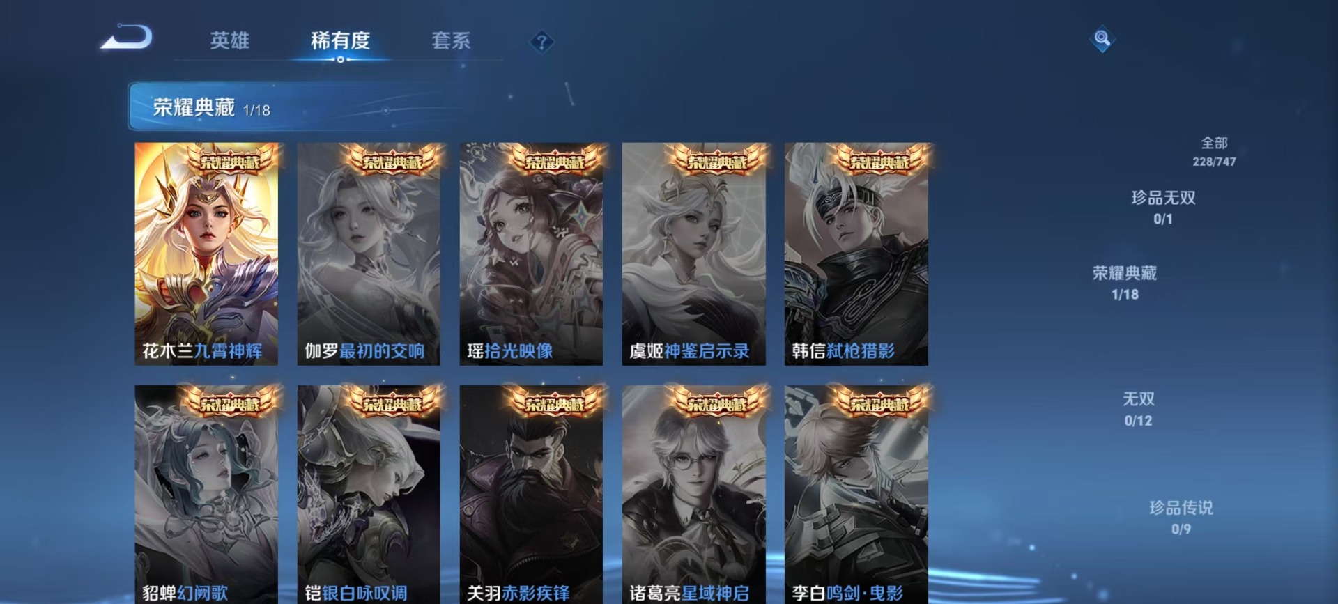 v7 1典藏 11传说 126英雄 228皮肤 可修改实名 【英雄全皮】:蒙恬全皮蚩奼全皮 【稀有英雄】:大司命嬴政始皇帝韩信韩跳跳夏洛特夏师傅艾琳橘右京橘子娜可露露鸟人不知火舞赵云金蝉唐僧戈娅 【荣耀水晶】:九霄神辉木兰典藏 【传说皮】:李