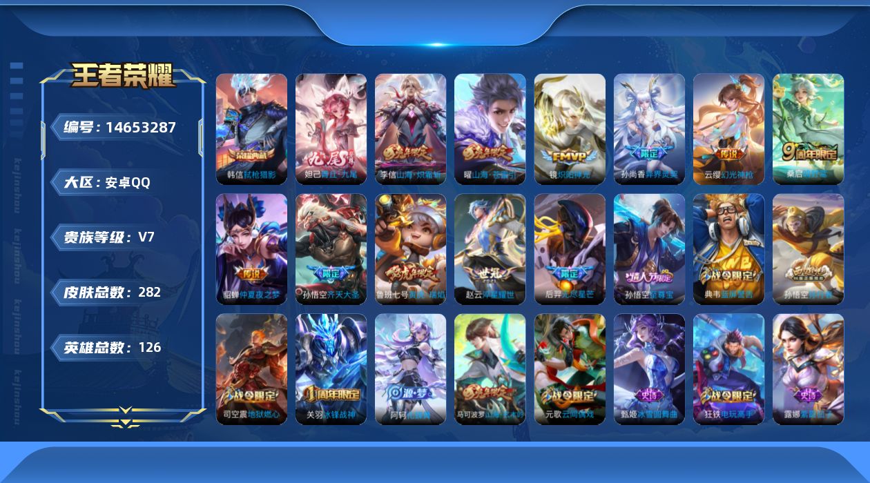 [14653287]v7 1典藏 1无双 11传说 126英雄 282皮肤 可修改实名 【英雄全皮】:蒙恬全皮敖隐全皮钟馗全皮 【稀有英雄】:敖隐小龙人大司命韩信韩跳跳夏洛特夏师傅艾琳橘右京橘子娜可露露鸟人不知火舞赵云金蝉唐僧戈娅 【荣耀水晶】:弑呛猎影韩信典藏 【无双皮】:青丘·九尾妲己无双 【传说皮】:幻光神呛山海·炽霜斩李信年限仲夏夜之梦大飞蛾淬星耀世炽阳神光山海·苍雷引电光曜子青丘·九尾 【珍宝阁皮】:优雅恋人玩趣恶龙 【赛季/战令皮】:噬灭天穹s37古海寻踪s33星界游侠海盐诗旅s30擒涛扼浪s31潮玩骑兵奇幻香踪探海日志s32驭风魔法玲珑珍味流音漫舞顽趣-梦奇地狱燃心剑破天穹s35天穹祈灯s34青焰无极苍威无极天穹之誓s36暖冬·兔眠万华元夜s22演武夺筹s23驱傩正仪s24千军破阵s25朔望之晖蓝屏警告神迹守卫-钟馗云间偶戏星际陆战队-达摩胡桃异想国圣弓游侠真爱魔法火炮绅士沙漠行僧s26幻夜卜梦金庭之子s27电玩高手电玩铁子午后时光大漠名商s28云中旅人s29超时空战士-钟无艳落雪兰心 【史诗皮】:化蝶舞茶境仙怒海争锋蔬乡物语鲁班七号紫霞仙子苍穹之光电玩小子小书包白龙吟黄金分割率特工魅影千年之狐江河有灵高渐离燃音魔法百解令蒙犽蒙恬荣光圣徽冰冠公主青蛇电玩·爆裂旋风暗夜猫娘末日机甲-吕布乱世虎臣节奏热浪女仆咖啡水果甜心绅士熊喵星夜王子心灵骇客时之奇旅-安琪拉功夫厨神暗隐猎兽者幽灵船长鬼剑武藏暗渊魔法心灵战警乐园奇幻夜舞动绿茵纤云弄巧拒霜思缤纷独角兽乘风破浪逐浪之夏水晶猎龙者曙光守护者箭羽风息金属风暴原初追逐者圣诞狂欢鹰眼统帅王者之锤魅力维加斯无心未来纪元-赵云 【限定皮】:逐霄战戟鸣野蒿至尊宝异界灵契白毛香高山流水齐天大圣五谷丰年冰锋战神梁祝李小龙如梦令-后羿孙行者乒乒小将美猴王寅虎·瑞焰虎皮蛋子无尽星芒山海·玄木吟马可年限 【普通皮】:熔金海岸苍林狼骑访茗客铁骨偃魂谧流熔炉雾都夜