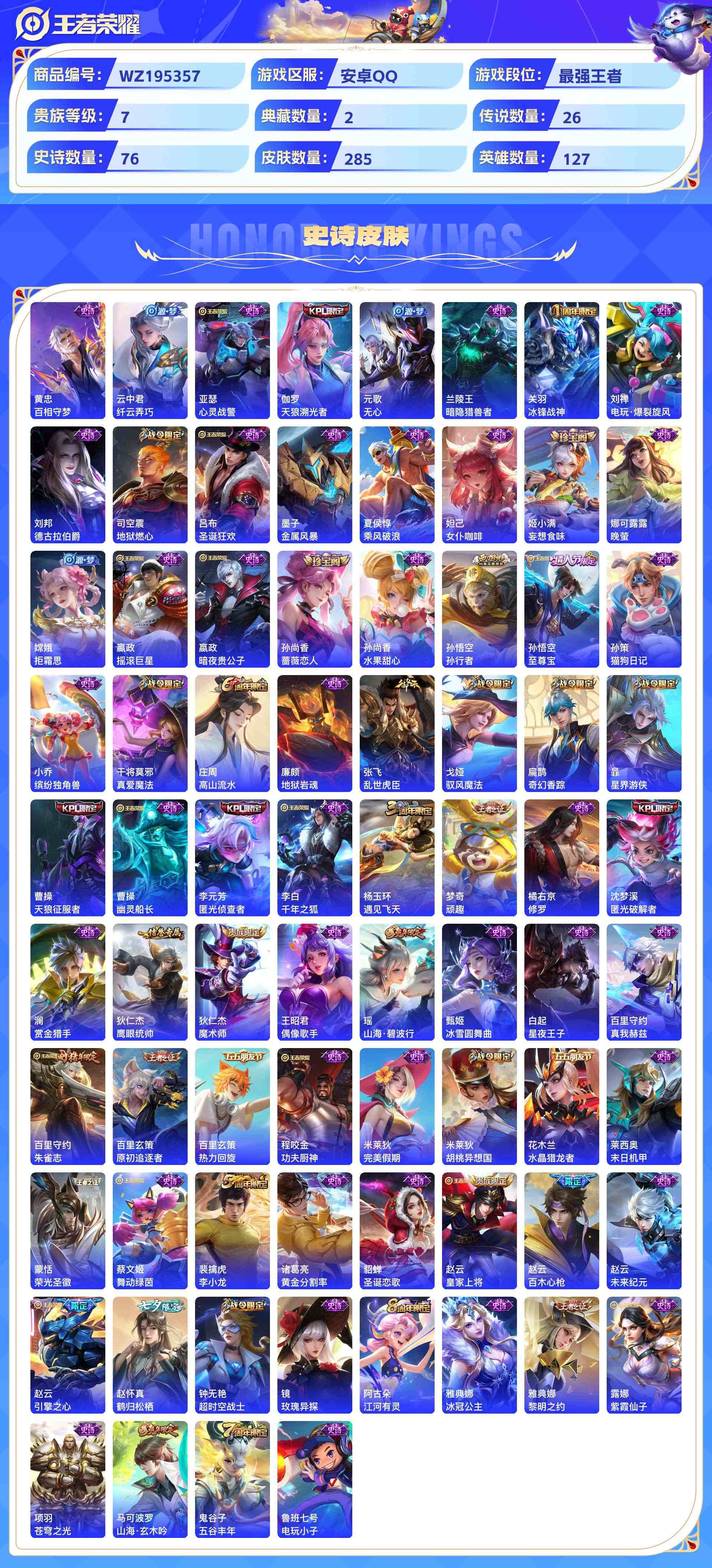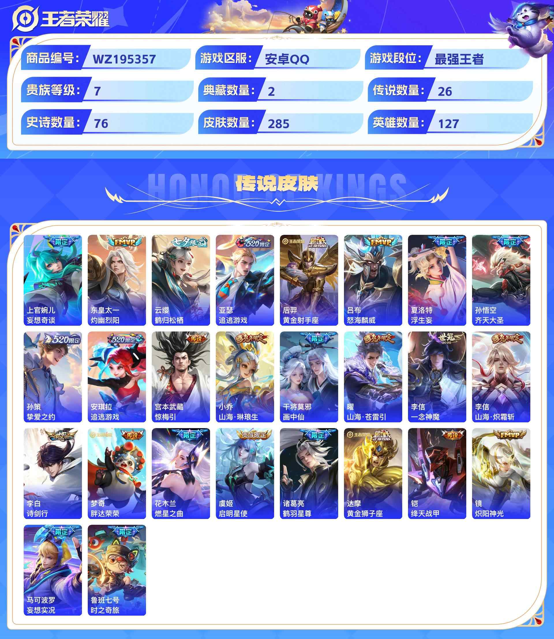 wz195357|极品国标号可二次安卓qq 贵族7级 5金标(橘右京 诸葛亮 凯 云中君 赵云)1小国标(达摩)285皮 2典藏 (幻阙歌弑呛猎影)26传说(妄想奇谈灼幽烈阳鹤归松栖) 76史诗1星传说6个性按键