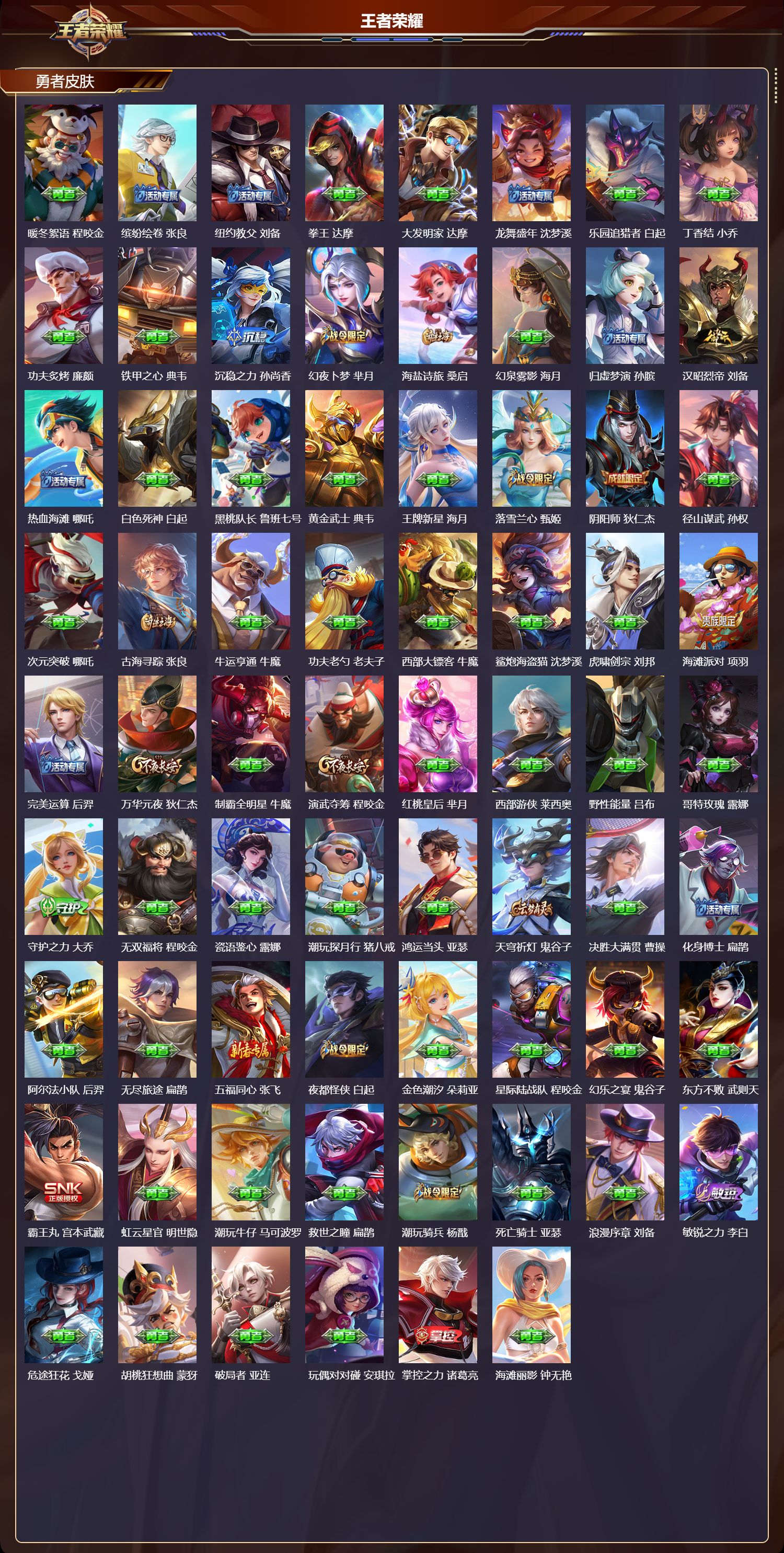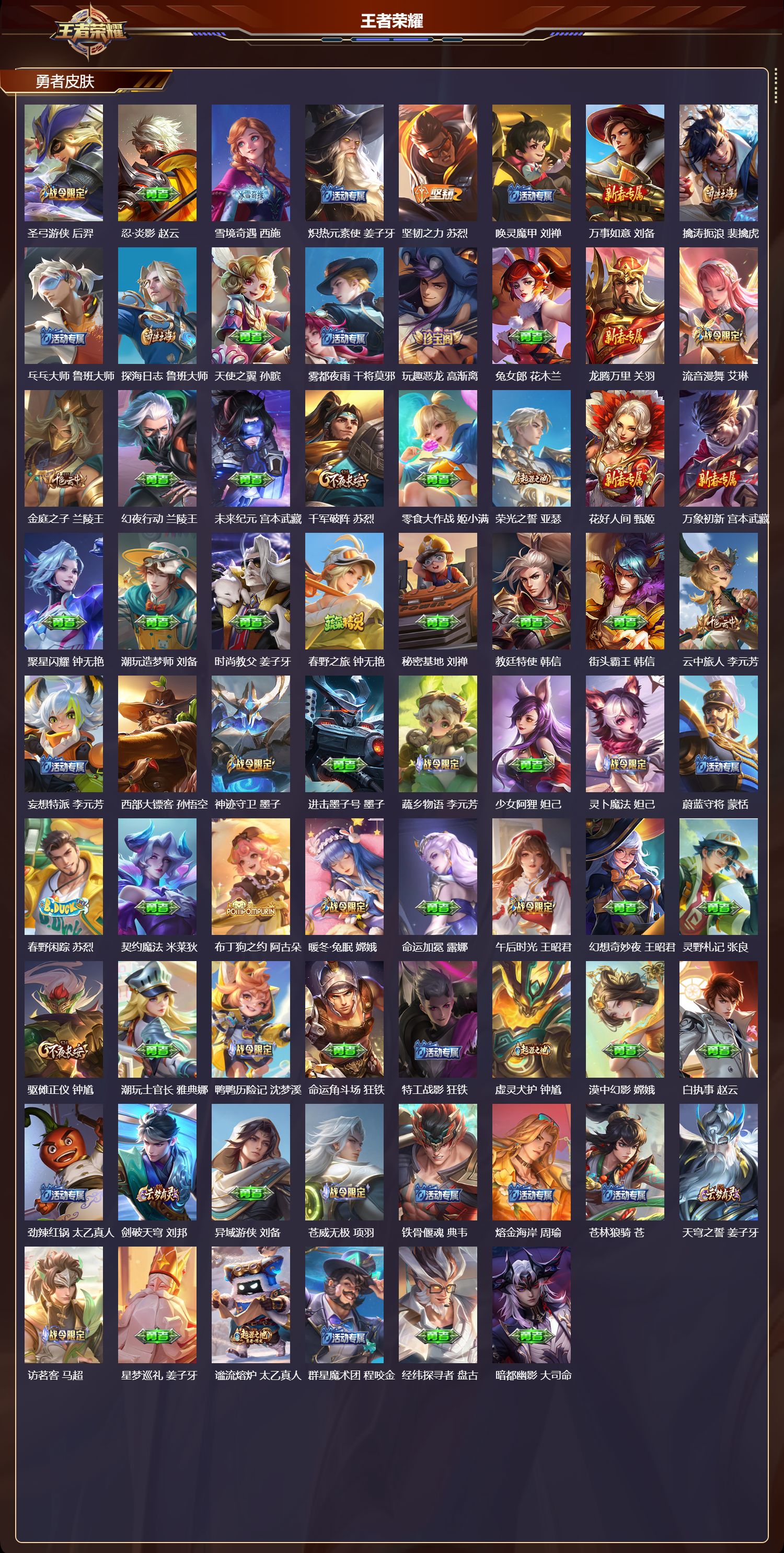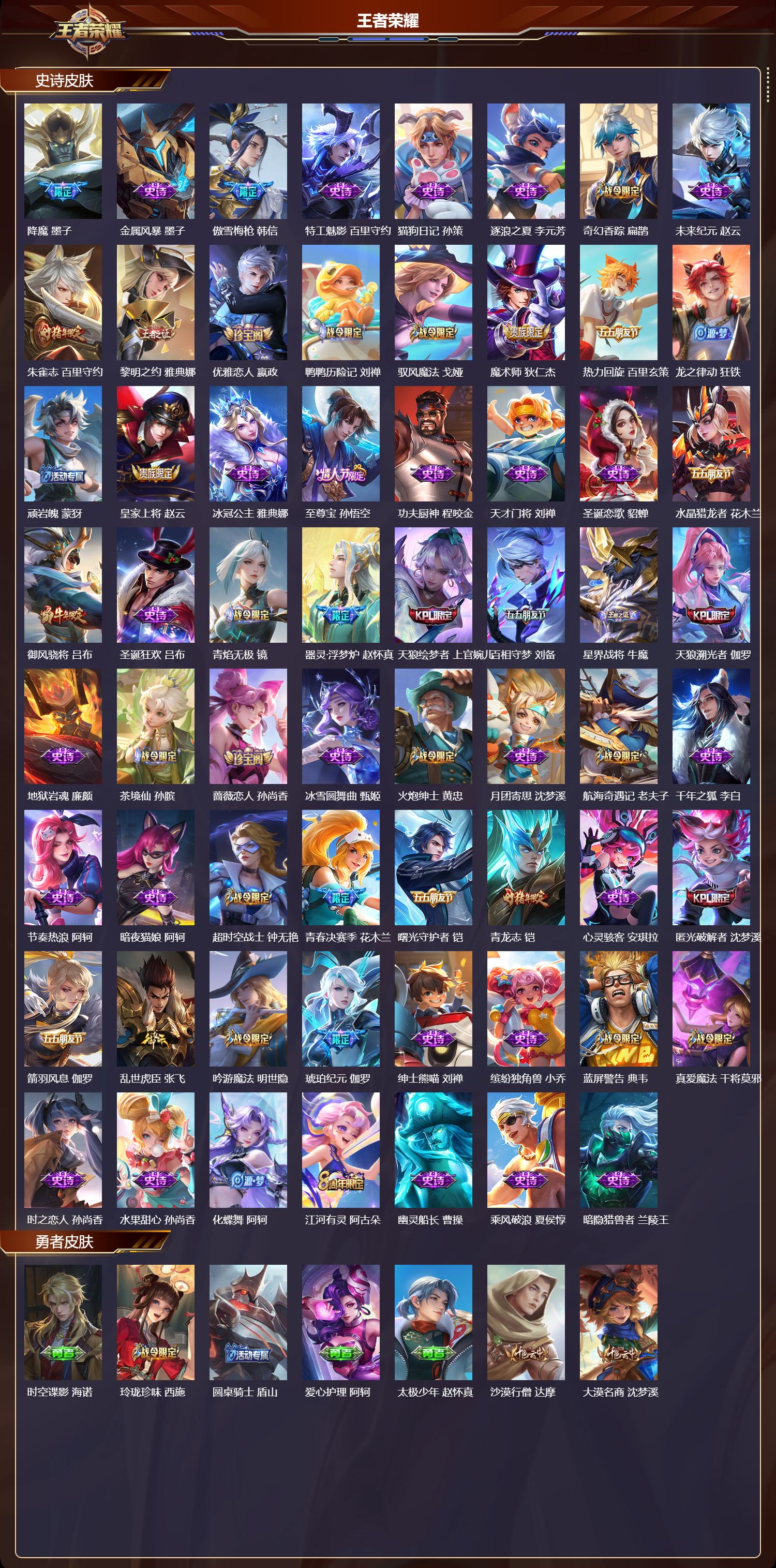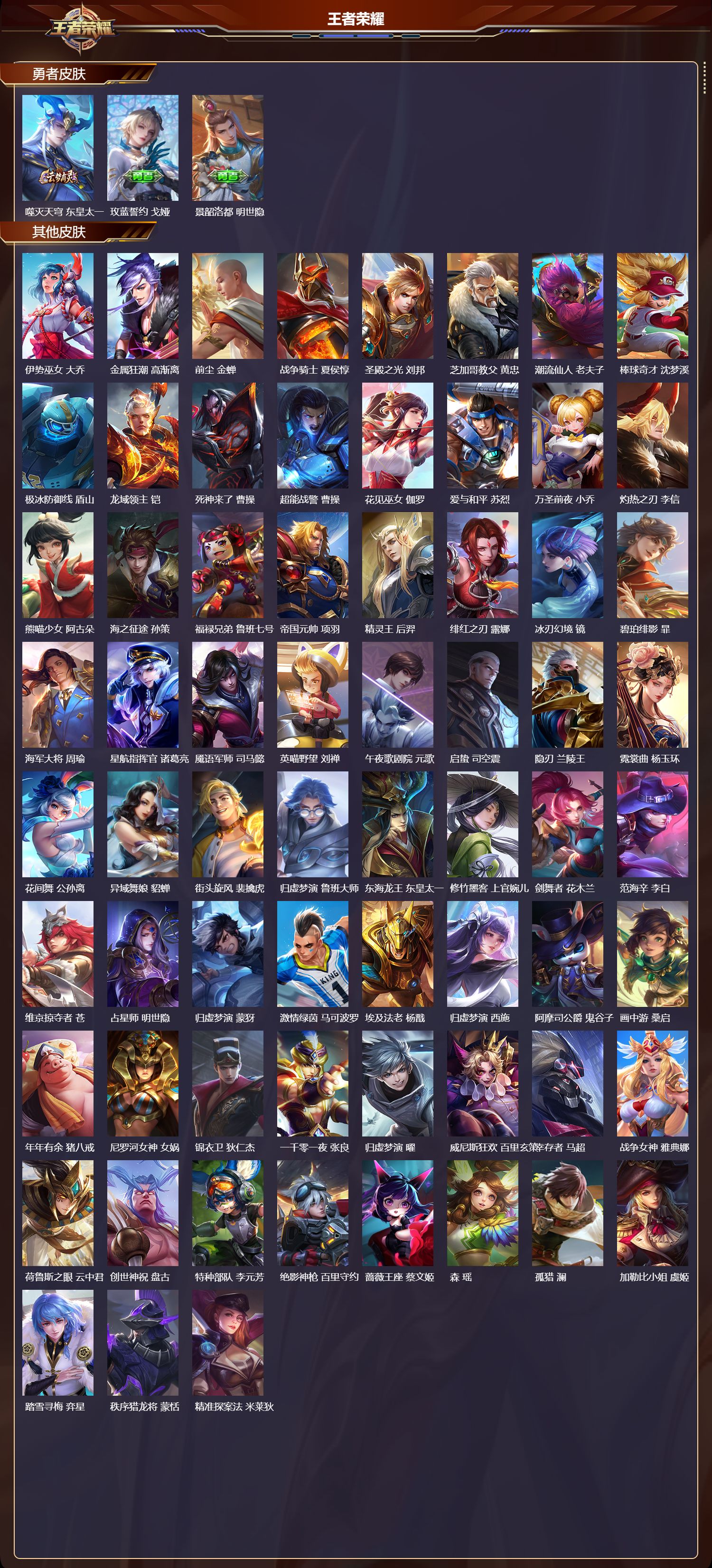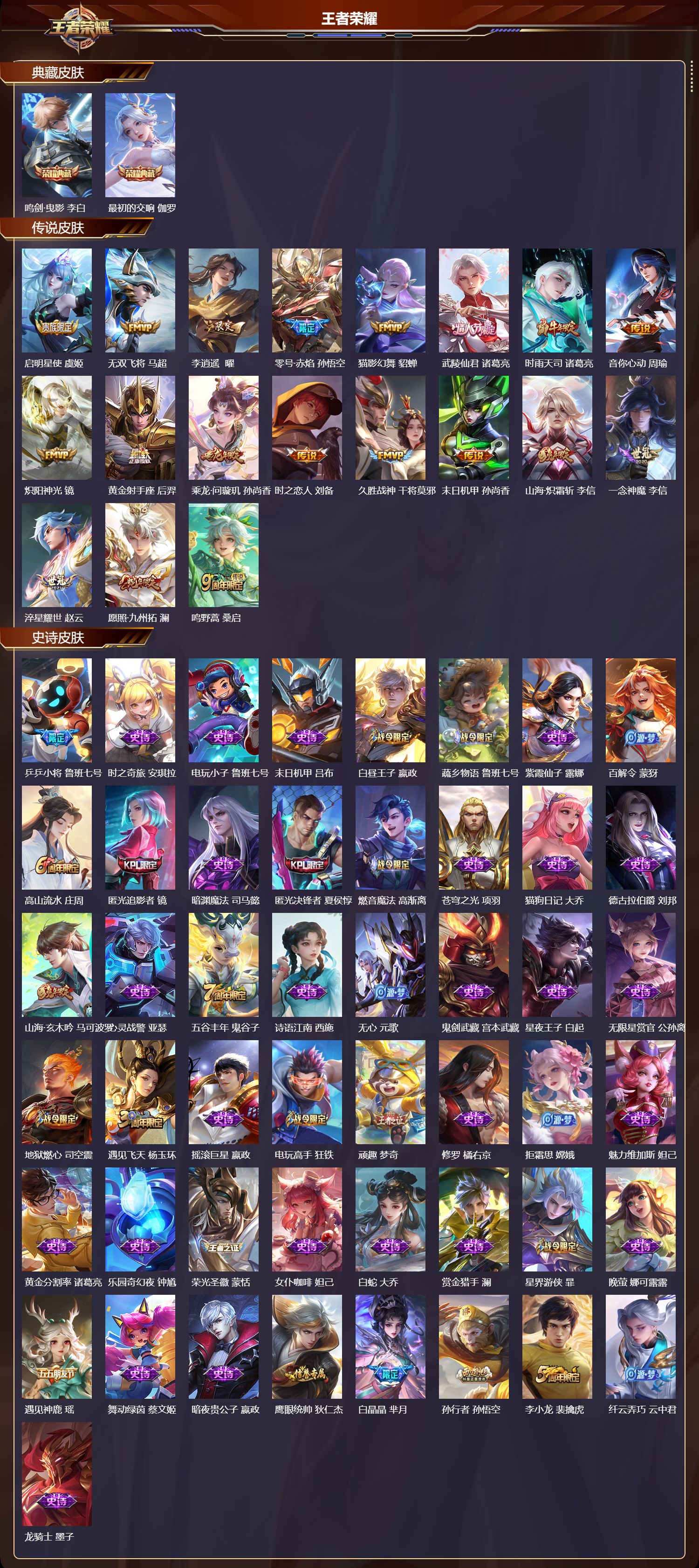 安卓qq/至尊星耀/358皮肤/127英雄/2典藏/0珍品无双/0无双/0珍品传说/19传说/112史诗/9稀有英雄【2 典藏皮肤】鸣剑·曳影 李白最初的交响 伽罗【19 传说皮肤】启明星使 虞姬无双飞将 马超李 曜零号·赤焰 孙悟空猫影幻舞 貂蝉武陵仙君 诸葛亮时雨天司 诸葛亮音你心动 周瑜炽阳神光 镜黄金射手座 后羿乘龙·问璇玑 孙尚香时之恋