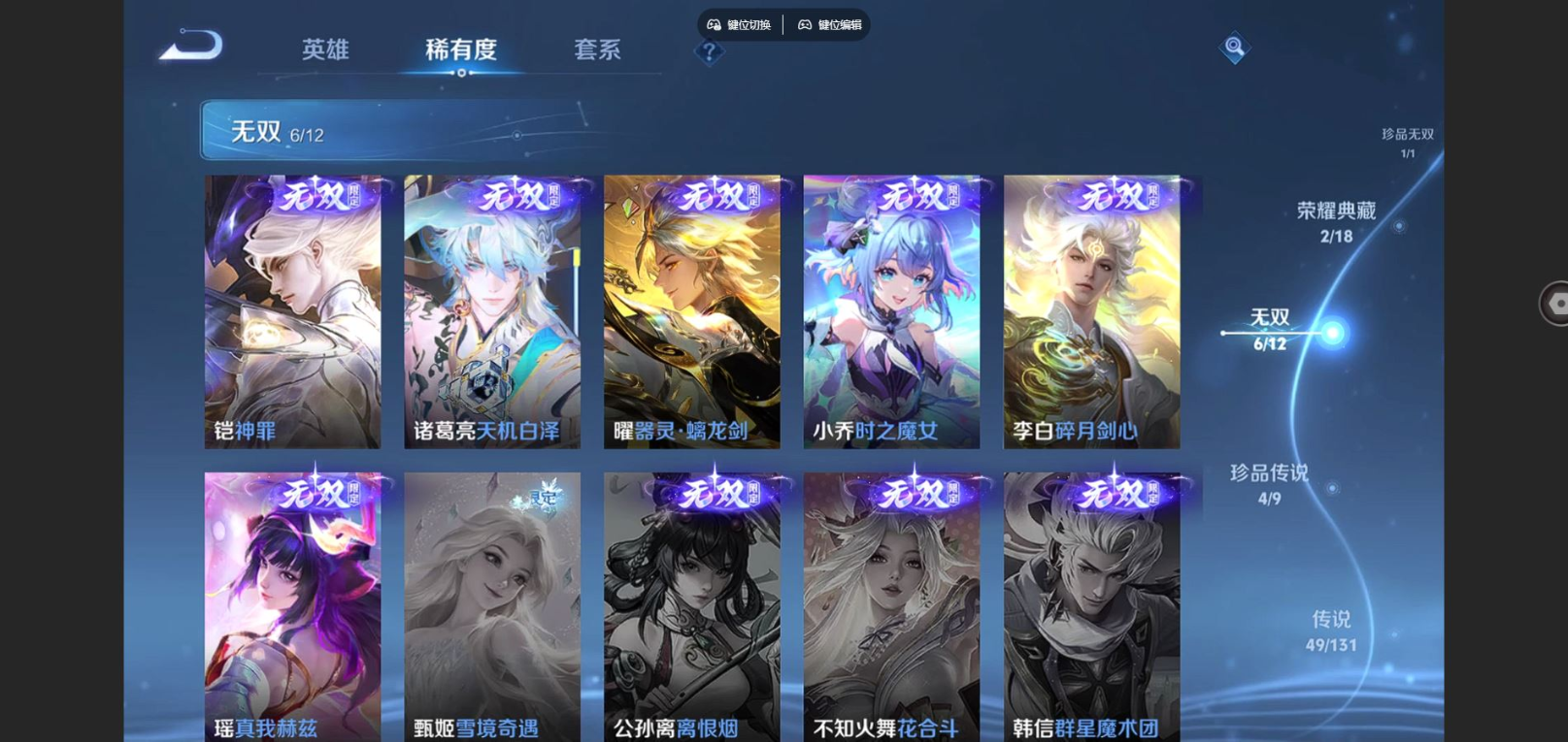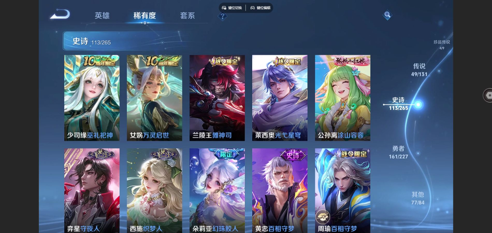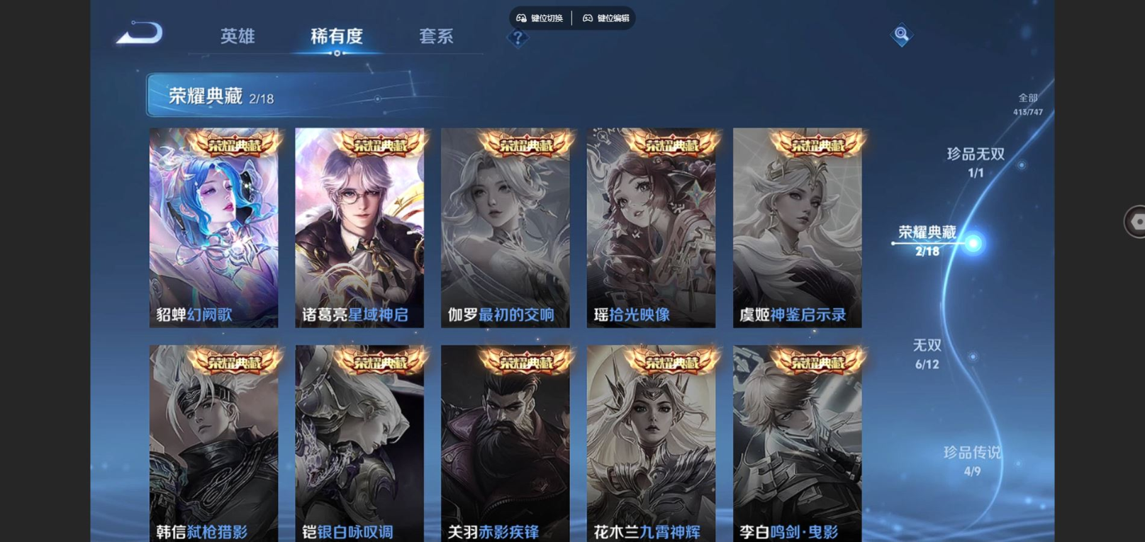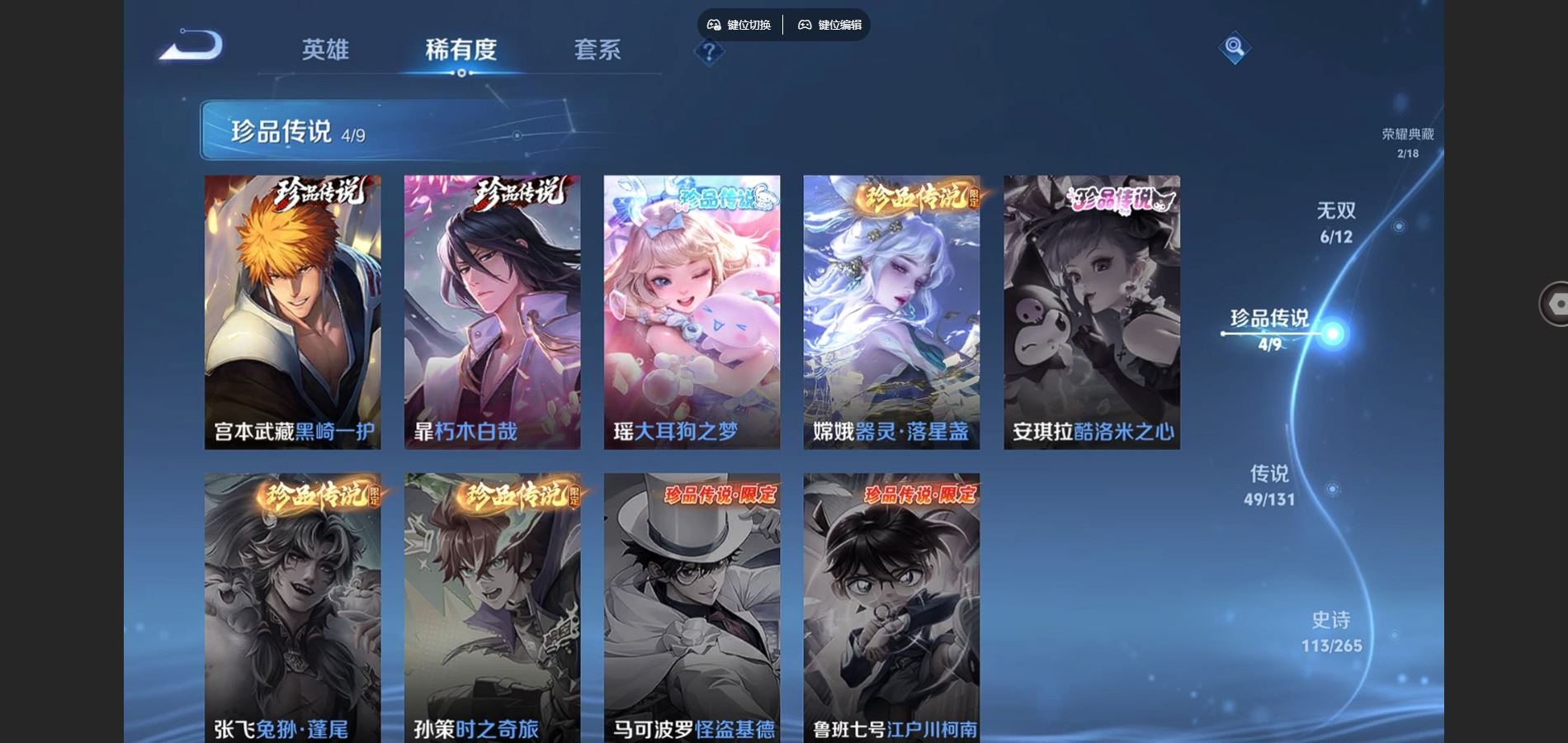 2310038-125英雄-413皮肤-v10-413皮肤2典藏1珍品无双6无双4珍品传说49传说 打野33段 对抗路31段 万战大司命 3星传说 时之思念 幽冥之眼 黛羽霜翎 【典藏】 星域神启 幻阙歌 【珍品无双】 馥梦繁花 【无双】 神罪 天机白泽 器灵螭龙剑 时之魔女 碎月剑心 真我赫兹瑶 【珍品传说】 朽木白哉 黑崎一护 大耳狗之梦 器灵落星盏 【传说】 落雪白狼 逐花归海 觅芳踪