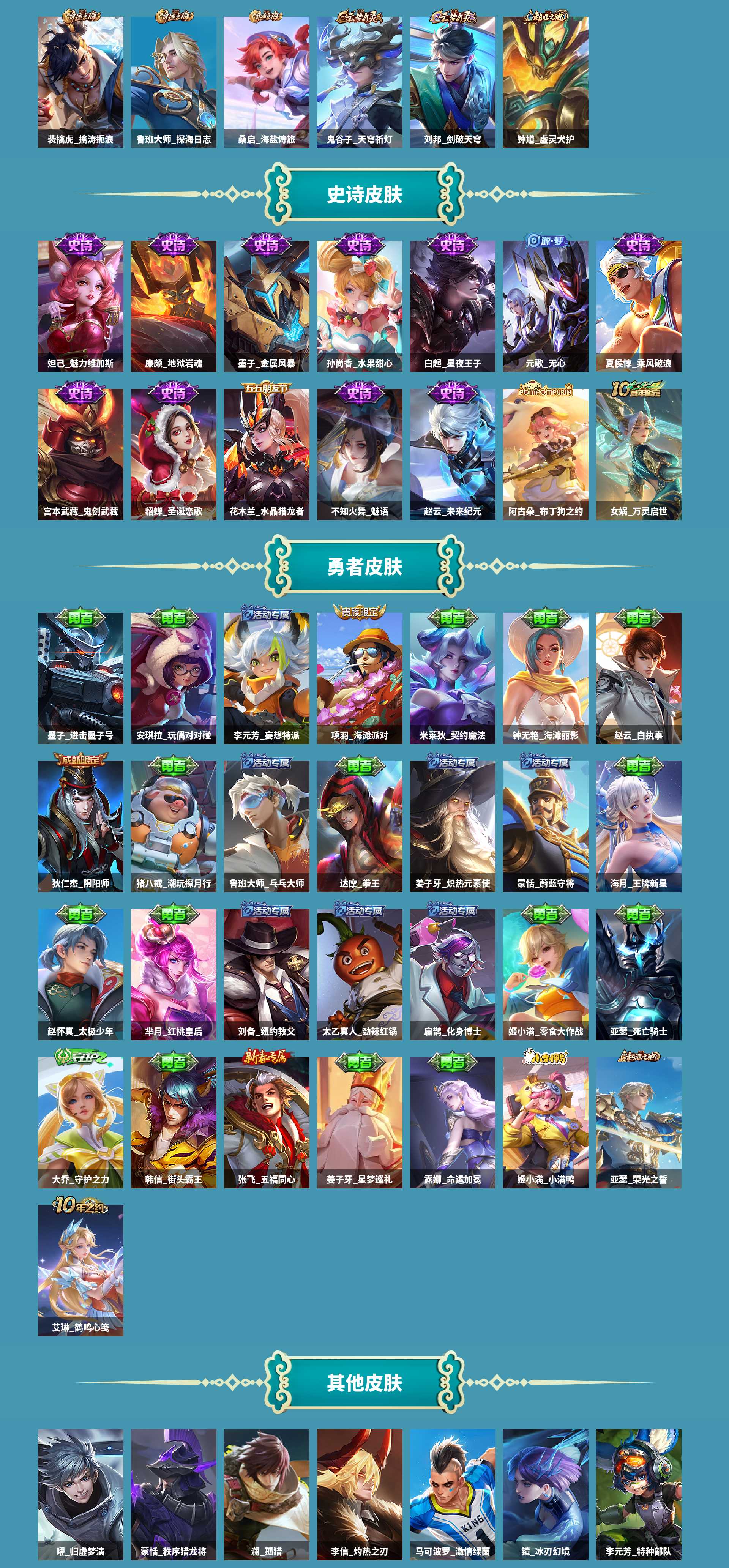 al639154 【万战韩信-1典藏野王带妹数据号-孙悟空全息碎影 百里守约朱雀志 宫本武藏地狱之眼,曜云鹰飞将】 皮肤数85 皮肤价值76368 传说皮肤数2 史诗皮肤数20 英雄数103 营地id1844375907 贵族等级【文本】贵族4级 【贵族4级】 荣耀典藏1 内测皮肤1 年限皮肤1 限定皮肤24 赛季限定14 史诗皮肤21 勇者皮肤42 其他皮肤19 荣耀典藏:孙悟空全息碎影; 内测皮肤:嬴政优雅恋人; 年限皮肤:百里守约朱雀志; 限定皮肤:姬小满小满鸭,钟馗虚灵犬护,刘邦剑破天穹,鬼谷子天穹祈灯,张良古海寻踪,嬴政优雅恋人,鲁班大师探海日志,裴擒虎擒涛扼浪,桑启海盐诗旅,元歌无心,鬼谷子五谷丰年,李元芳云中旅人,赵云皇家上将,百里守约朱雀志,沈梦溪大漠名商,项羽海滩派对,兰陵王金庭之子,达摩沙漠行僧,嫦娥拒霜思,狄仁杰鹰眼统帅,杨玉环遇见飞天,苏烈千军破阵,钟馗驱傩正仪,狄仁杰阴阳师; 赛季限定:亚瑟荣光之誓,钟馗虚灵犬护,刘邦剑破天穹,鬼谷子天穹祈灯,张良古海寻踪,鲁班大师探海日志,裴擒虎擒涛扼浪,桑启海盐诗旅,李元芳云中旅人,沈梦溪大漠名商,兰陵王金庭之子,达摩沙漠行僧,苏烈千军破阵,钟馗驱傩正仪; 史诗皮肤:女娲万灵启世,孙尚香水果甜心,夏侯惇乘风破浪,阿古朵_布丁狗之约,白起星夜王子,不知火舞魅语,赵云未来纪元,嬴政优雅恋人,元歌无心,廉颇地狱岩魂,鬼谷子五谷丰年,赵云皇家上将,百里守约朱雀志,宫本武藏鬼剑武藏,墨子金属风暴,嫦娥拒霜思,狄仁杰鹰眼统帅,杨玉环遇见飞天,貂蝉圣诞恋歌,花木兰水晶猎龙者,妲己魅力维加斯; 勇者皮肤:艾琳鹤鸣心笺,亚瑟荣光之誓,达摩拳王,姬小满小满鸭,姜子牙星梦巡礼,露娜命运加冕,钟馗虚灵犬护,猪八戒潮玩探月行,刘邦剑破天穹,鬼谷子天穹祈灯,张良古海寻踪,海月王牌新星,张飞五福同心,李元芳妄想特派,鲁班大师探海日志,姬小满零食大作战,太乙真人劲辣红锅,裴擒虎擒涛扼浪,大乔守护之力,赵怀真太极少年,蒙恬蔚蓝守将,桑启海盐诗旅,李元芳云中旅人,钟无艳海滩丽影,安琪拉玩偶对对碰,刘备纽约教父,芈月红桃皇后,墨子进击墨子号,沈梦溪大漠名商,米莱狄契约魔法,项羽海滩派对,赵云白执事,扁鹊化身博士,兰陵王金庭之子,达摩沙漠行僧,苏烈千军破阵,姜子牙炽热元素使,鲁班大师乓乓大师,钟馗驱傩正仪,韩信街头霸王,狄仁杰阴阳师,亚瑟死亡骑士; 其他皮肤:曜归虚梦演,小乔万圣前夜,瑶森,李信灼热之刃,关羽天启骑士,马超幸存者,蒙恬秩序猎龙将,女娲尼罗河女神,镜冰刃幻境,司空震启蛰,马可波罗激情绿茵,澜孤猎,元歌午夜歌剧院,百里玄策威尼斯狂欢,百里守约绝影神呛,金蝉前尘,弈星踏雪寻梅,李元芳特种部队,云缨赤焰之缨;