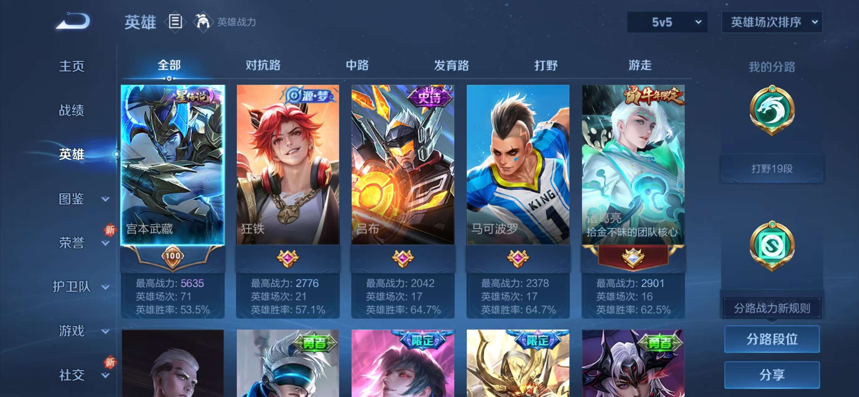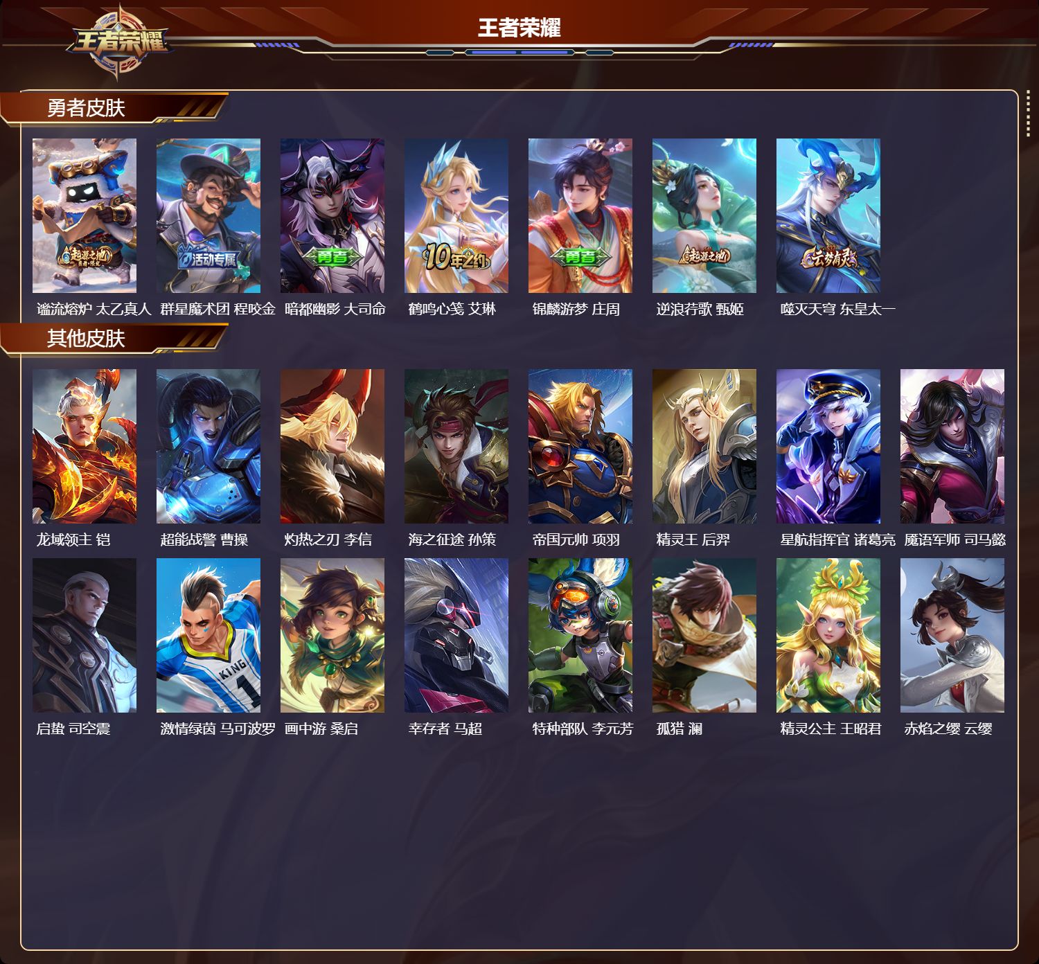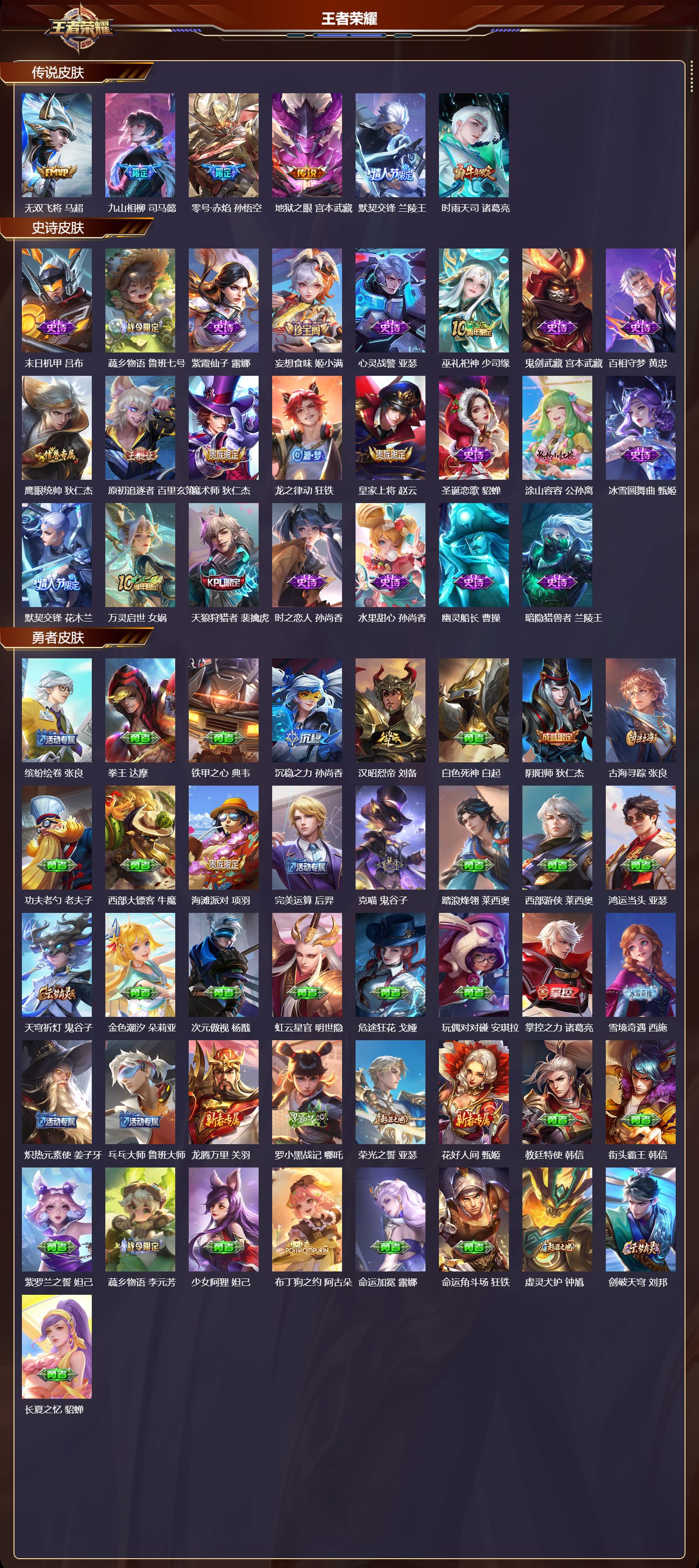 安卓qq/荣耀王者/94皮肤/119英雄/0典藏/0珍品无双/0无双/0珍品传说/6传说/23史诗/7稀有英雄【6 传说皮肤】无双飞将 马超九山相柳 司马懿零号·赤焰 孙悟空地狱之眼 宫本武藏默契交锋 兰陵王时雨天司 诸葛亮【23 史诗皮肤】末日机甲 吕布蔬乡物语 鲁班七号紫霞仙子 露娜妄想食味 姬小满心灵战警 亚瑟巫礼祀神 少司缘鬼剑武藏 宫本武藏百