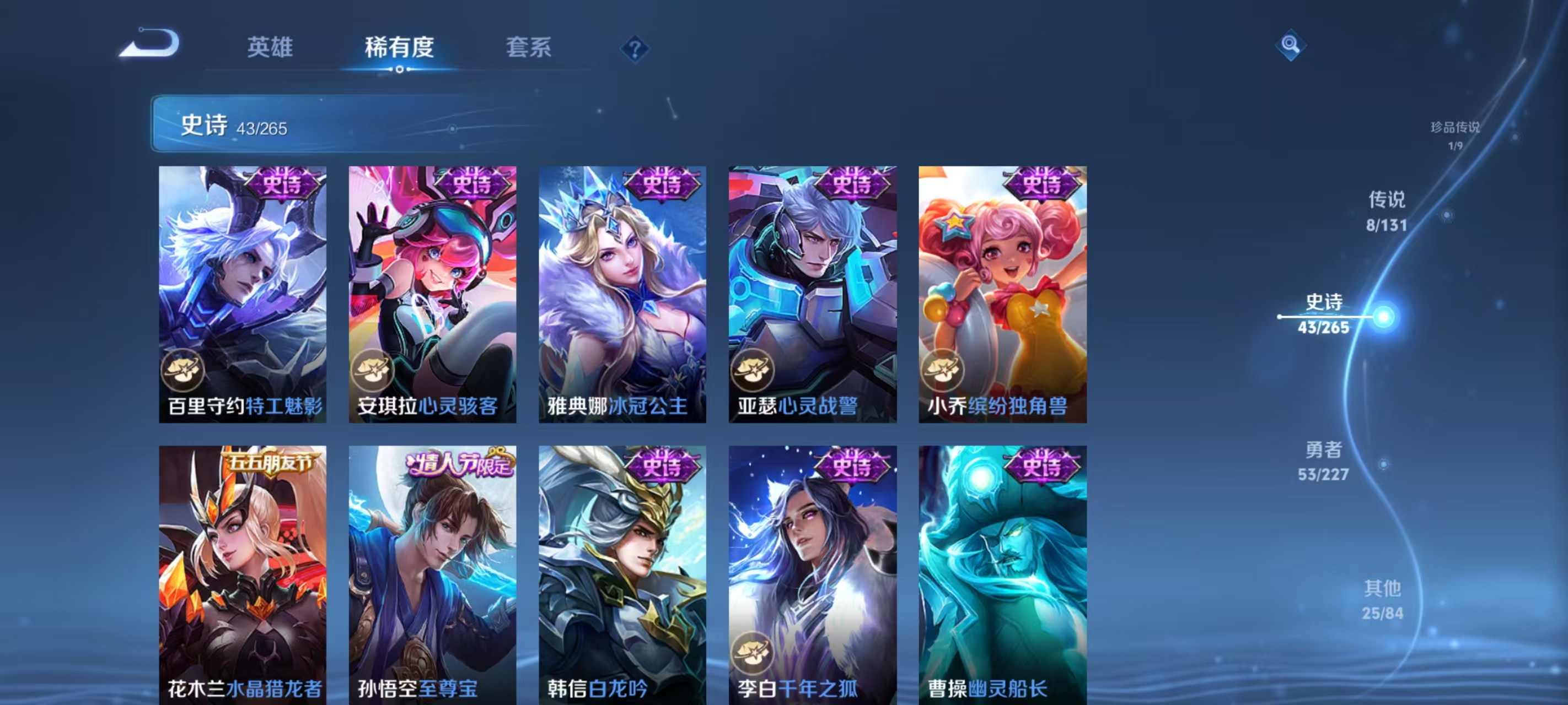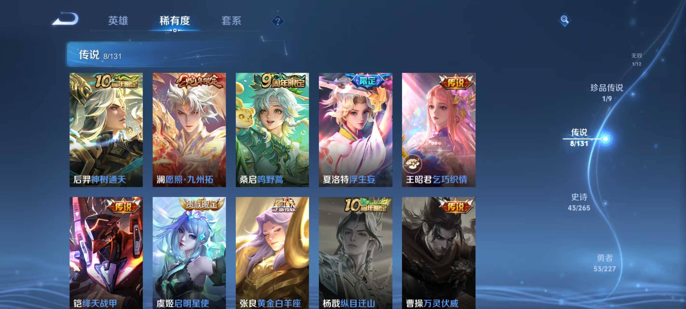 国标打野 小国标韩信12121战力 1无双1典藏1珍品 8传说 群星魔术团 弑呛猎影 怪盗基德 神树通天,乞巧织情,鸣野蒿,浮生妄,绛天战甲,启明星使,黄金白羊座,愿照·九州拓