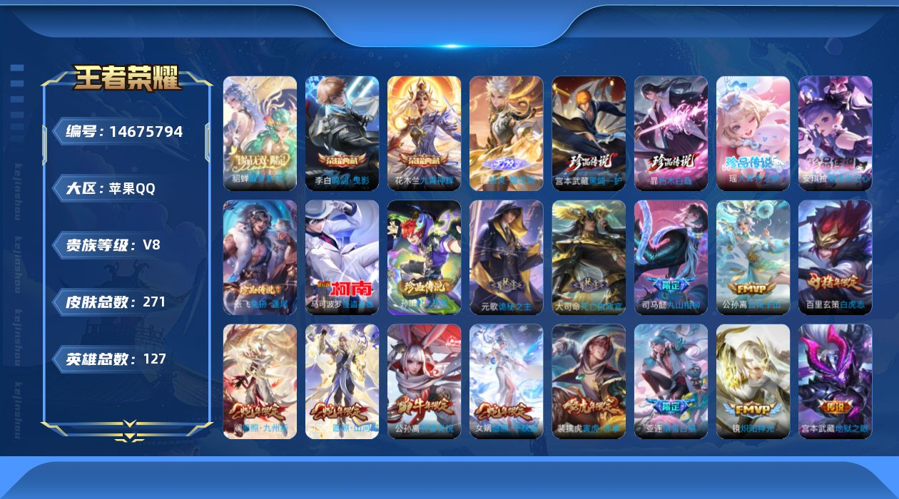 [14675794]可二次 苹果手q131区271皮2典藏30传说1无双7珍品传说1珍品无双v8 营地id2137794373最强王者【珍品传说皮肤】:朽木白哉黑崎一护大耳狗之梦酷洛米之心兔狲·蓬尾时之奇旅怪盗基德【珍品无双皮肤】:馥梦繁花【无双皮肤】:器灵·螭龙剑【荣耀典藏】:九霄神辉鸣剑·曳影【优质限定皮肤】:至尊宝白虎志祈雪灵祝【传说皮肤】:神树通天诡秘之主死亡执政