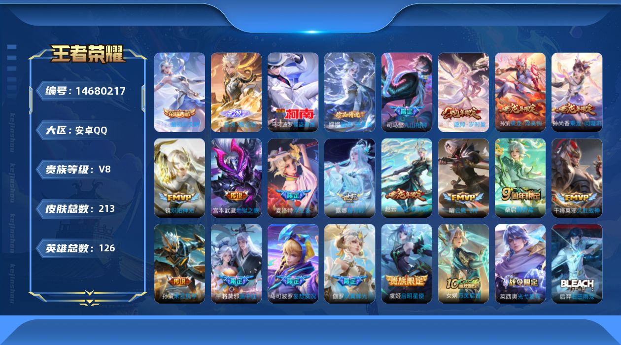 [14680217]贵族8-213皮-1典藏-18传说-1无双-2珍品传说-珍品无双0 全皮6-改名卡11-灵宝改名卡1-星传说幽冥之眼 安卓手q404区213皮1典藏18传说1无双2珍品传说v8 营地id1739599756无双王者【珍品传说皮肤】:怪盗基德器灵·落星盏【无双皮肤】:器灵·螭龙剑【荣耀典藏】:最初的交响【传说皮肤】:启明星使神树通天九山相柳乘龙·淬吴钩乘龙·铭钟鼎
