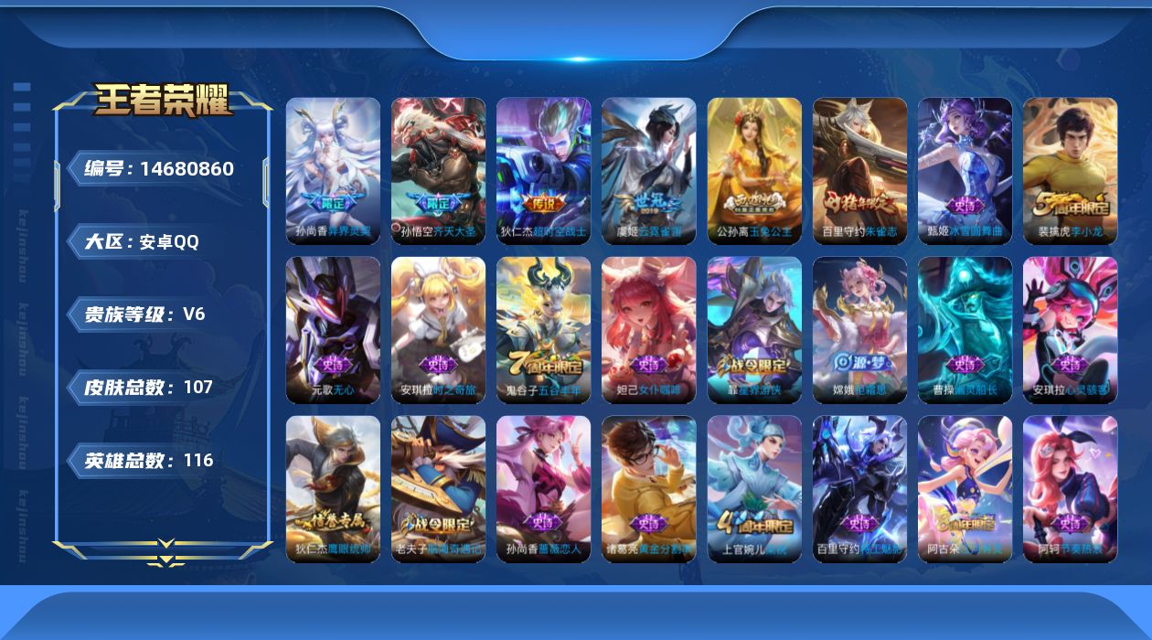 [14680860]v6 4传说 116英雄 107皮肤 可修改实名 【稀有英雄】:大司命韩信韩跳跳夏洛特夏师傅艾琳橘右京橘子娜可露露鸟人不知火舞赵云金蝉唐僧戈娅 【传说皮】:云霓雀翎超时空战士-狄仁杰 【珍宝阁皮】:蔷薇恋人 【赛季/战令皮】:古海寻踪s33星界游侠海盐诗旅s30擒涛扼浪s31探海日志s32天穹祈灯s34暖冬·兔眠醍醐杖s20原初探秘者s21万华元夜s22驱傩正仪s24千军破阵s25神迹守卫-墨子航海奇遇记圣弓游侠真爱魔法火炮绅士沙漠行僧s26幻夜卜梦金庭之子s27大漠名商s28云中旅人s29 【史诗皮】:黄金分割率特工魅影江河有灵节奏热浪女仆咖啡水果甜心天才门将心灵骇客时之奇旅-安琪拉暗隐猎兽者幽灵船长心灵战警拒霜思逐浪之夏圣诞恋歌鹰眼统帅魅力维加斯无心 【限定皮】:异界灵契白毛香高山流水齐天大圣五谷丰年梁祝李小龙朱雀志守约年限玉兔公主 【普通皮】:神迹守卫刘邦虎啸剑宗暗都幽影太极少年鬼谷子天穹祈灯s34时空谍影胡桃狂想曲五福同心花好人间归虚梦演-鲁班大师归虚梦演-西施海滩丽影海滩派对皇家上将魔术师沉稳之力守护之力缤纷绘卷乓乓大师次元突破功夫老勺教廷特使阴阳师死亡骑士少女阿狸秘密基地救世之瞳冰雪圆舞曲拳王圣弓游侠玩偶对对碰瓷语鉴心制霸全明星幻乐之宴虹云星官孤猎灼热之刃幸存者剑舞者冰刃幻境花见巫女地府判官蔷薇王座异域舞娘星航指挥官加勒比小姐赤焰之缨森午夜歌剧院绝影神呛阿摩司公爵木偶奇遇记精灵公主锦衣卫超能战警英喵野望潮玩牛仔虎啸剑宗幻泉雾影-海月牛运亨通