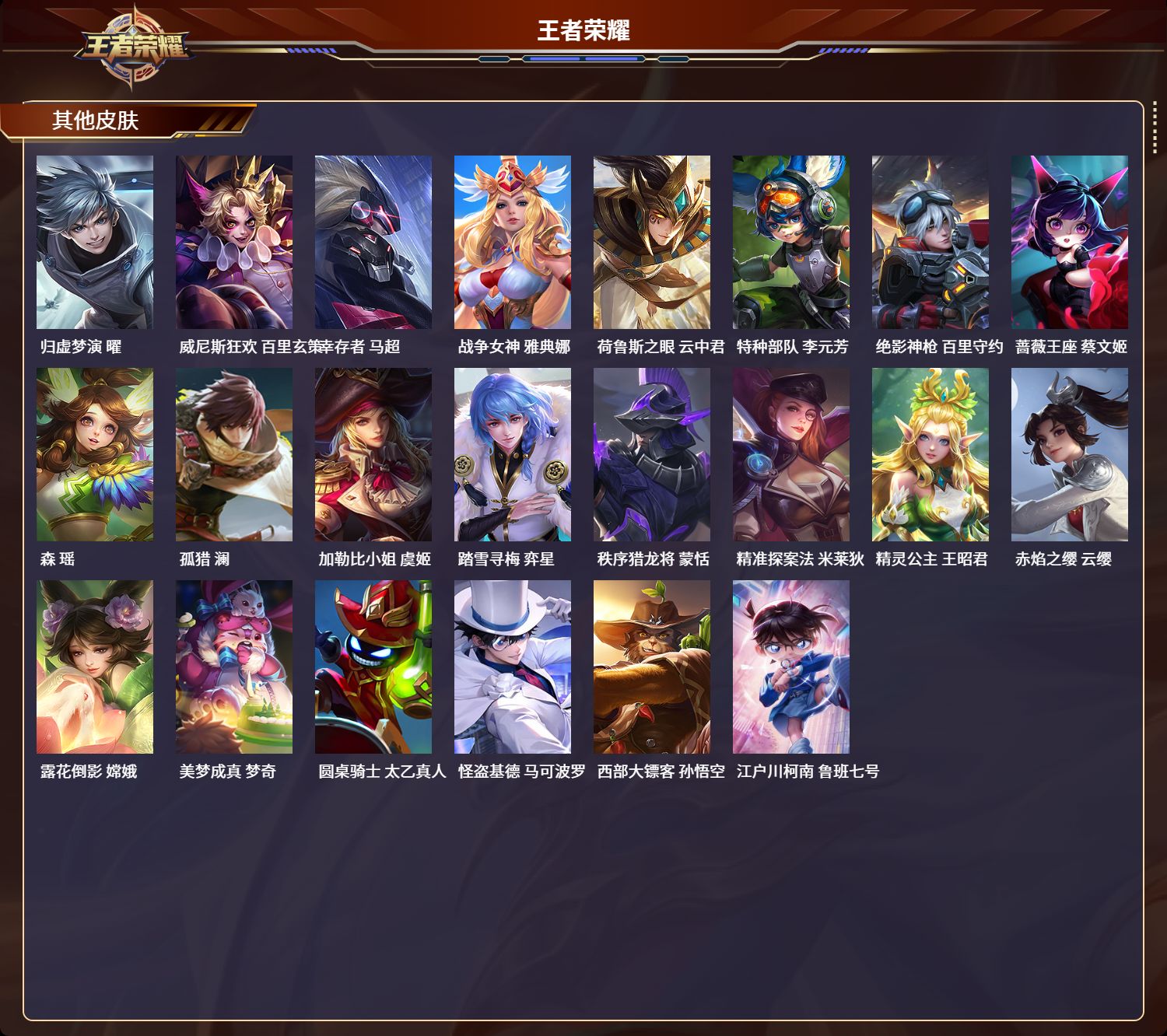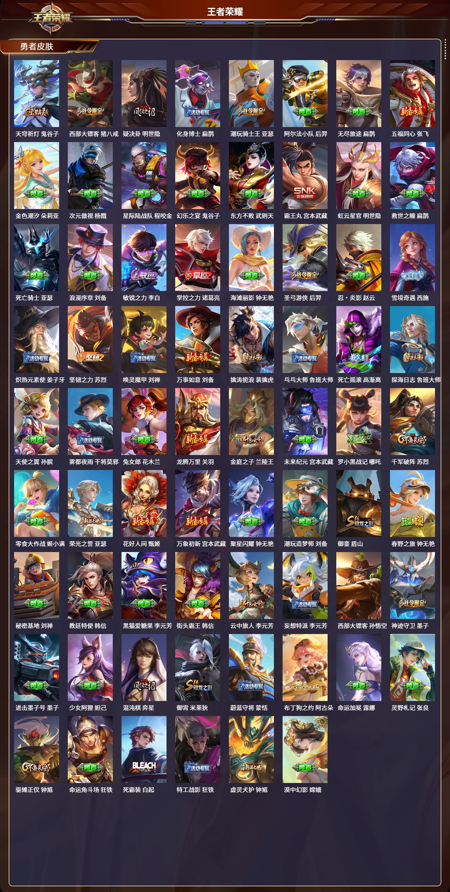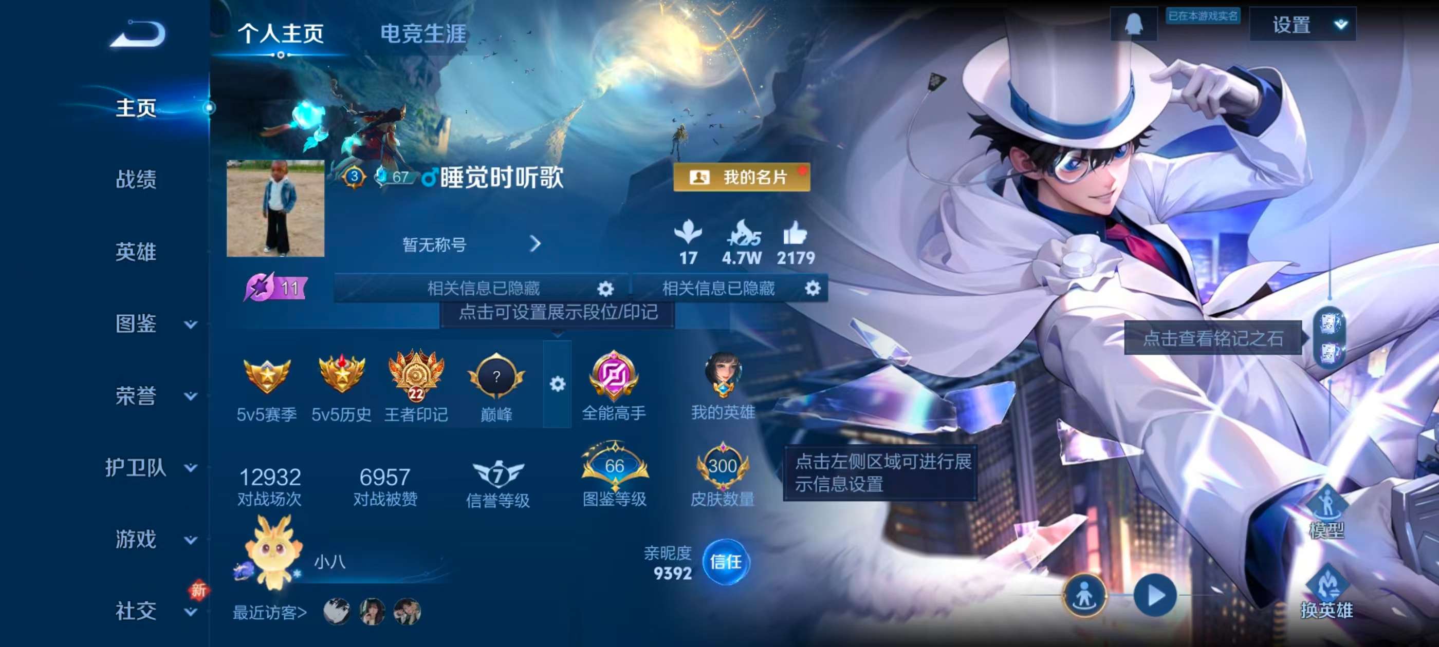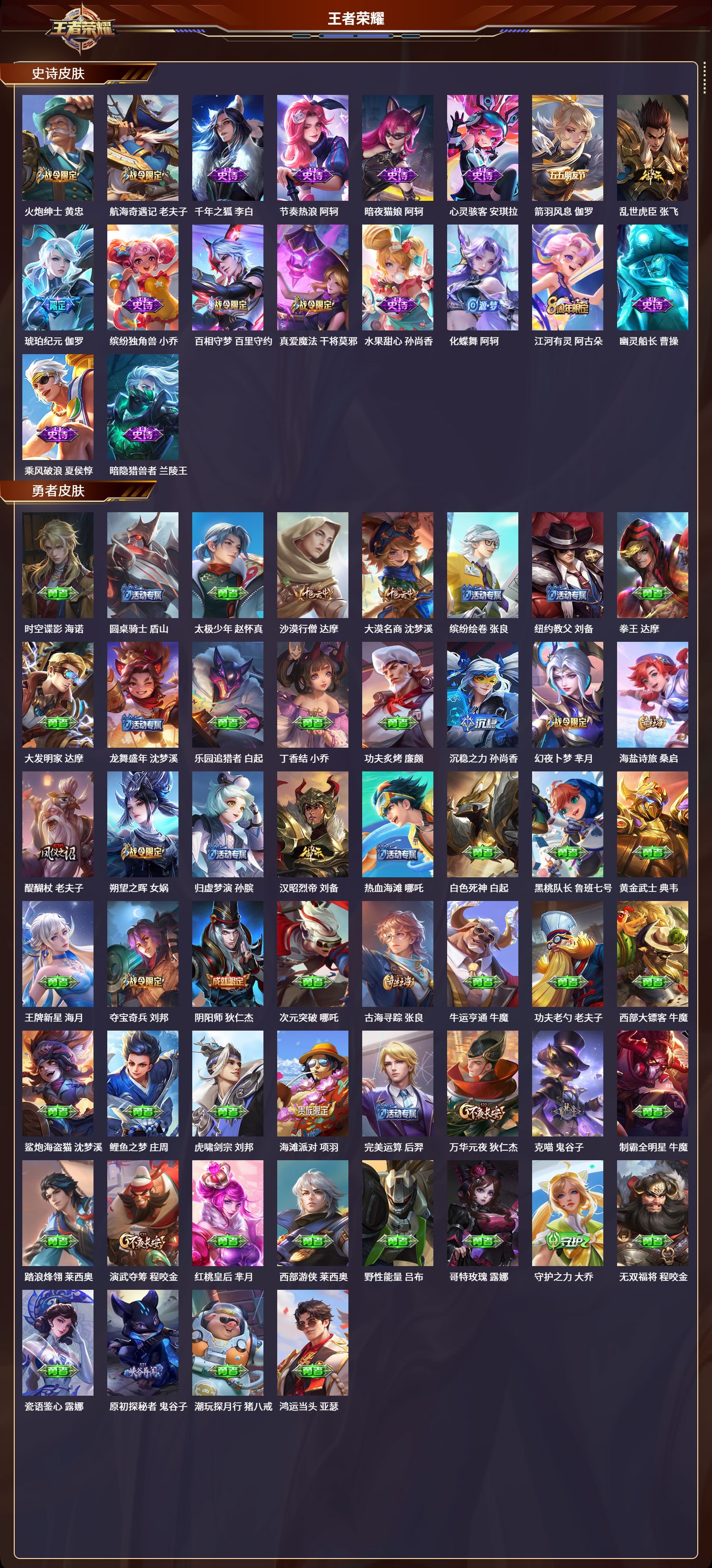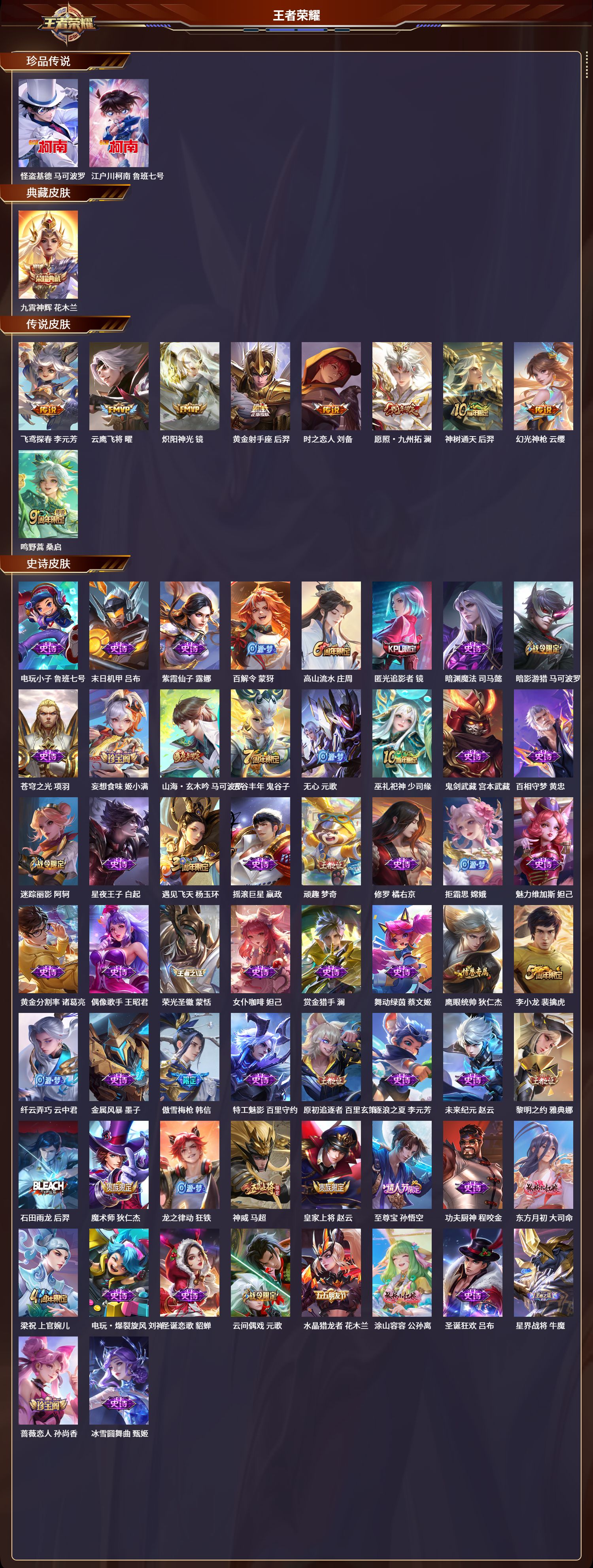 安卓qq/最强王者/300皮肤/123英雄/1典藏/0珍品无双/0无双/2珍品传说/9传说/76史诗/7稀有英雄【2 珍品传说】怪盗基德 马可波罗江户川柯南 鲁班七号【1 典藏皮肤】九霄神辉 花木兰【9 传说皮肤】飞鸢探春 李元芳云鹰飞将 曜炽阳神光 镜黄金射手座 后羿时之恋人 刘备愿照·九州拓 澜神树通天 后羿幻光神呛 云缨鸣野蒿 桑启【76 史诗皮肤