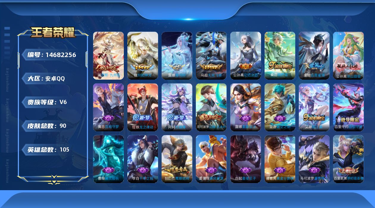 [14682256]v6105英雄-90皮肤-7传说-27史诗 sy1002 【传说皮肤】:澜愿照九州拓,桑启鸣野蒿,露娜霜月吟,公孙离记忆之芯,马超无双飞将,镜炽阳神光,虞姬云霓雀翎 【限定皮肤】:姜子牙天穹之誓,狄仁杰阴阳师,赵云皇家上将,马可波罗山海玄木吟,狄仁杰魔术师,项羽海滩派对,百里玄策原初追逐者,鬼谷子天穹祈灯,周瑜熔金海岸 【年限皮肤】:马可波罗山海玄木吟 【赛季限定】:百里玄策原初追逐者,鬼谷子天穹祈灯,姜子牙天穹之誓 【史诗皮肤】:露娜紫霞仙子,赵云皇家上将,王昭君偶像歌手,狄仁杰魔术师,宫本武藏鬼剑武藏,孙尚香水果甜心,嬴政摇滚巨星,妲己魅力维加斯,曹操幽灵船长,李白千年之狐,夏侯惇乘风破浪,诸葛亮黄金分割率,李元芳逐浪之夏,白起星夜王子,大乔猫狗日记,狄仁杰鹰眼统帅,百里玄策原初追逐者,马可波罗山海玄木吟,亚连破空之剑,马可波罗星界特工,艾琳陌上桑,百里守约百相守梦,孙膑茶境仙,阿轲化蝶舞,狂铁龙之律动,黄忠百相守梦,公孙离涂山容容 【其他皮肤】:项羽海滩派对,韩信街头霸王,露娜哥特玫瑰,阿轲爱心护理,赵云白执事,白起白色死神,孙膑天使之翼,亚瑟死亡骑士,达摩拳王,狄仁杰阴阳师,关羽龙腾万里,大乔守护之力,鲁班七号黑桃队长,刘禅秘密基地,鲁班大师乓乓大师,蒙恬蔚蓝守将,姬小满零食大作战,鬼谷子天穹祈灯,姜子牙天穹之誓,周瑜熔金海岸,孙悟空神迹守卫,盘古敬我三分,东皇太一噬灭天穹,老夫子百相守梦,干将莫邪雾都夜雨,苍苍林狼骑,太乙真人谧流熔炉,典韦铁骨偃魂,马超访茗客,西施雪境奇遇,姜子牙星梦巡礼,明世隐景韶洛都,戈娅玫蓝誓约,钟馗虚灵犬护,苏烈春野闲踪,张良灵野札记,甄姬逆浪荇歌,后羿精灵王,兰陵王隐刃,虞姬加勒比小姐,夏侯惇战争骑士,马可波罗激情绿茵,鬼谷子阿摩司公爵,铠龙域领主,百里守约绝影神呛,百里玄策威尼斯狂欢,元歌午夜歌剧院,沈梦溪棒球奇才,李信灼热之刃,嫦娥露花倒影,盘古创世神祝,蒙犽归虚梦演,澜孤猎,司空震启蛰,云缨赤焰之缨,暃碧珀绯影 【营地id】:1694243830
