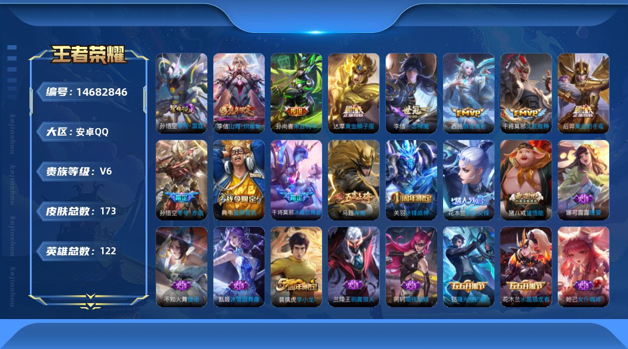 [14682846]v6-122英雄-173皮肤-8传说-49史诗,ff5013 【内测皮肤】:嬴政优雅恋人,狂铁特工战影 【传说皮肤】:孙尚香末日机甲,后羿黄金射手座,达摩黄金狮子座,干将莫邪久胜战神,李信一念神魔,孙悟空零号赤焰,西施游龙清影,李信山海炽霜斩 【限定皮肤】:狄仁杰阴阳师,赵云皇家上将,嬴政优雅恋人,嬴政白昼王子,庄周高山流水,高渐离死亡摇滚,阿轲迷踪丽影,吕布猎兽之王,周瑜赤莲之焰,夏侯惇朔风刀,典韦蓝屏警告,马可波罗逐梦之星,狄仁杰魔术师,狄仁杰万华元夜,达摩沙漠行僧,项羽海滩派对,老夫子醍醐杖,关羽冰锋战神,程咬金演武夺筹,刘邦夺宝奇兵,兰陵王驯魔猎人,兰陵王金庭之子,花木兰默契交锋,孙悟空零号赤焰,牛魔御旌,李元芳银河之约,李元芳云中旅人,钟馗驱傩正仪,杨玉环遇见飞天,女娲朔望之晖,干将莫邪冰霜恋舞曲,雅典娜黎明之约,蔡文姬繁星吟游,太乙真人华丽摇滚,鬼谷子原初探秘者,苏烈千军破阵,百里玄策原初追逐者,弈星混沌棋,沈梦溪星空之诺,沈梦溪大漠名商,明世隐疑决卦,裴擒虎李小龙,米莱狄御霄,云中君纤云弄巧,李信山海炽霜斩,盾山御銮,猪八戒猪悟能,上官婉儿梁祝,嫦娥拒霜思,嫦娥暖冬兔眠,桑启海盐诗旅,暃星界游侠,张良古海寻踪,鬼谷子天穹祈灯 【年限皮肤】:马超神威,李信山海炽霜斩 【赛季限定】:夏侯惇朔风刀,狄仁杰万华元夜,达摩沙漠行僧,老夫子醍醐杖,程咬金演武夺筹,兰陵王金庭之子,张良古海寻踪,牛魔御旌,李元芳云中旅人,钟馗驱傩正仪,雅典娜黎明之约,鬼谷子原初探秘者,苏烈千军破阵,百里玄策原初追逐者,弈星混沌棋,沈梦溪大漠名商,明世隐疑决卦,米莱狄御霄,盾山御銮,桑启海盐诗旅,鬼谷子天穹祈灯 【战令限定】:嬴政白昼王子,阿轲迷踪丽影,吕布猎兽之王,周瑜赤莲之焰,典韦蓝屏警告,刘邦夺宝奇兵,兰陵王驯魔猎人,李元芳银河之约,女娲朔望之晖,沈梦溪星空之诺,嫦娥暖冬兔眠,暃星界游侠 【史诗皮肤】:项羽苍穹之光,阿轲暗夜猫娘,赵云皇家上将,貂蝉圣诞恋歌,甄姬冰雪圆舞曲,王昭君偶像歌手,狄仁杰魔术师,宫本武藏鬼剑武藏,孙尚香水果甜心,嬴政优雅恋人,妲己魅力维加斯,妲己女仆咖啡,墨子金属风暴,吕布圣诞狂欢,曹操幽灵船长,李白千年之狐,吕布末日机甲,关羽冰锋战神,花木兰水晶猎龙者,刘邦德古拉伯爵,夏侯惇乘风破浪,马可波罗逐梦之星,百里守约特工魅影,铠曙光守护者,蔡文姬舞动绿茵,李
