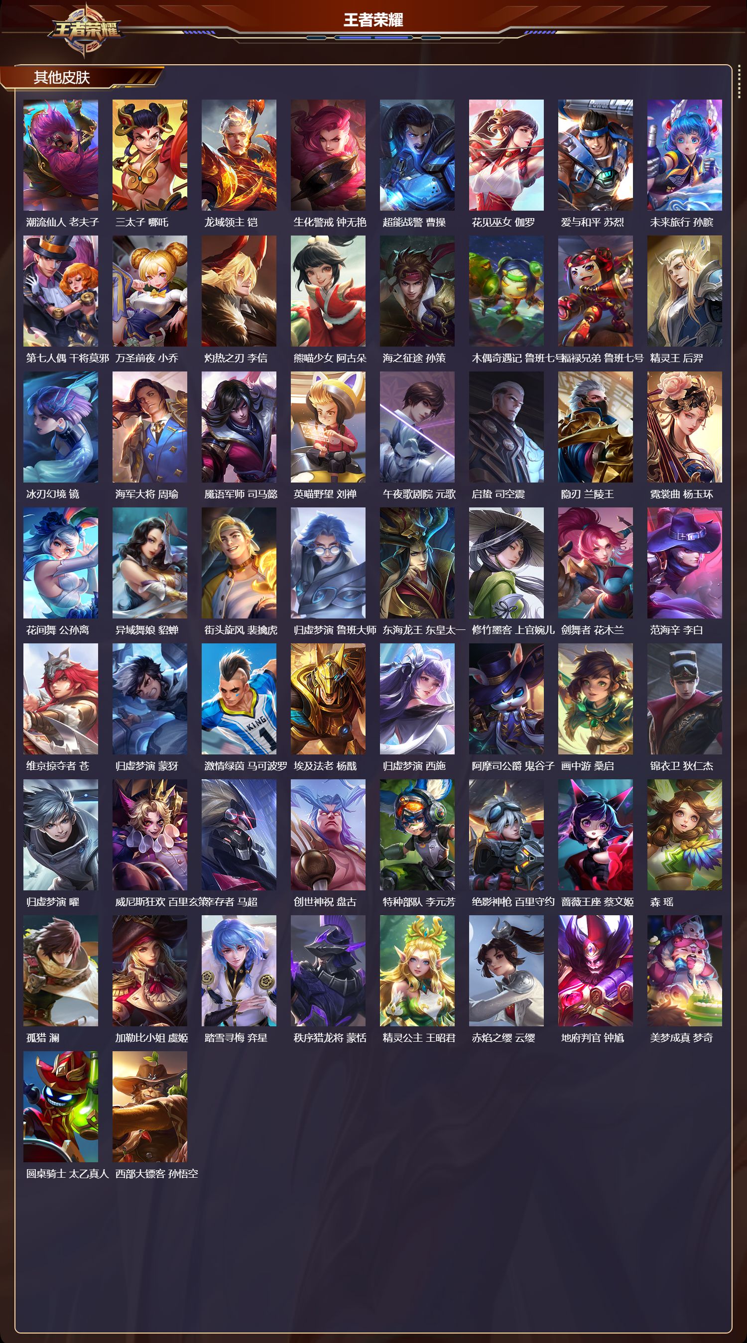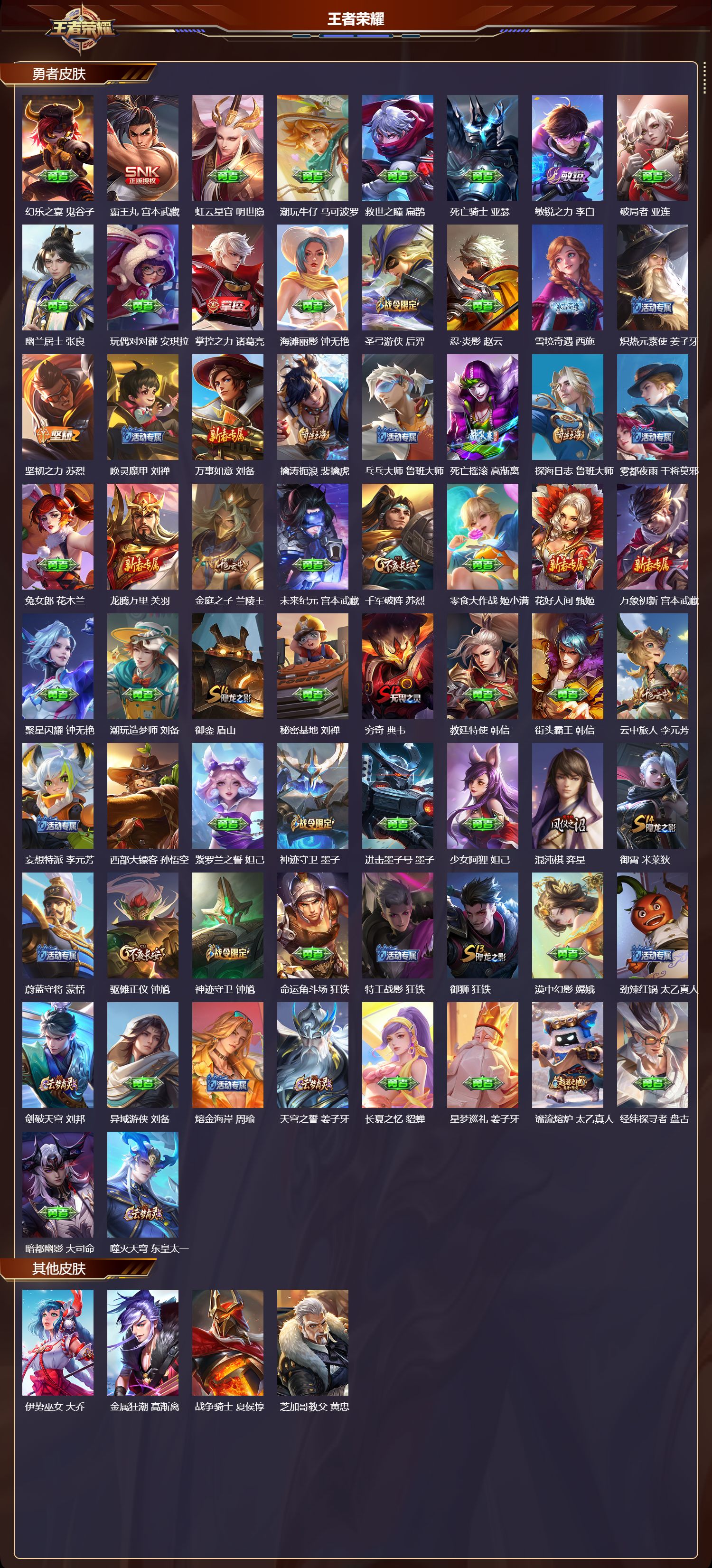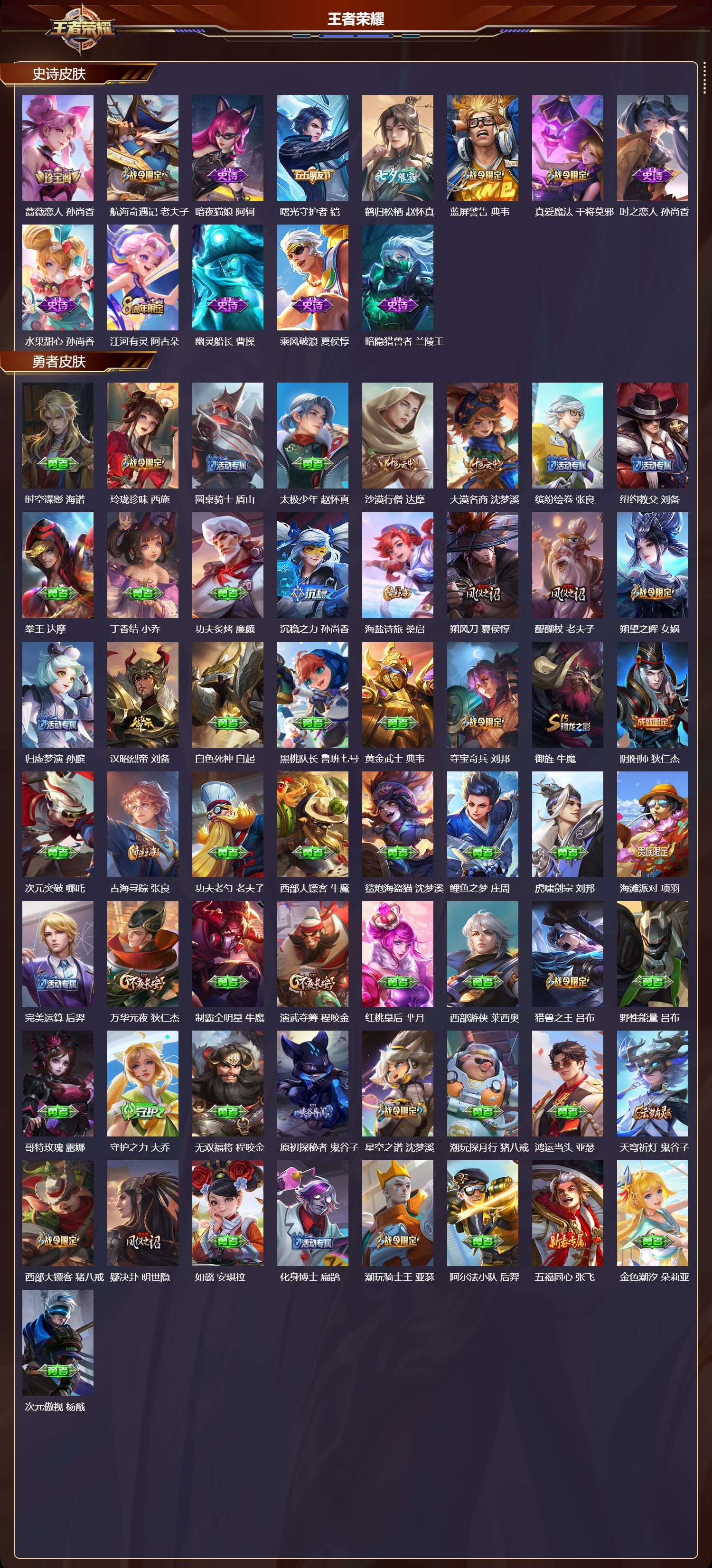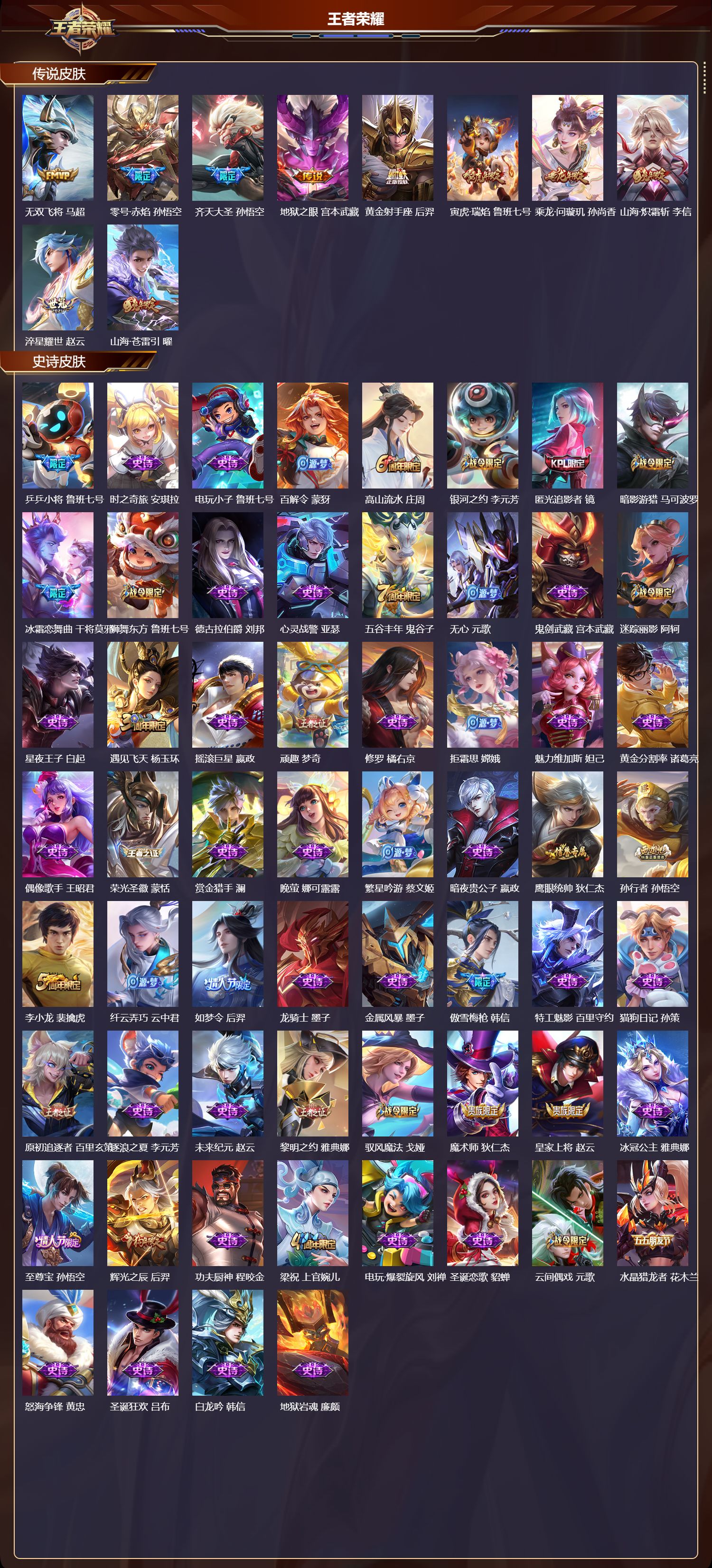 苹果qq/永恒钻石/268皮肤/124英雄/0典藏/0珍品无双/0无双/0珍品传说/10传说/73史诗/9稀有英雄【10 传说皮肤】无双飞将 马超零号·赤焰 孙悟空齐天大圣 孙悟空地狱之眼 宫本武藏黄金射手座 后羿寅虎·瑞焰 鲁班七号乘龙·问璇玑 孙尚香山海·炽霜斩 李信淬星耀世 赵云山海·苍雷引 曜【73 史诗皮肤】乒乒小将 鲁班七号时之奇旅 安琪拉电