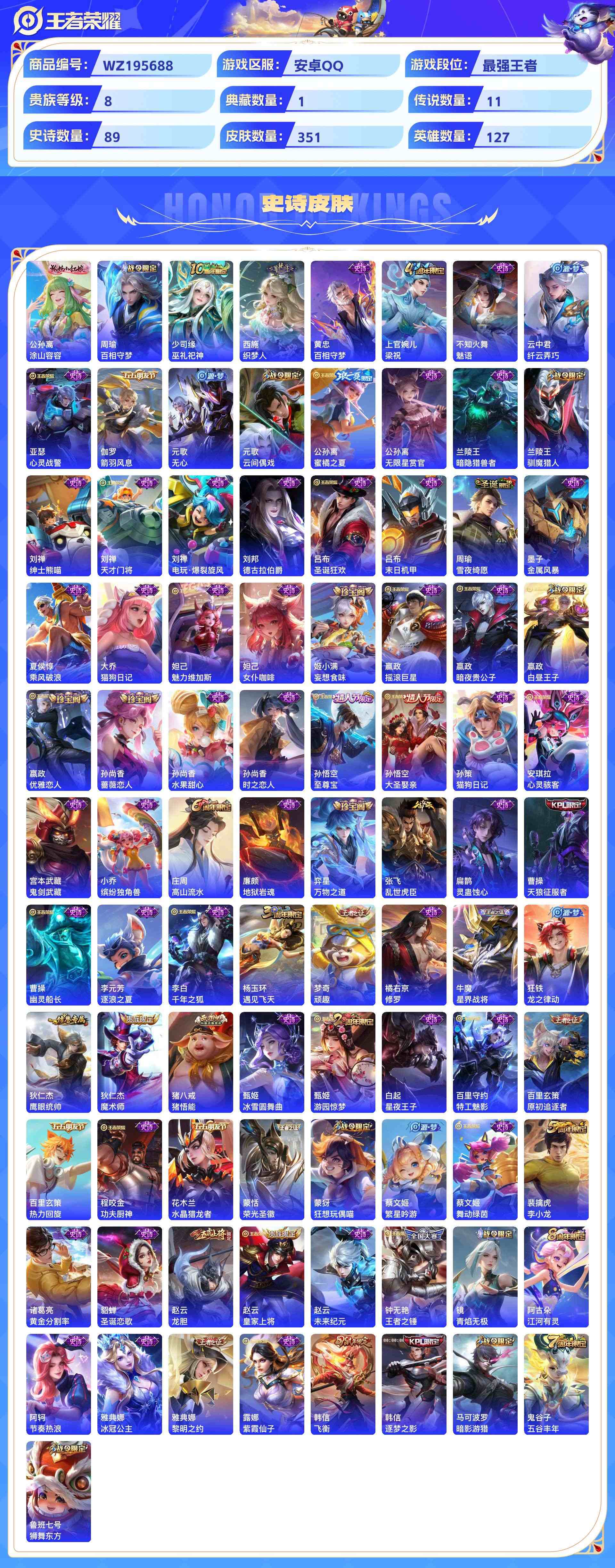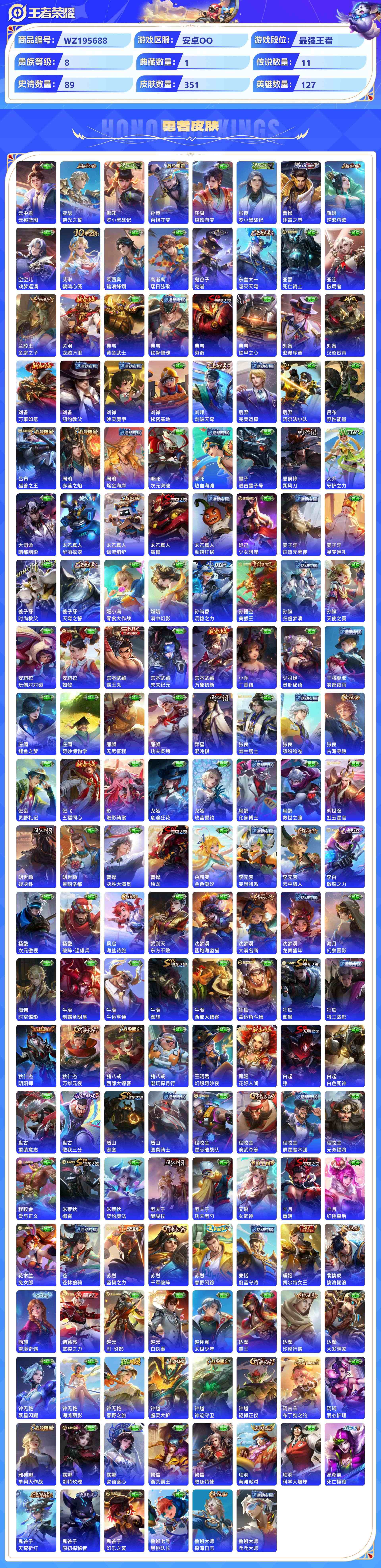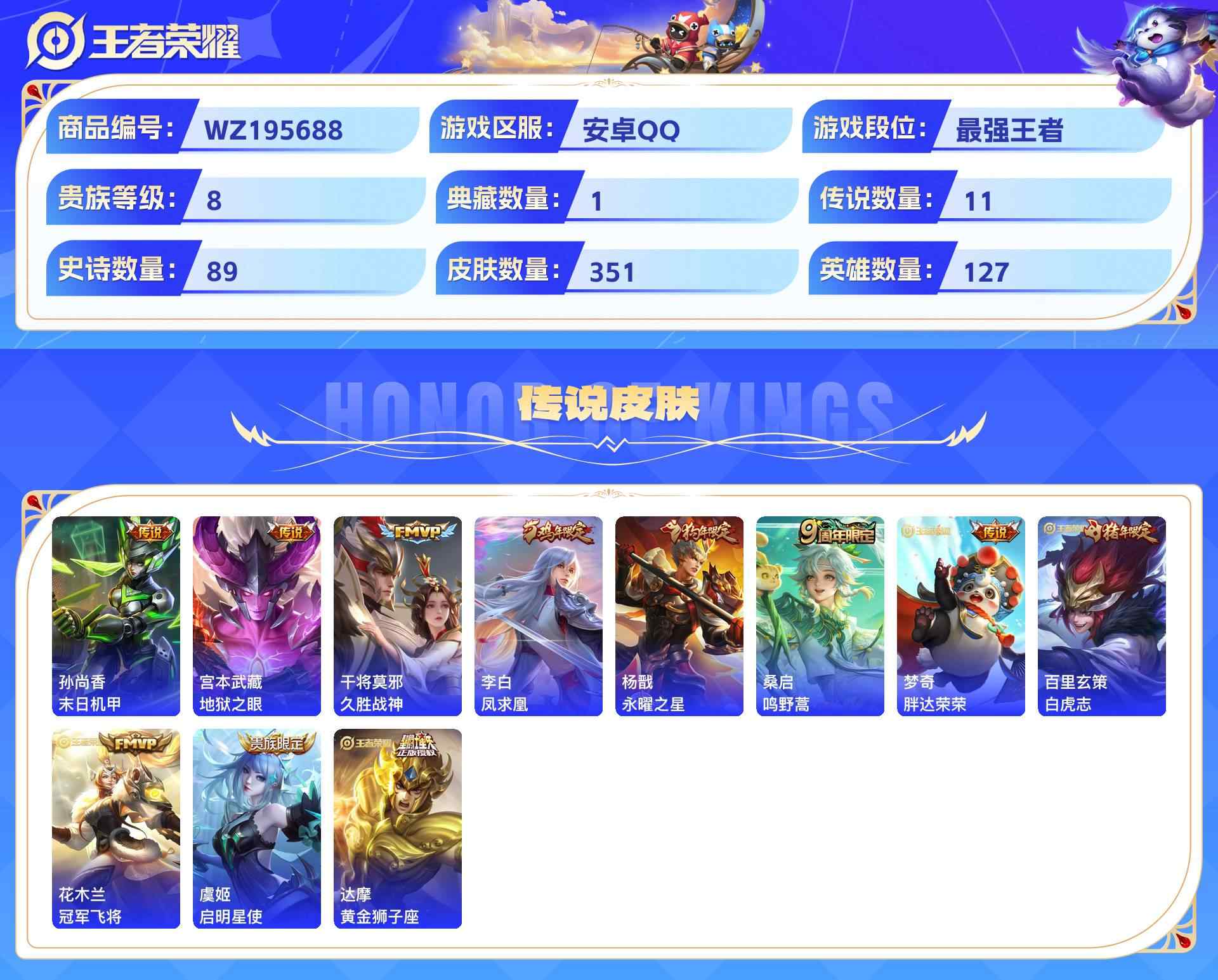 wz195688|精品号安卓qq 贵族8级 351皮 1典藏(弑呛猎影) 11传说(末日机甲地狱之眼久胜战神凤求凰永曜之星) 89史诗3星传说5个性按键1天幕