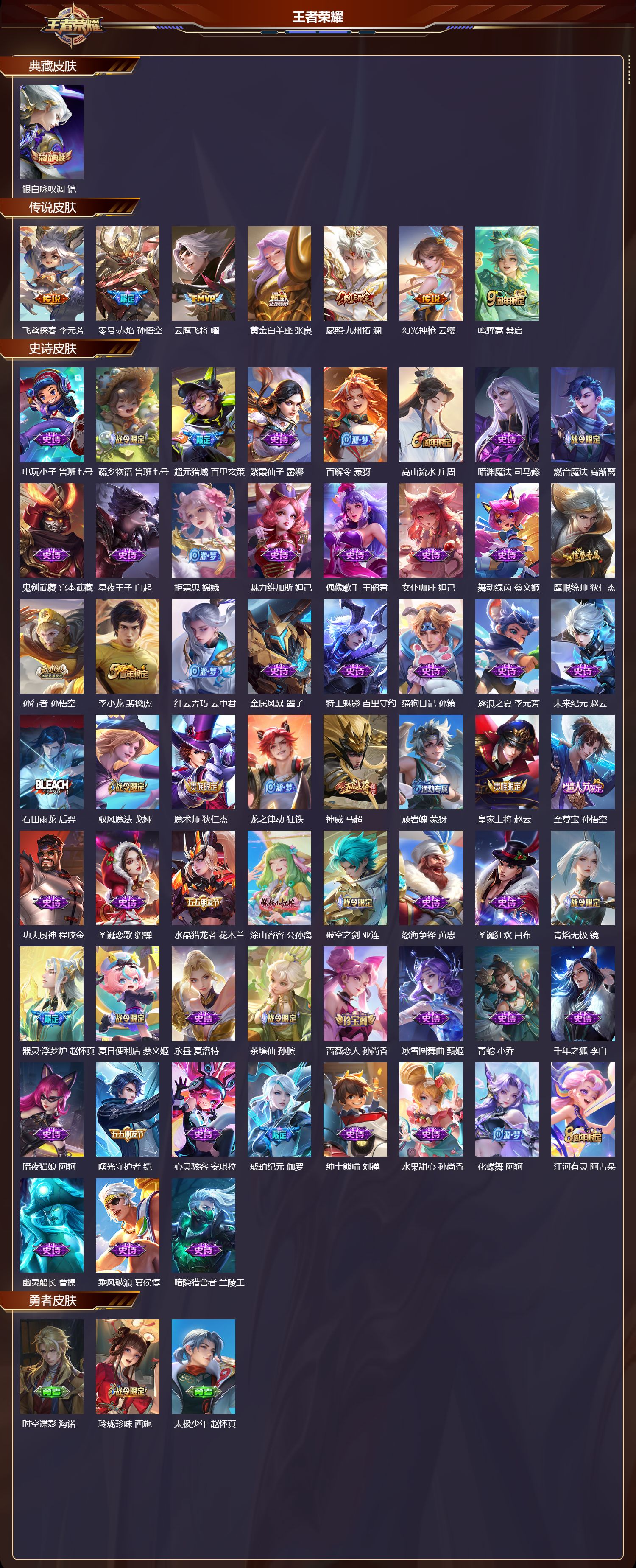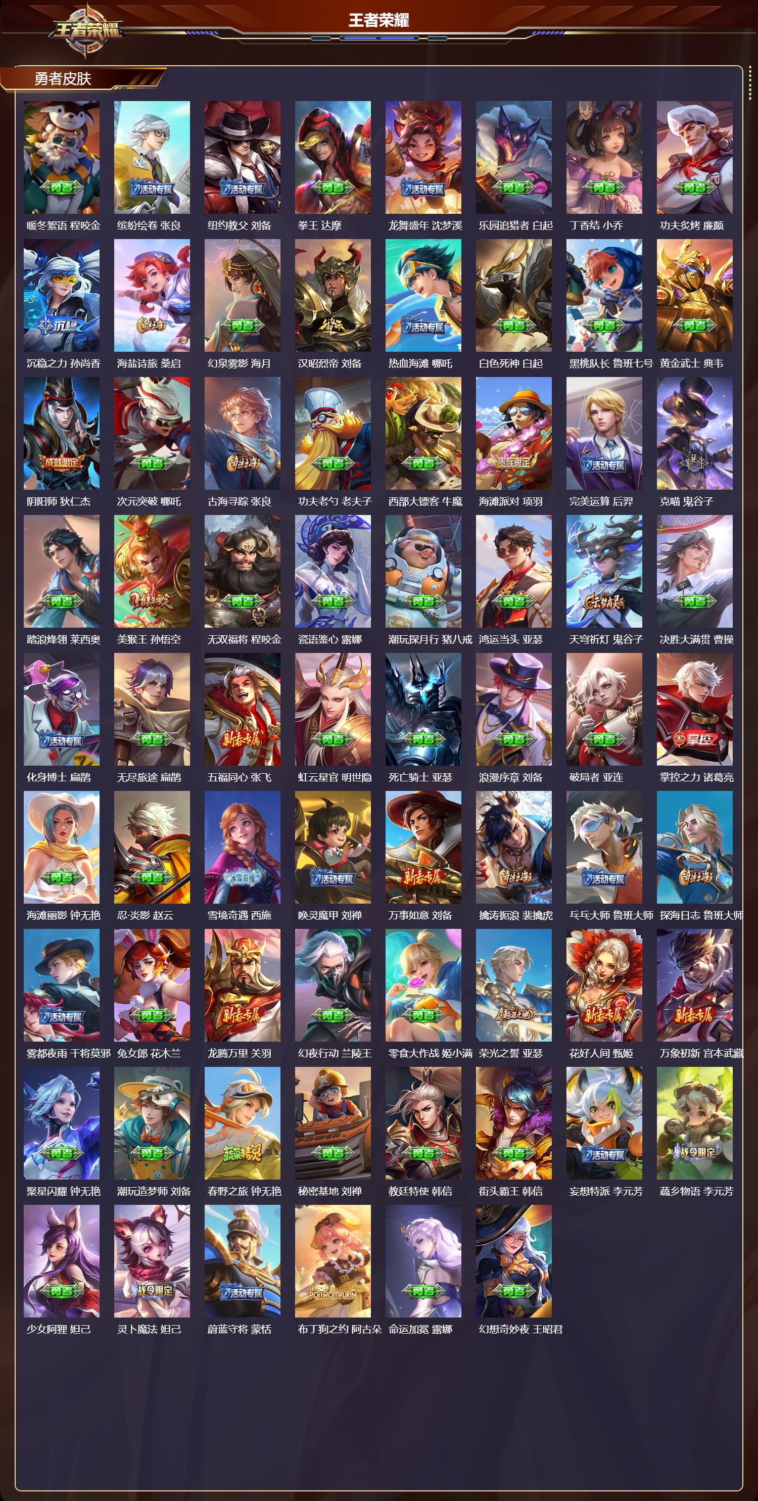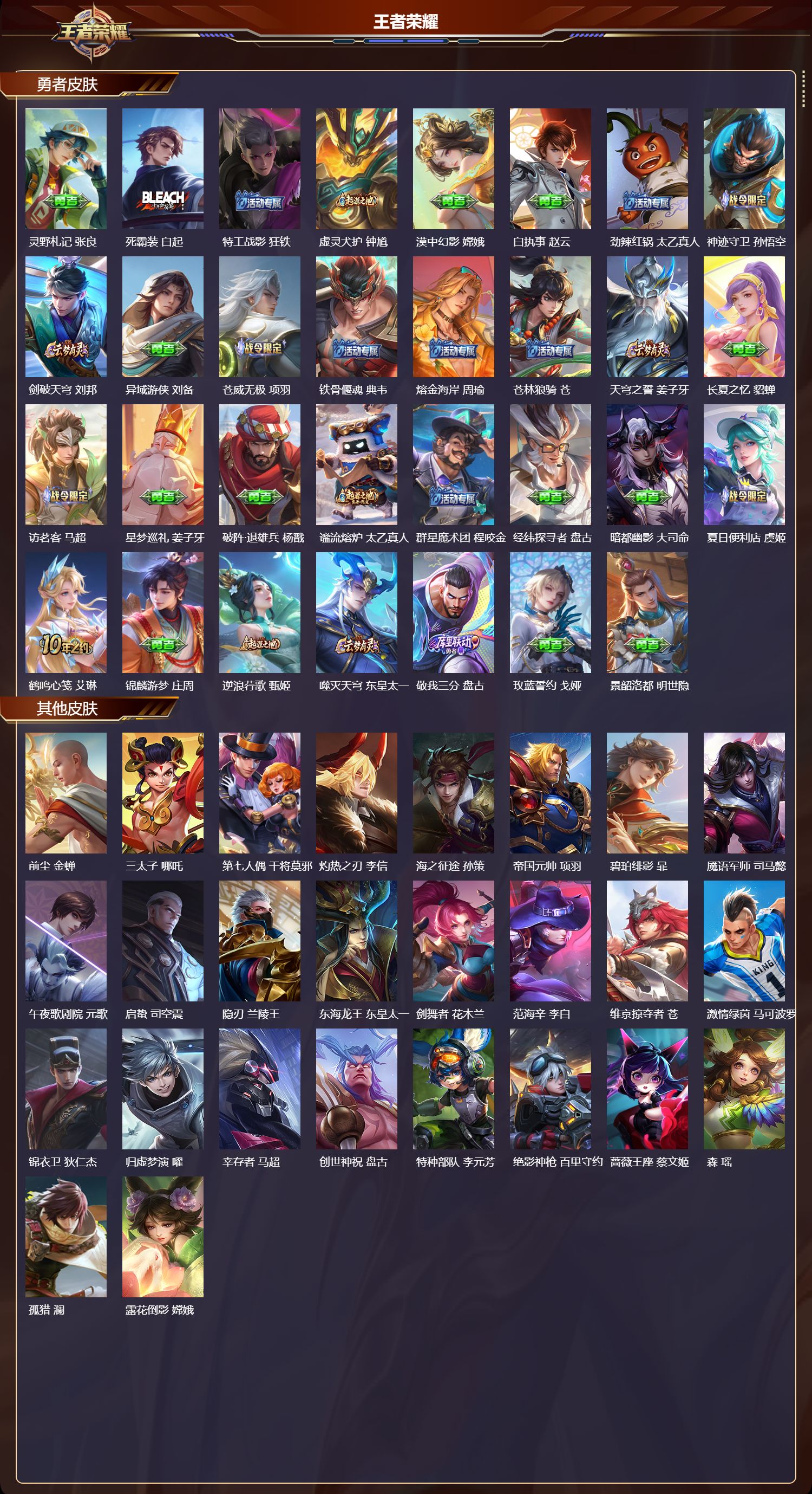 安卓qq/无双王者/197皮肤/127英雄/1典藏/0珍品无双/0无双/0珍品传说/7传说/59史诗/9稀有英雄【1 典藏皮肤】银白咏叹调 铠【7 传说皮肤】飞鸢探春 李元芳零号·赤焰 孙悟空云鹰飞将 曜黄金白羊座 张良愿照·九州拓 澜幻光神呛 云缨鸣野蒿 桑启【59 史诗皮肤】电玩小子 鲁班七号蔬乡物语 鲁班七号超元猎域 百里玄策紫霞仙子 露娜百解令 蒙犽高山流水 庄周
