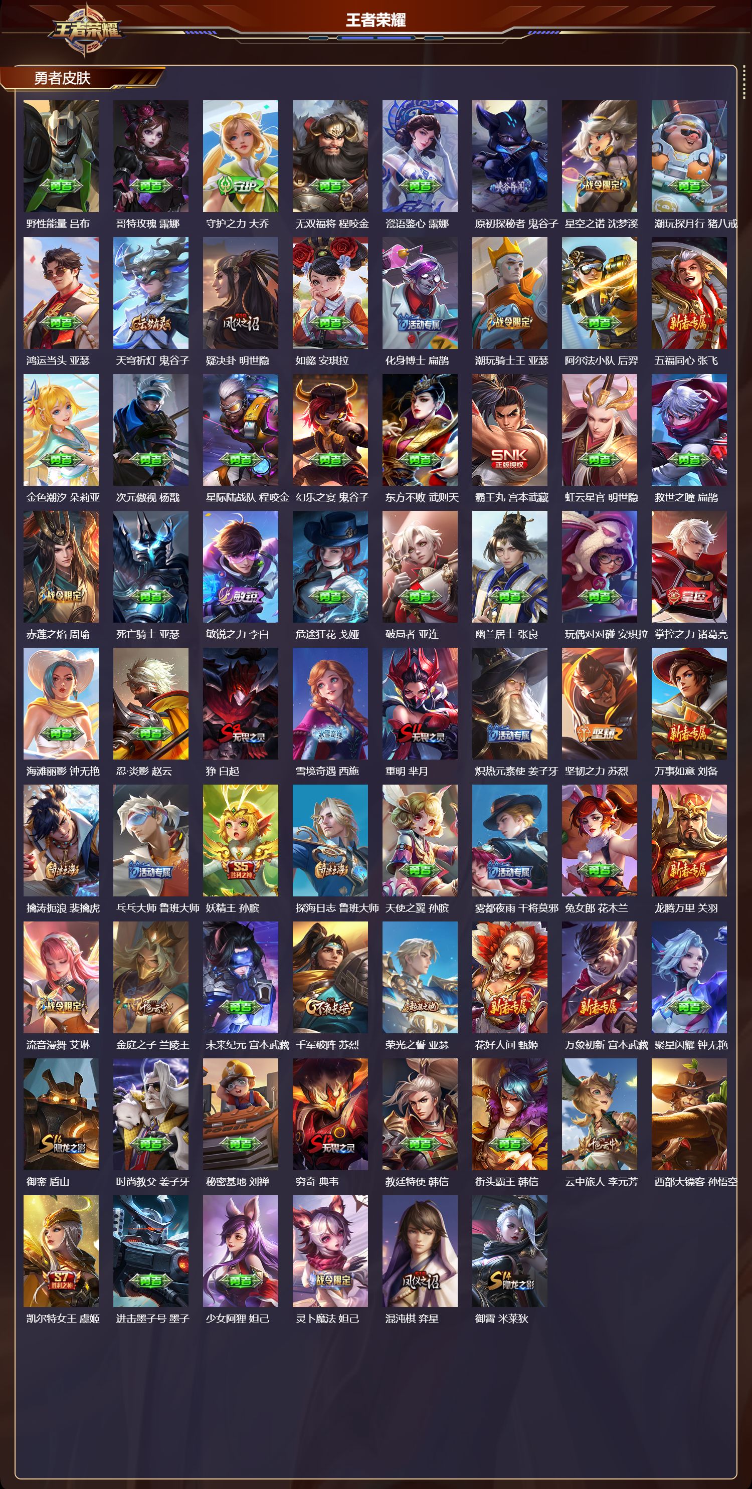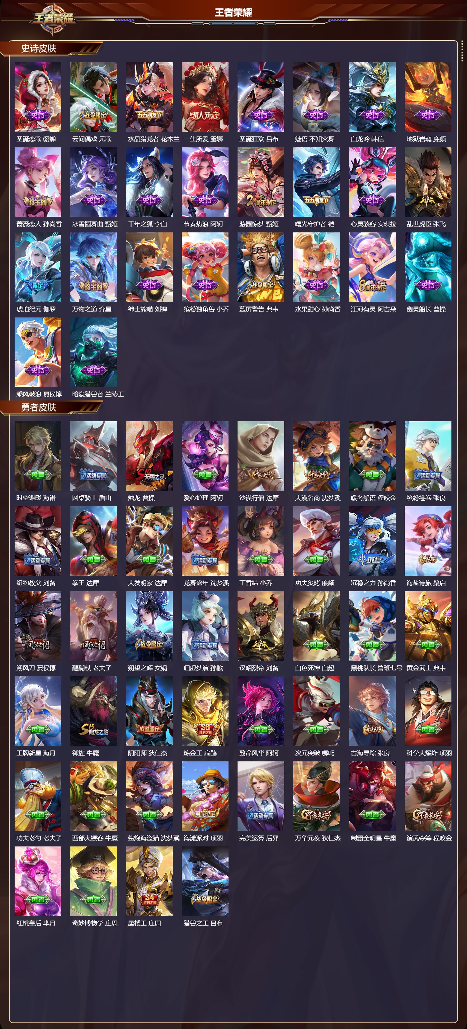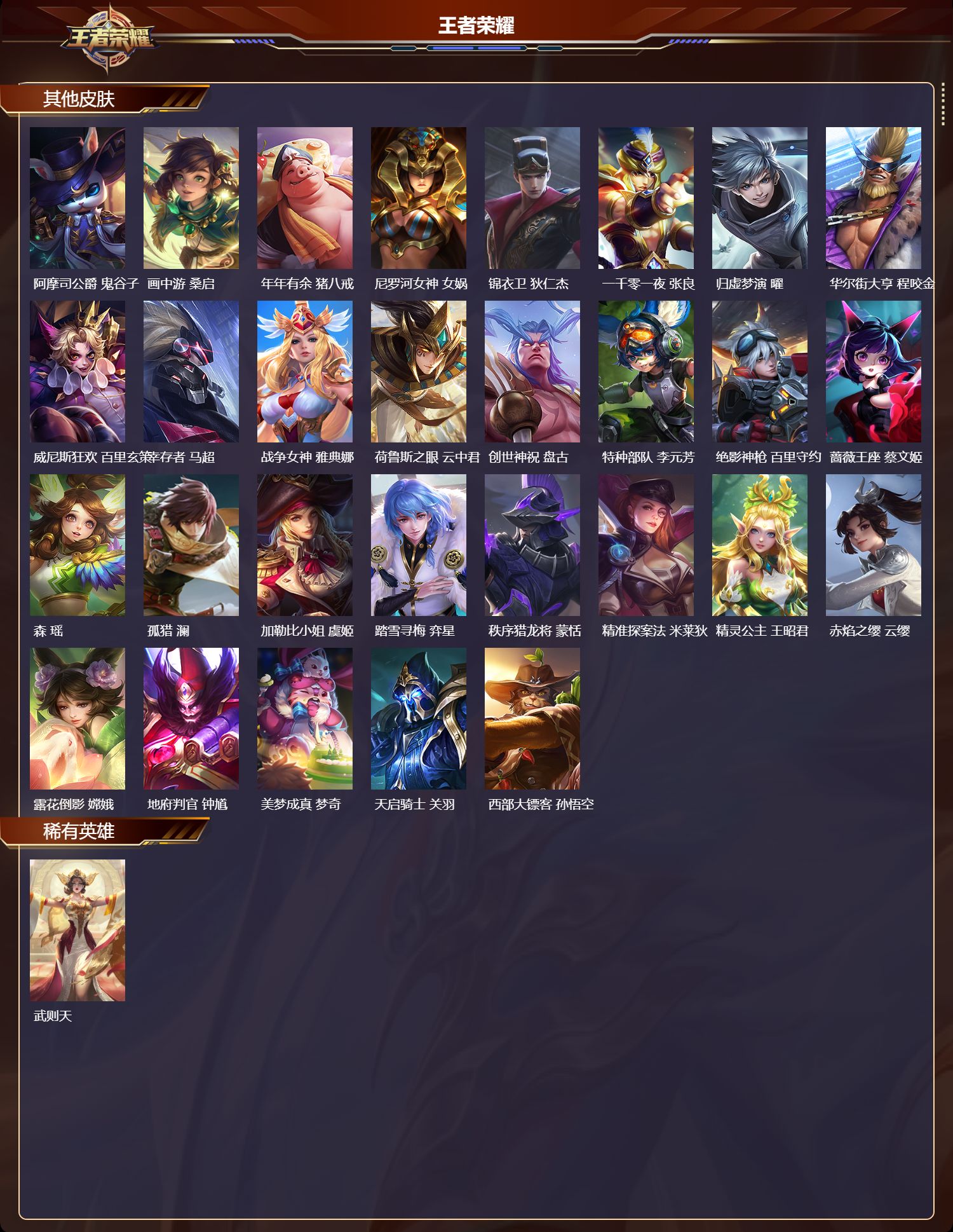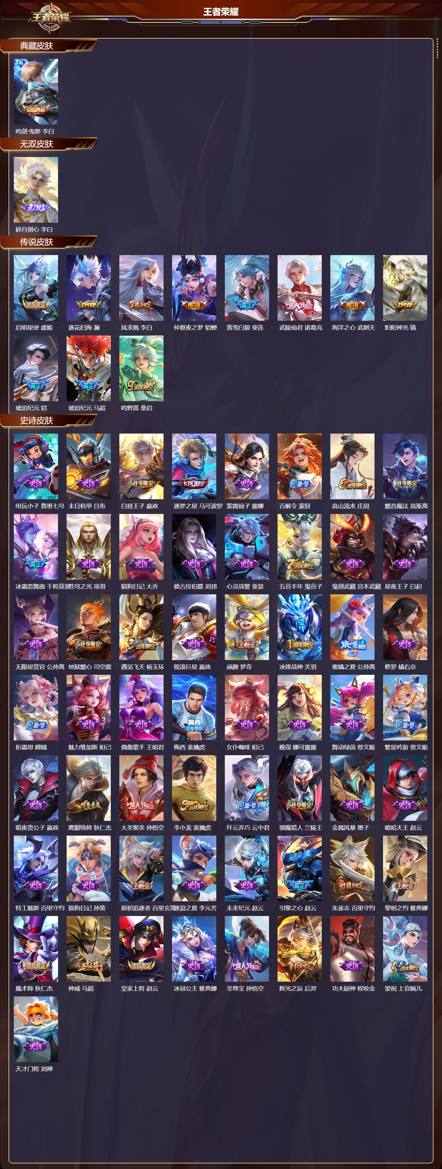安卓qq/最强王者/308皮肤/127英雄/1典藏/0珍品无双/1无双/0珍品传说/11传说/83史诗/9稀有英雄【1 典藏皮肤】鸣剑·曳影 李白【1 无双皮肤】碎月剑心 李白【11 传说皮肤】启明星使 虞姬逐花归海 澜凤求凰 李白仲夏夜之梦 貂蝉落雪白狼 亚连武陵仙君 诸葛亮海洋之心 武则天炽阳神光 镜琥珀纪元 铠琥珀纪元 马超鸣野蒿 桑启【83 史