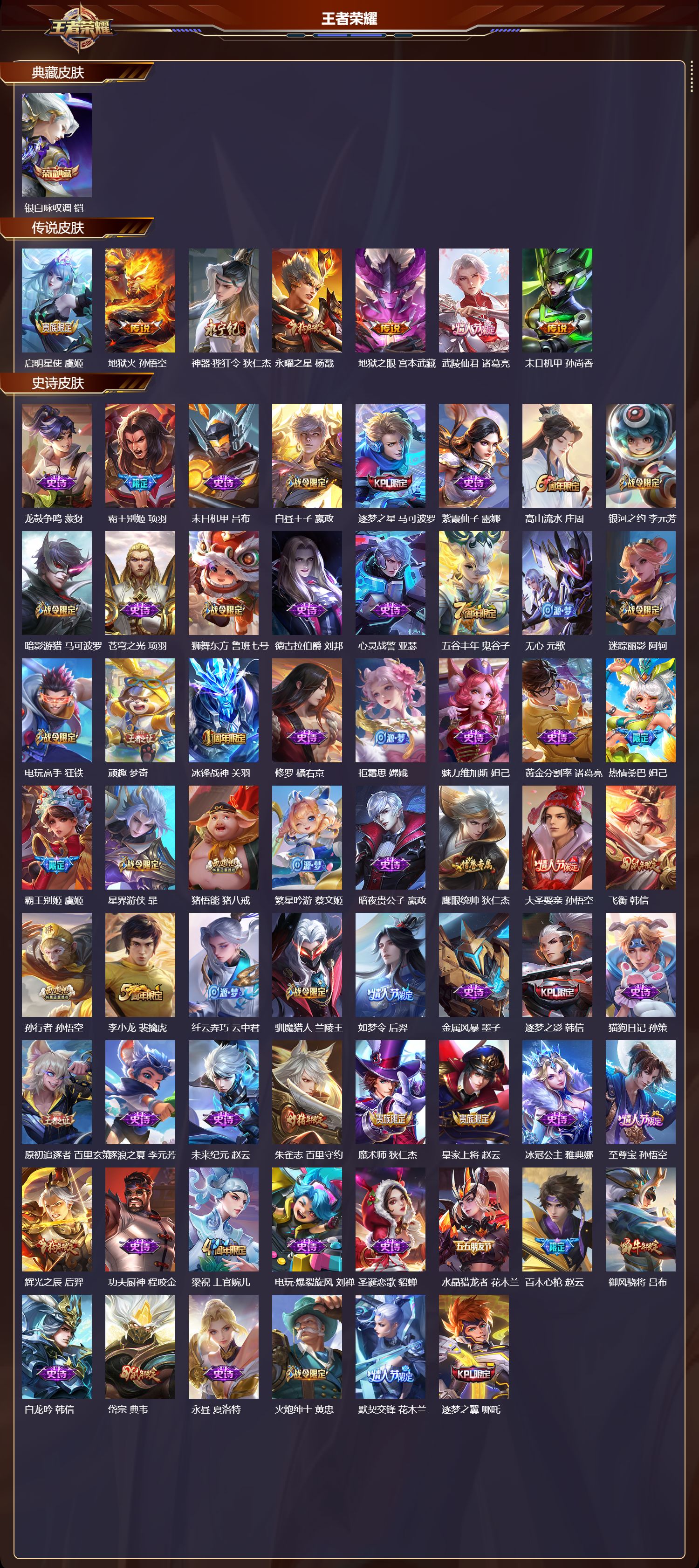 苹果qq/永恒钻石/277皮肤/126英雄/1典藏/0珍品无双/0无双/0珍品传说/7传说/78史诗/8稀有英雄【1 典藏皮肤】银白咏叹调 铠【7 传说皮肤】启明星使 虞姬地狱火 孙悟空神器·狴犴令 狄仁杰永曜之星 杨戬地狱之眼 宫本武藏武陵仙君 诸葛亮末日机甲 孙尚香【78 史诗皮肤】龙鼓争鸣 蒙犽霸王别姬 项羽末日机甲 吕布白昼王子 嬴政逐梦之星 马可波罗紫霞仙子 露