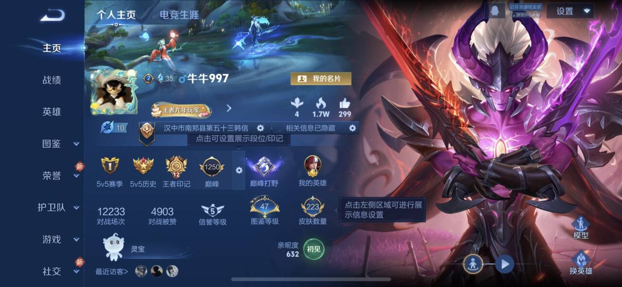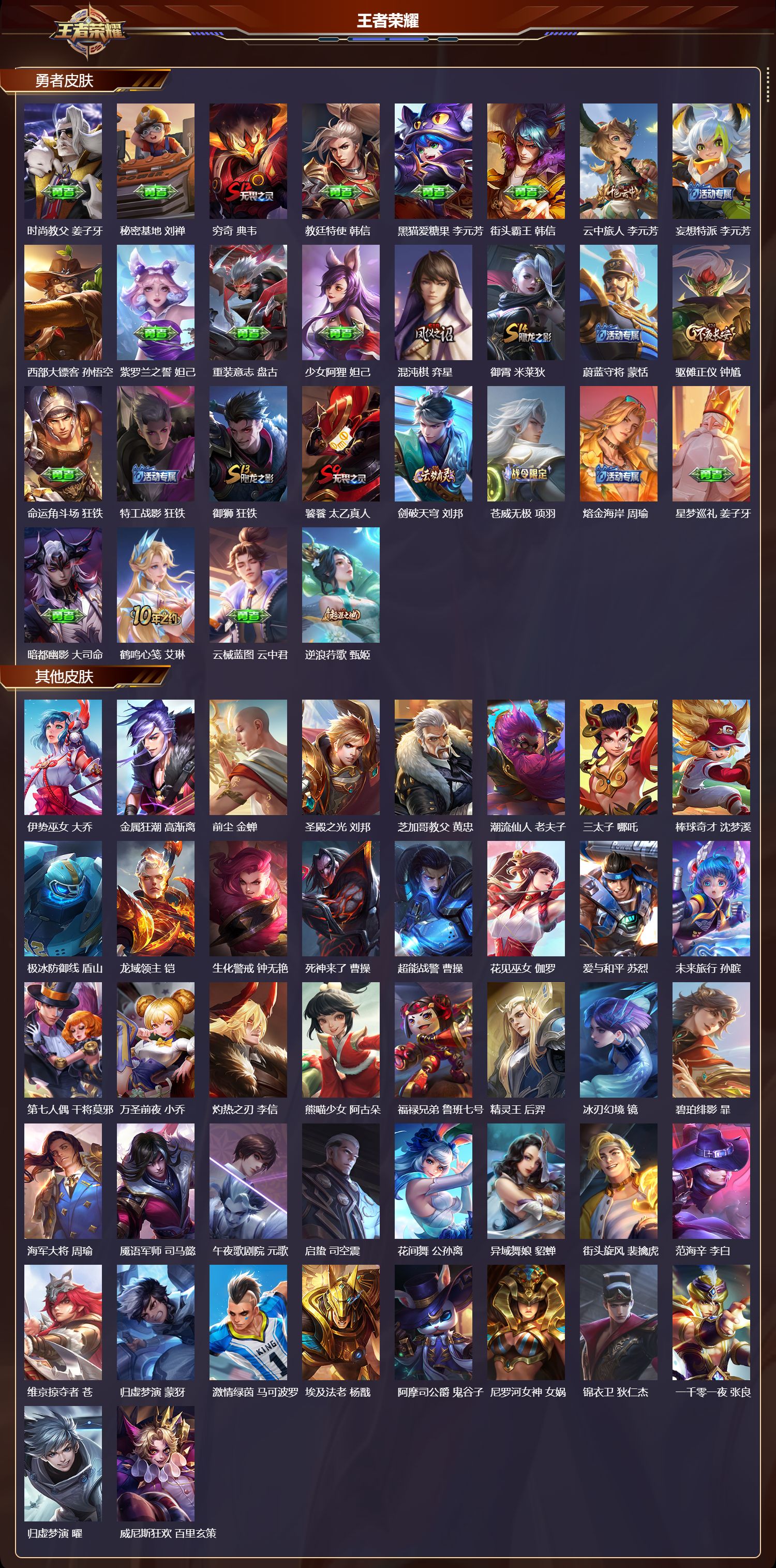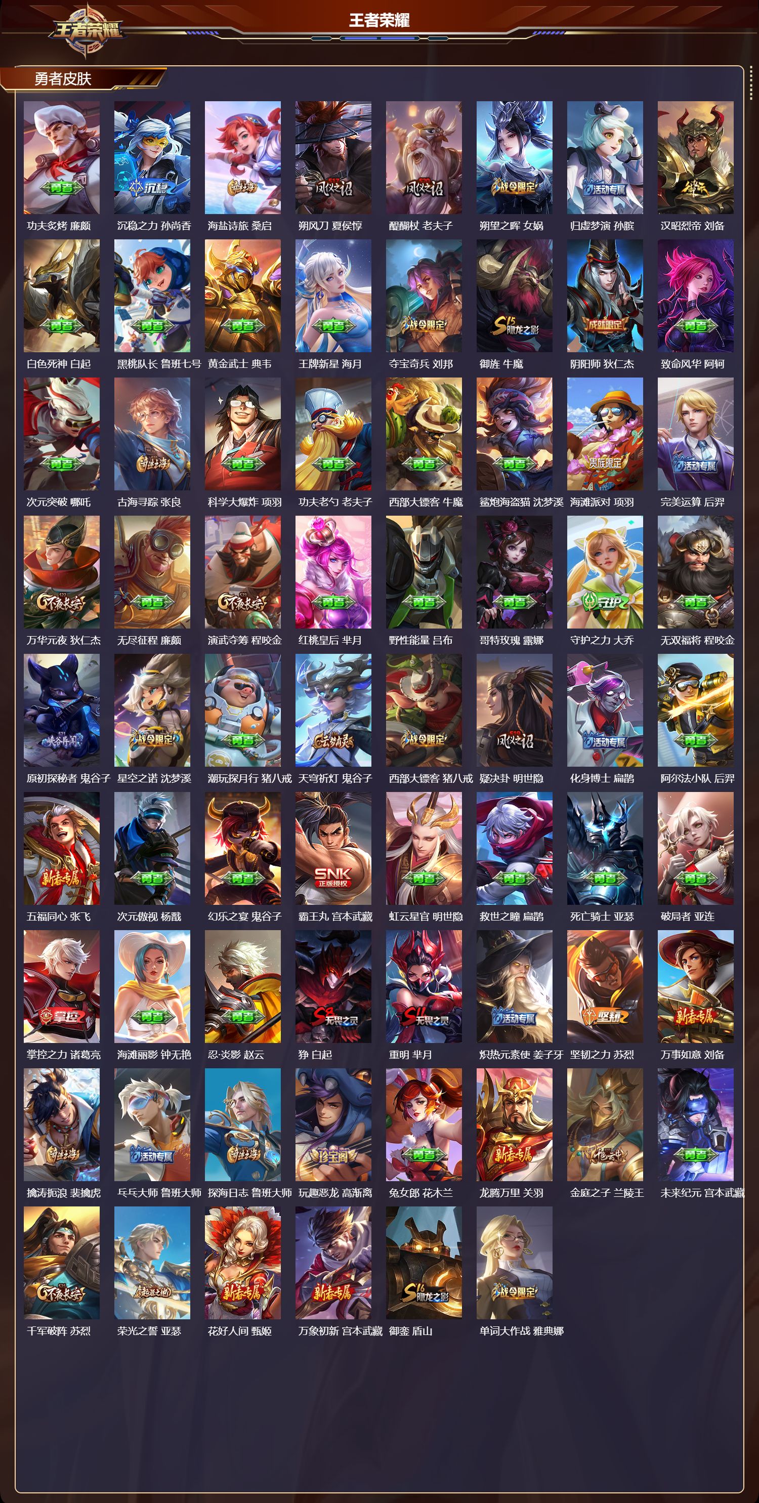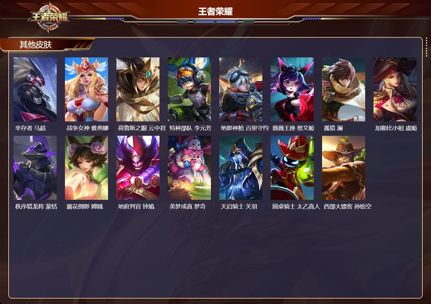 2312227-q/至尊星耀/224皮肤/126英雄/1典藏/0珍品无双/1无双/0珍品传说/5传说/51史诗/8稀有英雄 【1 典藏皮肤】弑呛猎影 韩信 【1 无双皮肤】群星魔术团 韩信 【5 传说皮肤】逐花归海 澜齐天大圣 孙悟空凤求凰 李白地狱之眼 宫本武藏霜北刀 夏侯惇 【51 史诗皮肤】电玩小子 鲁班七号末日机甲 吕布高山流水 庄周银河之约 李元芳匿光追影者