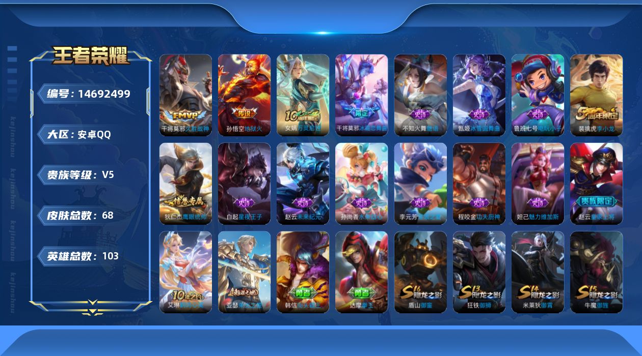 [14692499]ht354【2传说2太阳q46级】安q-v5-68皮肤 103英雄 2传说可二次【2传说】地狱火 久胜战神 14史诗 21限定【热门】万灵启世 冰霜恋舞曲 死神来了 电玩小子 原初探秘者 李小龙 未来纪元赵云 胡桃夹子 逐浪之夏 魅语 功夫厨神 星夜王子 街头霸王 冰雪圆舞曲 重明 御狮 御霄 御旌 御銮 混沌棋 疑决卦 醍醐杖 万华元夜 演武夺筹 驱傩正仪 鹤鸣心笺 拳王 霸王丸 科学大爆炸 皇家上将 魅力维加斯 水果甜心 鹰眼统帅