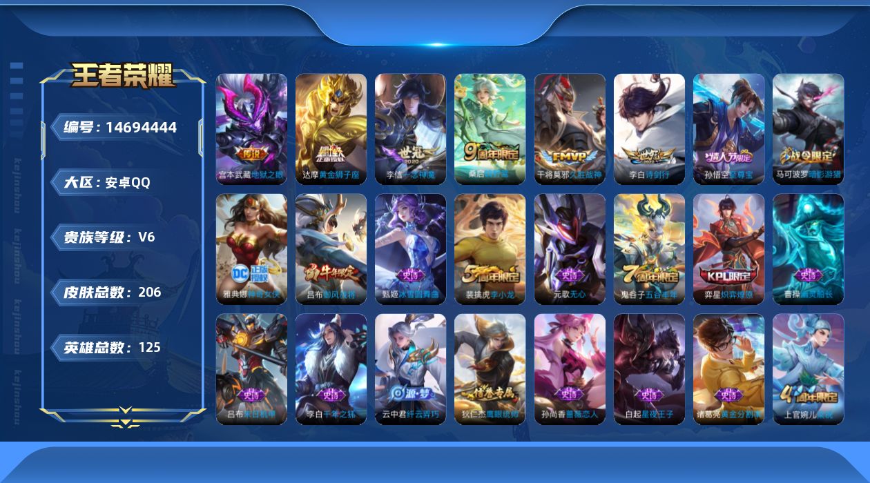 [14694444]安卓q-v0-最强王者段位-125英雄-206皮肤-6传说-46史诗 【英雄全皮】:影全皮 【传说皮肤】:桑启鸣野蒿,李白诗剑行,李信一念神魔,干将莫邪久胜战神,达摩黄金狮子座,宫本武藏地狱之眼 【限定皮肤】:大乔绒语心约,姜子牙天穹之誓,狄仁杰阴阳师,赵云皇家上将,孙尚香蔷薇恋人,鲁班七号狮舞东方,扁鹊奇幻香踪,芈月重明,吕布御风骁将,元歌无心,夏侯惇朔风刀,曹操烛龙,典韦穷奇,马可波罗暗影游猎,狄仁杰魔术师,狄仁杰万华元夜,达摩沙漠行僧,项羽海滩派对,老夫子醍醐杖,程咬金演武夺筹,孙悟空至尊宝,牛魔御旌,李元芳云中旅人,钟馗神迹守卫,钟馗驱傩正仪,杨玉环遇见飞天,杨戬潮玩骑兵,雅典娜单词大作战,雅典娜黎明之约,太乙真人饕餮,鬼谷子原初探秘者,鬼谷子五谷丰年,百里玄策原初追逐者,弈星混沌棋,梦奇顽趣,沈梦溪大漠名商,沈梦溪匿光破解者,明世隐疑决卦,裴擒虎李小龙,裴擒虎擒涛扼浪,狂铁御狮,米莱狄御霄,云中君纤云弄巧,盾山御銮,猪八戒西部大镖客,上官婉儿梁祝,蒙犽狂想玩偶喵,鲁班大师探海日志,桑启海盐诗旅,艾琳女武神,张良古海寻踪,蒙犽百解令,蒙恬荣光圣徽,鬼谷子天穹祈灯,刘邦剑破天穹,程咬金群星魔术团,周瑜熔金海岸 【年限皮肤】:吕布御风骁将 【赛季限定】:芈月重明,夏侯惇朔风刀,曹操烛龙,典韦穷奇,狄仁杰万华元夜,达摩沙漠行僧,老夫子醍醐杖,程咬金演武夺筹,张良古海寻踪,牛魔御旌,李元芳云中旅人,钟馗驱傩正仪,雅典娜黎明之约,太乙真人饕餮,鬼谷子原初探秘者,百里玄策原初追逐者,弈星混沌棋,梦奇顽趣,沈梦溪大漠名商,明世隐疑决卦,裴擒虎擒涛扼浪,狂铁御狮,米莱狄御霄,盾山御銮,鲁班大师探海日志,桑启海盐诗旅,鬼谷子天穹祈灯,蒙恬荣光圣徽,刘邦剑破天穹,姜子牙天穹之誓 【战令限定】:鲁班七号狮舞东方,扁鹊奇幻香踪,马可波罗暗影游猎,钟馗神迹守卫,杨戬潮玩骑兵,雅典娜单词大作战,猪八戒西部大镖客,蒙犽狂想玩偶喵 【史诗皮肤】:赵云皇家上将,貂蝉圣诞恋歌,甄姬冰雪圆舞曲,狄仁杰魔术师,宫本武藏鬼剑武藏,孙尚香蔷薇恋人,孙尚香水果甜心,妲己魅力维加斯,墨子金属风暴,吕布圣诞狂欢,刘禅绅士熊喵,曹操幽灵船长,李白千年之狐,吕布末日机甲,张飞乱世虎臣,孙悟空至尊宝,刘邦德古拉伯爵,小乔缤纷独角兽,兰陵王暗隐猎兽者,诸葛亮黄金分割率,亚瑟心灵战警,雅典娜冰冠公主,百里守约特工魅