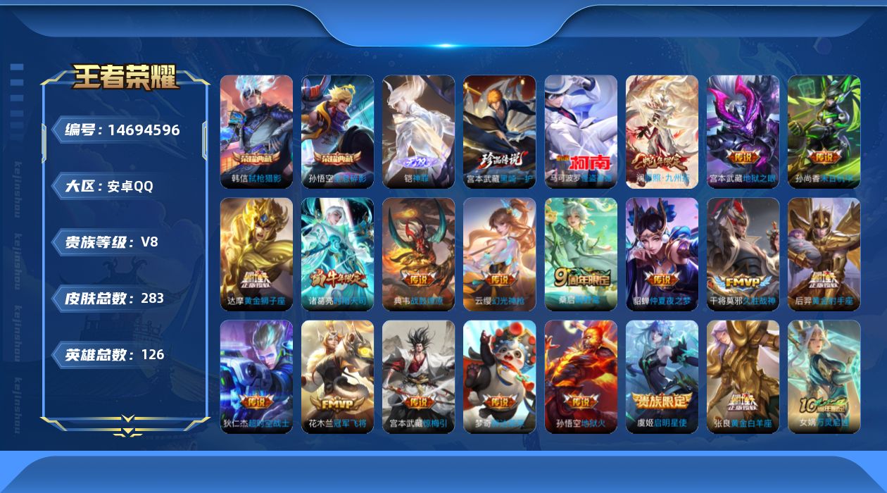 [14694596]安卓q-v7-最强王者段位-126英雄-283皮肤-2典藏皮肤-1无双-2珍品传说-19传说-68史诗 【英雄全皮】:宫本武藏全皮,孙权全皮,影全皮 【荣耀典藏】:孙悟空全息碎影,韩信弑呛猎影 【无双皮肤】:铠神罪 【珍品传说】:马可波罗怪盗基德,宫本武藏黑崎一护 【传说皮肤】:后羿神树通天,澜愿照九州拓,云缨幻光神呛,桑启鸣野蒿,典韦战鼓燎原,宫本武藏惊梅引,诸葛亮时雨天司,虞姬启明星使,张良黄金白羊座,干将莫邪久胜战神,达摩黄金狮子座,花木兰冠军飞将,梦奇胖达荣荣,后羿黄金射手座,貂蝉仲夏夜之梦,孙尚香末日机甲,宫本武藏地狱之眼,孙悟空地狱火,狄仁杰超时空战士 【限定皮肤】:姜子牙天穹之誓,李白谪仙醉月,狄仁杰阴阳师,赵云皇家上将,墨子神迹守卫,鲁班七号狮舞东方,高渐离玩趣恶龙,阿轲迷踪丽影,吕布猎兽之王,周瑜赤莲之焰,元歌云间偶戏,夏侯惇朔风刀,马可波罗暗影游猎,狄仁杰魔术师,狄仁杰万华元夜,达摩沙漠行僧,项羽海滩派对,老夫子醍醐杖,老夫子航海奇遇记,程咬金演武夺筹,刘邦夺宝奇兵,兰陵王驯魔猎人,亚瑟潮玩骑士王,孙悟空大圣娶亲,牛魔御旌,虞姬启明星使,钟馗神迹守卫,钟馗驱傩正仪,雅典娜单词大作战,鬼谷子原初探秘者,诸葛亮时雨天司,苏烈千军破阵,百里玄策原初追逐者,百里守约朱雀志,弈星混沌棋,梦奇天降福星,明世隐疑决卦,裴擒虎李小龙,米莱狄御霄,盾山御銮,猪八戒西部大镖客,上官婉儿梁祝,嫦娥拒霜思,蒙犽狂想玩偶喵,桑启海盐诗旅,鬼谷子天穹祈灯,沈梦溪龙舞盛年,刘邦剑破天穹 【年限皮肤】:百里守约朱雀志,诸葛亮时雨天司 【赛季限定】:夏侯惇朔风刀,狄仁杰万华元夜,达摩沙漠行僧,老夫子醍醐杖,程咬金演武夺筹,牛魔御旌,钟馗驱傩正仪,鬼谷子原初探秘者,苏烈千军破阵,百里玄策原初追逐者,弈星混沌棋,明世隐疑决卦,米莱狄御霄,盾山御銮,桑启海盐诗旅,鬼谷子天穹祈灯,刘邦剑破天穹,姜子牙天穹之誓 【战令限定】:墨子神迹守卫,鲁班七号狮舞东方,阿轲迷踪丽影,吕布猎兽之王,周瑜赤莲之焰,元歌云间偶戏,马可波罗暗影游猎,老夫子航海奇遇记,刘邦夺宝奇兵,兰陵王驯魔猎人,亚瑟潮玩骑士王,钟馗神迹守卫,雅典娜单词大作战,猪八戒西部大镖客,蒙犽狂想玩偶喵 【史诗皮肤】:露娜紫霞仙子,赵云皇家上将,赵云未来纪元,貂蝉圣诞恋歌,甄姬冰雪圆舞曲,狄仁杰魔术师,廉颇地狱岩魂,宫本武藏鬼剑武藏,