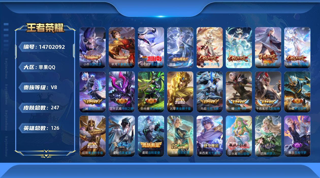 [14702092]背包有一颗水晶、皇冠号 贵族8-贵族积分82764-荣耀水晶2抽、荣耀积分278-247皮-2典藏-16传说-0无双-2珍品传说-0珍品无双-1全皮英雄-3改名卡 苹果手q87区 营地id92693778无双王者【珍品传说皮肤】:器灵·落星盏怪盗基德【荣耀典藏】:天鹅之梦大秦宣太后【优质限定皮肤】:无双飞将至尊宝凤求凰【传说皮肤】:地狱之眼神树通天愿照·九州拓愿