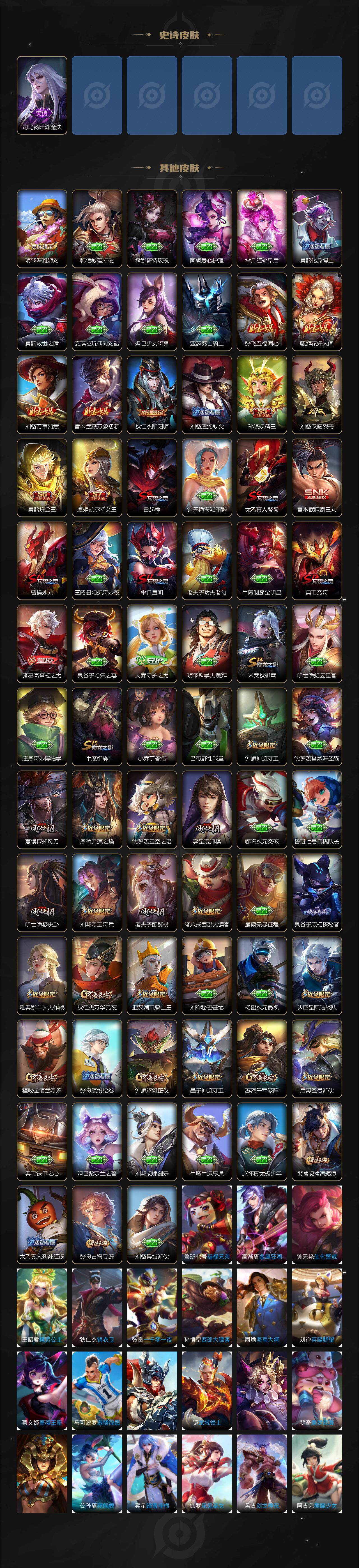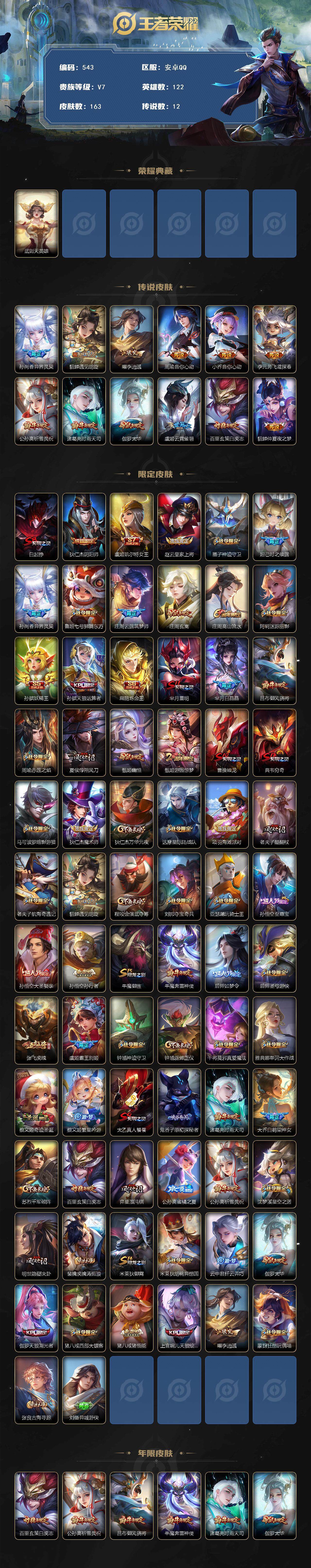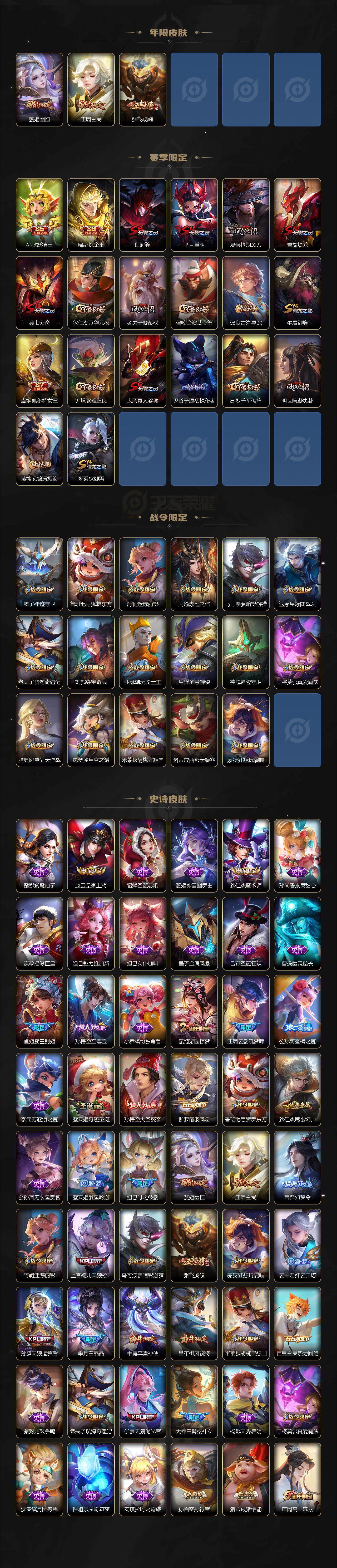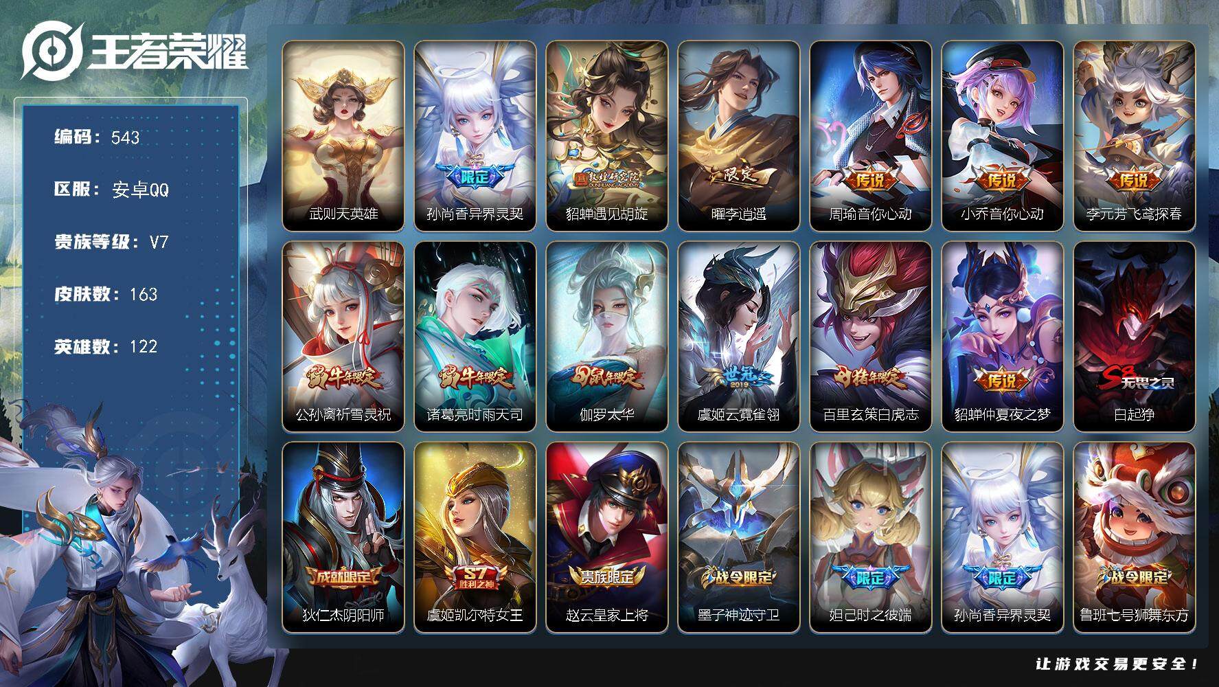 _2313583-q-v7-秩序白银iii段位-122英雄-163皮肤-1典藏英雄-12传说-55史诗 【荣耀典藏】:武则天英雄 【传说皮肤】:孙尚香异界灵契,貂蝉遇见胡旋,曜李,周瑜音你心动,小乔音你心动,李元芳飞鸢探春,公孙离祈雪灵祝,诸葛亮时雨天司,伽罗太华,虞姬云霓雀翎,百里玄策白虎志,貂蝉仲夏夜之梦 【限定皮肤】:白起狰,狄仁杰阴阳师,虞姬凯尔特女王,赵云皇家上将,墨子神迹守卫,妲己时之彼端,孙尚香异界灵契,鲁班七号狮舞东方,庄周云端筑梦师,庄周玄嵩,庄周高山流水,阿轲迷踪丽影,孙膑妖精王,孙膑天狼运算者,扁鹊炼金王,芈月重明,芈月白晶晶,吕布御风骁将,周瑜赤莲之焰,夏侯惇朔风刀,甄姬幽恒,甄姬游园惊梦,曹操烛龙,典韦穷奇,马可波罗暗影游猎,狄仁杰魔术师,狄仁杰万华元夜,达摩星际陆战队,项羽海滩派对,老夫子醍醐杖,老夫子航海奇遇记,貂蝉遇见胡旋,程咬金演武夺筹,刘邦夺宝奇兵,亚瑟潮玩骑士王,孙悟空至尊宝,孙悟空大圣娶亲,孙悟空孙行者,牛魔御旌,牛魔奔雷神使,后羿如梦令,后羿圣弓游侠,张飞虎魄,虞姬霸王别姬,钟馗神迹守卫,钟馗驱傩正仪,干将莫邪真爱魔法,雅典娜单词大作战,蔡文姬奇迹圣诞,蔡文姬繁星吟游,太乙真人饕餮,鬼谷子原初探秘者,诸葛亮时雨天司,大乔白鹤梁神女,苏烈千军破阵,百里玄策白虎志,弈星混沌棋,公孙离蜜橘之夏,公孙离祈雪灵祝,沈梦溪星空之诺,明世隐疑决卦,裴擒虎擒涛扼浪,米莱狄御霄,米莱狄胡桃异想国,云中君纤云弄巧,伽罗太华,伽罗天狼溯光者,猪八戒西部大镖客,猪八戒猪悟能,上官婉儿天狼绘梦者,曜李,蒙犽狂想玩偶喵,张良古海寻踪,刘备异域游侠 【年限皮肤】:百里玄策白虎志,公孙离祈雪灵祝,吕布御风骁将,牛魔奔雷神使,诸葛亮时雨天司,伽罗太华,甄姬幽恒,庄周玄嵩,张飞虎魄 【赛季限定】:孙膑妖精王,扁鹊炼金王,白起狰,芈月重明,夏侯惇朔风刀,曹操烛龙,典韦穷奇,狄仁杰万华元夜,老夫子醍醐杖,程咬金演武夺筹,张良古海寻踪,牛魔御旌,虞姬凯尔特女王,钟馗驱傩正仪,太乙真人饕餮,鬼谷子原初探秘者,苏烈千军破阵,弈星混沌棋,明世隐疑决卦,裴擒虎擒涛扼浪,米莱狄御霄 【战令限定】:墨子神迹守卫,鲁班七号狮舞东方,阿轲迷踪丽影,周瑜赤莲之焰,马可波罗暗影游猎,达摩星际陆战队,老夫子航海奇遇记,刘邦夺宝奇兵,亚瑟潮玩骑士王,后羿圣弓游侠,钟馗神迹守卫,干将莫邪真爱