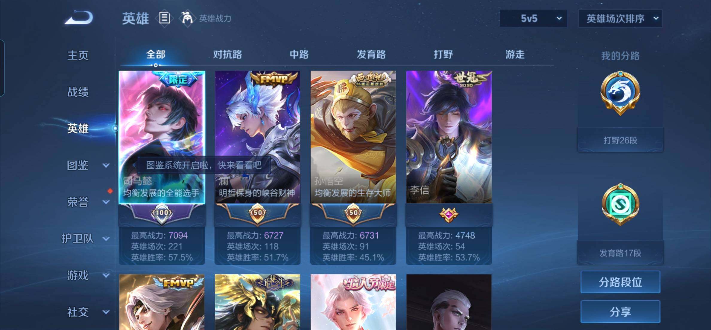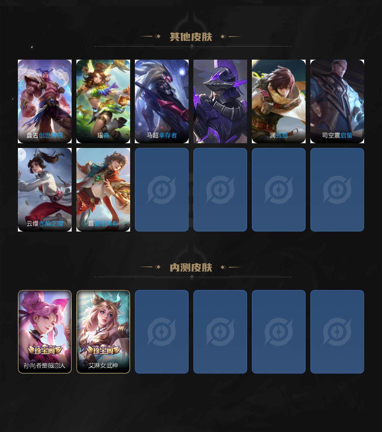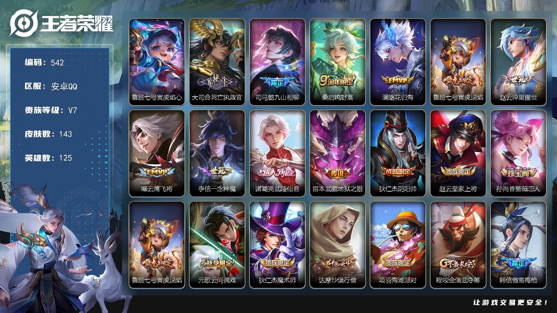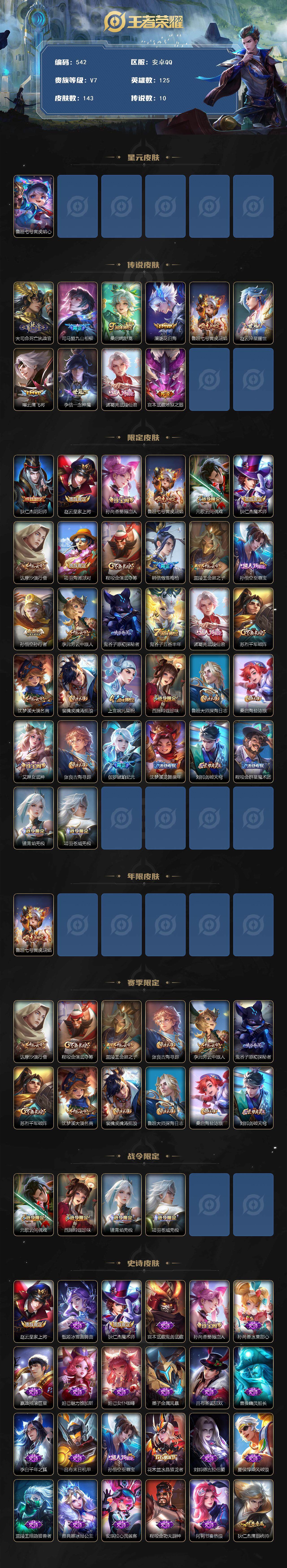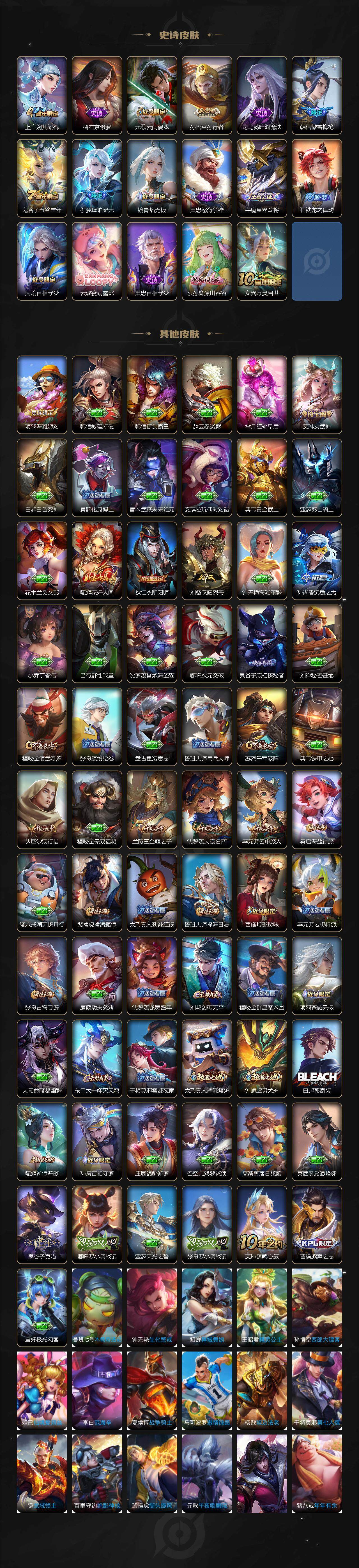 _2313589-q-v7-最强王者段位-125英雄-143皮肤-10传说-41史诗 【英雄全皮】:司马懿全皮,空空儿全皮 【传说皮肤】:大司命死亡执政官,司马懿九山相柳,桑启鸣野蒿,澜逐花归海,鲁班七号寅虎瑞焰,赵云淬星耀世,曜云鹰飞将,李信一念神魔,诸葛亮武陵仙君,宫本武藏地狱之眼 【限定皮肤】:狄仁杰阴阳师,赵云皇家上将,孙尚香蔷薇恋人,鲁班七号寅虎瑞焰,元歌云间偶戏,狄仁杰魔术师,达摩沙漠行僧,项羽海滩派对,程咬金演武夺筹,韩信傲雪梅呛,兰陵王金庭之子,孙悟空至尊宝,孙悟空孙行者,李元芳云中旅人,鬼谷子原初探秘者,鬼谷子五谷丰年,诸葛亮武陵仙君,苏烈千军破阵,沈梦溪大漠名商,裴擒虎擒涛扼浪,上官婉儿梁祝,西施玲珑珍味,鲁班大师探海日志,桑启海盐诗旅,艾琳女武神,张良古海寻踪,伽罗琥珀纪元,沈梦溪龙舞盛年,刘邦剑破天穹,程咬金群星魔术团,镜青焰无极,项羽苍威无极 【年限皮肤】:鲁班七号寅虎瑞焰 【赛季限定】:达摩沙漠行僧,程咬金演武夺筹,兰陵王金庭之子,张良古海寻踪,李元芳云中旅人,鬼谷子原初探秘者,苏烈千军破阵,沈梦溪大漠名商,裴擒虎擒涛扼浪,鲁班大师探海日志,桑启海盐诗旅,刘邦剑破天穹 【战令限定】:元歌云间偶戏,西施玲珑珍味,镜青焰无极,项羽苍威无极 【史诗皮肤】:赵云皇家上将,甄姬冰雪圆舞曲,狄仁杰魔术师,宫本武藏鬼剑武藏,孙尚香蔷薇恋人,孙尚香水果甜心,嬴政摇滚巨星,妲己魅力维加斯,妲己女仆咖啡,墨子金属风暴,吕布圣诞狂欢,曹操幽灵船长,李白千年之狐,吕布末日机甲,孙悟空至尊宝,花木兰水晶猎龙者,刘邦德古拉伯爵,夏侯惇乘风破浪,兰陵王暗隐猎兽者,雅典娜冰冠公主,安琪拉心灵骇客,程咬金功夫厨神,阿轲节奏热浪,狄仁杰鹰眼统帅,上官婉儿梁祝,橘右京修罗,元歌云间偶戏,孙悟空孙行者,司马懿暗渊魔法,韩信傲雪梅呛,鬼谷子五谷丰年,伽罗琥珀纪元,镜青焰无极,黄忠怒海争锋,牛魔星界战将,狂铁龙之律动,周瑜百相守梦,云缨赞萌露比,黄忠百相守梦,公孙离涂山容容,女娲万灵启世 【其他皮肤】:项羽海滩派对,韩信教廷特使,韩信街头霸王,赵云忍炎影,芈月红桃皇后,艾琳女武神,白起白色死神,扁鹊化身博士,宫本武藏未来纪元,安琪拉玩偶对对碰,典韦黄金武士,亚瑟死亡骑士,花木兰兔女郎,甄姬花好人间,狄仁杰阴阳师,刘备汉昭烈帝,钟无艳海滩丽影,孙尚香沉稳之力,小乔丁香结,吕布野性能量,沈梦溪鲨炮