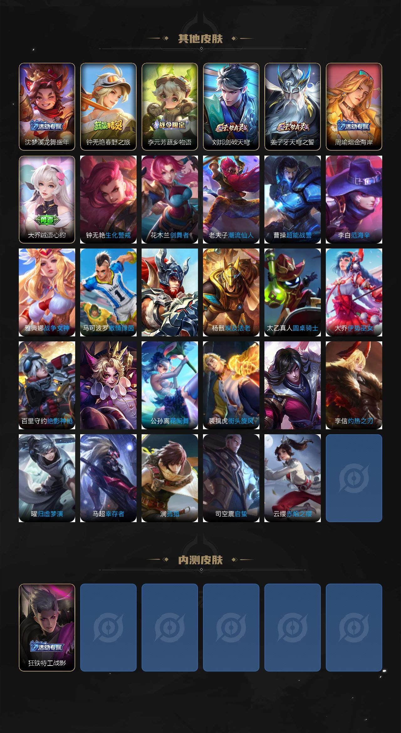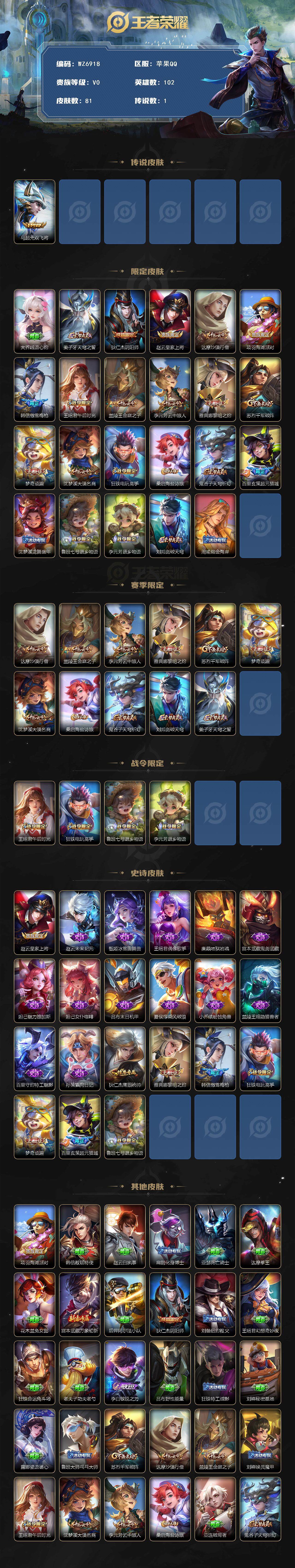 【小国标司空震】v0-尊贵铂金ii段位-102英雄-81皮肤-1传说-21史诗 【传说皮肤】:马超无双飞将 【限定皮肤】:大乔绒语心约,姜子牙天穹之誓,狄仁杰阴阳师,赵云皇家上将,达摩沙漠行僧,项羽海滩派对,韩信傲雪梅呛,王昭君午后时光,兰陵王金庭之子,李元芳云中旅人,雅典娜黎明之约,苏烈千军破阵,梦奇顽趣,沈梦溪大漠名商,狂铁电玩高手,桑启海盐诗旅,鬼谷子天穹祈灯,百里玄策超元猎域,沈梦溪龙舞盛年,鲁班七号蔬乡物语,李元芳蔬乡物语,刘邦剑破天穹,周瑜熔金海岸 【赛季限定】:达摩沙漠行僧,兰陵王金庭之子,李元芳云中旅人,雅典娜黎明之约,苏烈千军破阵,梦奇顽趣,沈梦溪大漠名商,桑启海盐诗旅,鬼谷子天穹祈灯,刘邦剑破天穹,姜子牙天穹之誓 【战令限定】:王昭君午后时光,狂铁电玩高手,鲁班七号蔬乡物语,李元芳蔬乡物语 【史诗皮肤】:赵云皇家上将,赵云未来纪元,甄姬冰雪圆舞曲,王昭君偶像歌手,廉颇地狱岩魂,宫本武藏鬼剑武藏,妲己魅力维加斯,妲己女仆咖啡,吕布末日机甲,夏侯惇乘风破浪,小乔缤纷独角兽,兰陵王暗隐猎兽者,百里守约特工魅影,孙策猫狗日记,狄仁杰鹰眼统帅,雅典娜黎明之约,韩信傲雪梅呛,狂铁电玩高手,梦奇顽趣,百里玄策超元猎域,鲁班七号蔬乡物语 【其他皮肤】:项羽海滩派对,韩信教廷特使,赵云白执事,扁鹊化身博士,亚瑟死亡骑士,达摩拳王,花木兰兔女郎,宫本武藏万象初新,后羿阿尔法小队,狄仁杰阴阳师,刘备纽约教父,王昭君幻想奇妙夜,狂铁命运角斗场,老夫子功夫老勺,李白敏锐之力,吕布野性能量,狂铁特工战影,刘禅秘密基地,露娜瓷语鉴心,鲁班大师乓乓大师,苏烈千军破阵,达摩沙漠行僧,兰陵王金庭之子,刘禅唤灵魔甲,王昭君午后时光,沈梦溪大漠名商,李元芳云中旅人,桑启海盐诗旅,亚连破局者,鬼谷子天穹祈灯,沈梦溪龙舞盛年,钟无艳春野之旅,李元芳蔬乡物语,刘邦剑破天穹,姜子牙天穹之誓,周瑜熔金海岸,大乔绒语心约,钟无艳生化警戒,花木兰剑舞者,老夫子潮流仙人,曹操超能战警,李白范海辛,雅典娜战争女神,马可波罗激情绿茵,苍维京掠夺者,杨戬埃及法老,太乙真人圆桌骑士,大乔伊势巫女,百里守约绝影神呛,百里玄策威尼斯狂欢,公孙离花间舞,裴擒虎街头旋风,司马懿魇语军师,李信灼热之刃,曜归虚梦演,马超幸存者,澜孤猎,司空震启蛰,云缨赤焰之缨 【内测皮肤】:狂铁特工战影 【营地id】:1843140347 【小国标】:小国标司空震 【金标】:金标曜