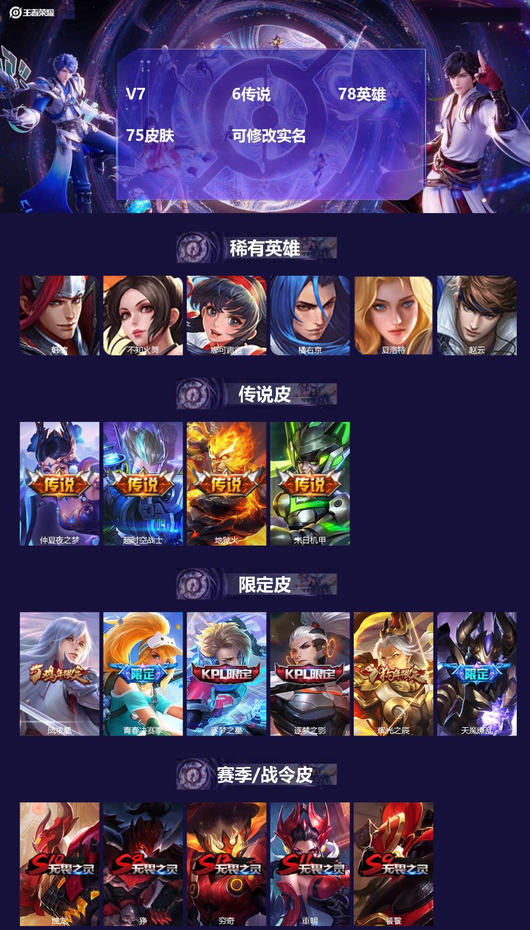 [14716800]v7 6传说 78英雄 75皮肤 可修改实名 【稀有英雄】:韩信韩跳跳夏洛特夏师傅橘右京橘子娜可露露鸟人不知火舞赵云 【传说皮】:地狱火仲夏夜之梦大飞蛾末日机甲-孙尚香绿蚂蚱超时空战士-狄仁杰 【赛季/战令皮】:狰s8饕餮s9
