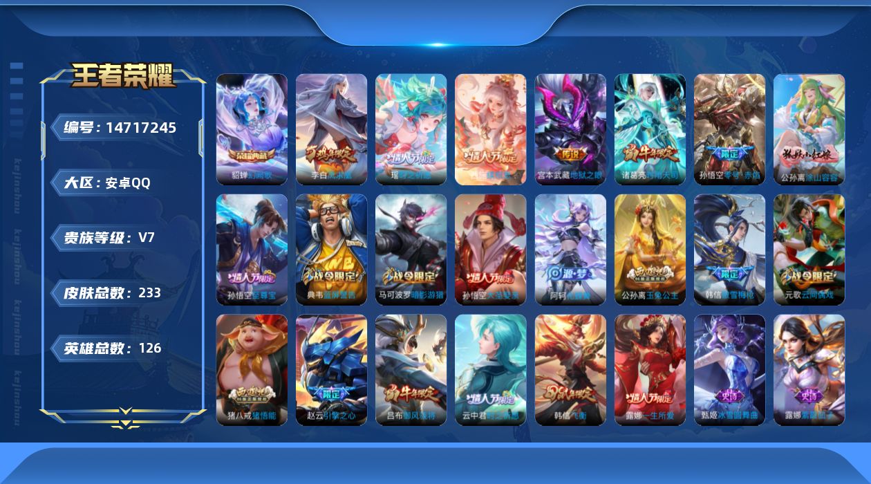v7 1典藏 6传说 126英雄 233皮肤 可修改实名 【稀有英雄】:大司命嬴政始皇帝韩信韩跳跳夏洛特夏师傅艾琳橘右京橘子娜可露露鸟人不知火舞赵云金蝉唐僧戈娅 【荣耀水晶】:幻阙歌貂蝉典藏 【传说皮】:续相思零号·赤焰地狱之眼 【珍宝阁皮】:优