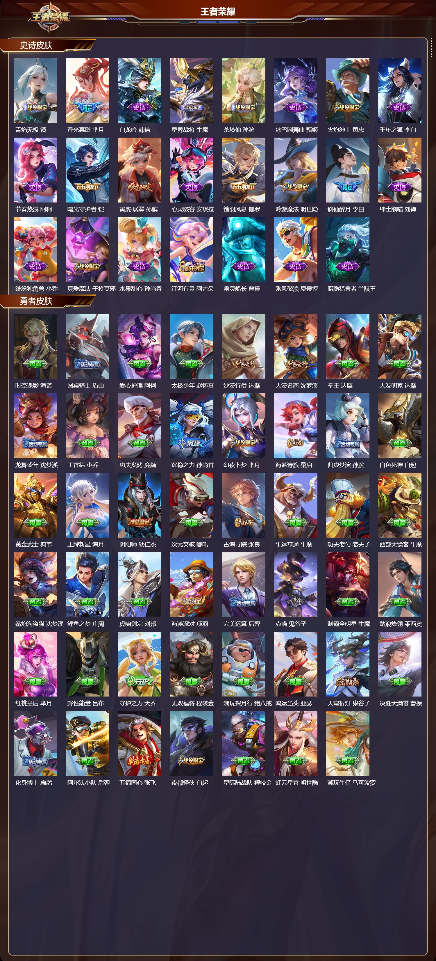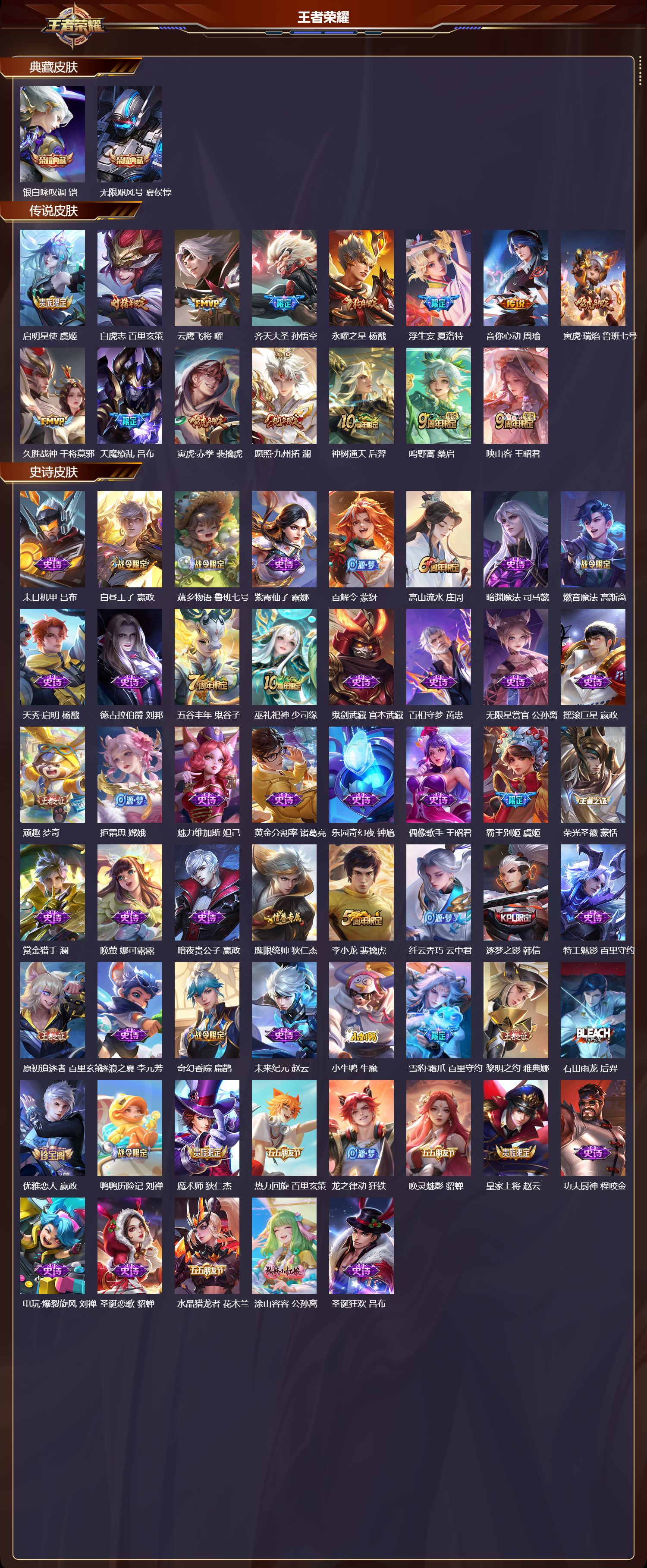 苹果微信/至尊星耀/242皮肤/126英雄/2典藏/0珍品无双/0无双/0珍品传说/15传说/76史诗/8稀有英雄【2 典藏皮肤】银白咏叹调 铠无限飓风号 夏侯惇【15 传说皮肤】启明星使 虞姬白虎志 百里玄策云鹰飞将 曜齐天大圣 孙悟空永曜之星 杨戬浮生妄 夏洛特音你心动 周瑜寅虎·瑞焰 鲁班七号久胜战神 干将莫邪天魔缭乱 吕布寅虎·赤拳 裴擒虎愿照·九州拓 澜神树通