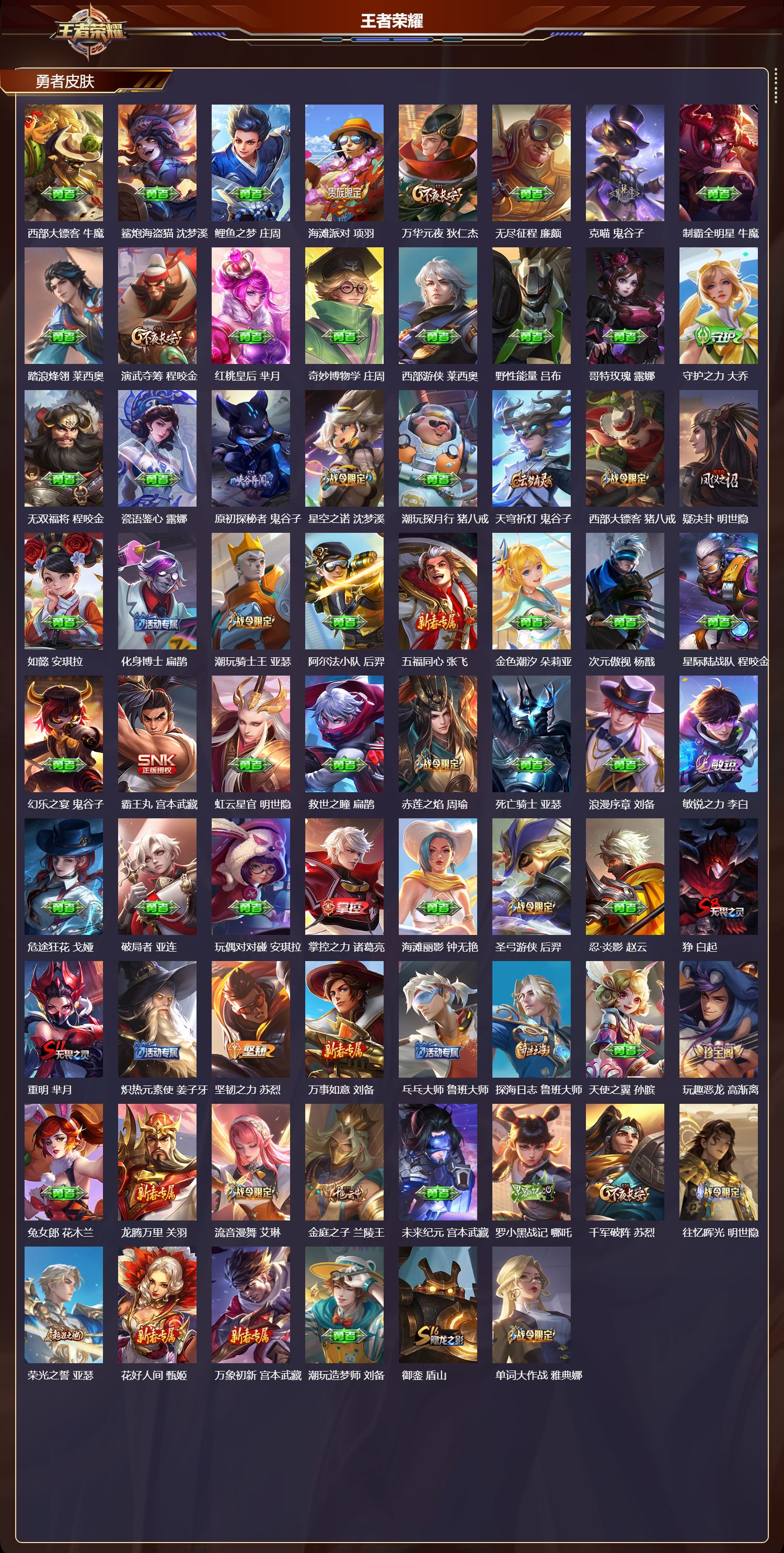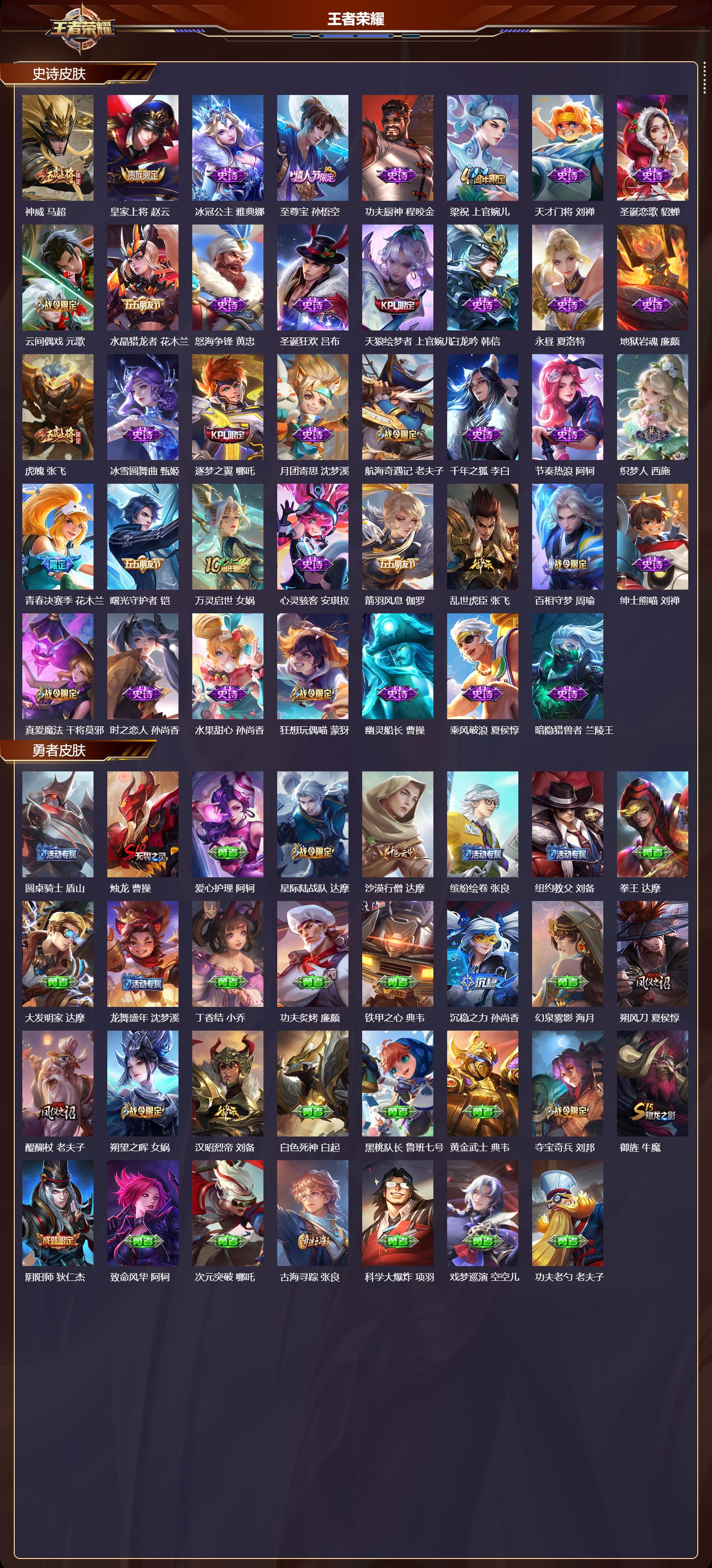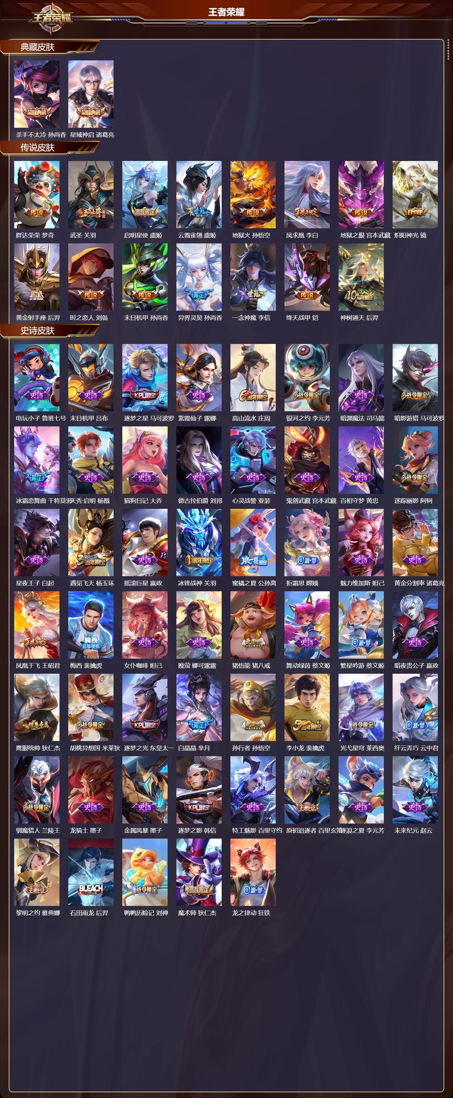 2314023-q/最强王者/337皮肤/126英雄/2典藏/0珍品无双/0无双/0珍品传说/15传说/92史诗/8稀有英雄 【2 典藏皮肤】杀手不太冷 孙尚香星域神启 诸葛亮 【15 传说皮肤】胖达荣荣 梦奇武圣 关羽启明星使 虞姬云霓雀翎 虞姬地狱火 孙悟空凤求凰 李白地狱之眼 宫本武藏炽阳神光 镜黄金射手座 后羿时之恋人 刘备末日机甲 孙尚香异界灵契 孙尚香