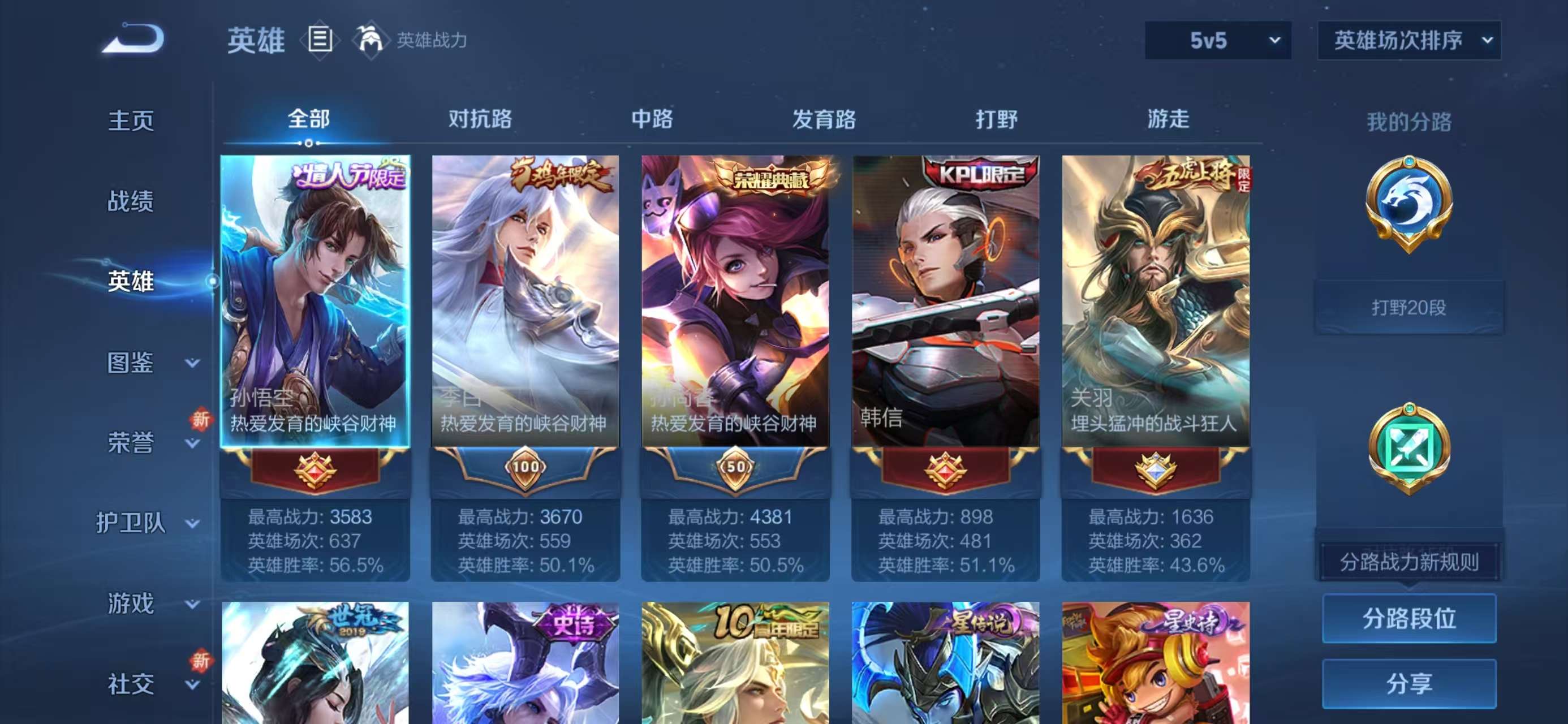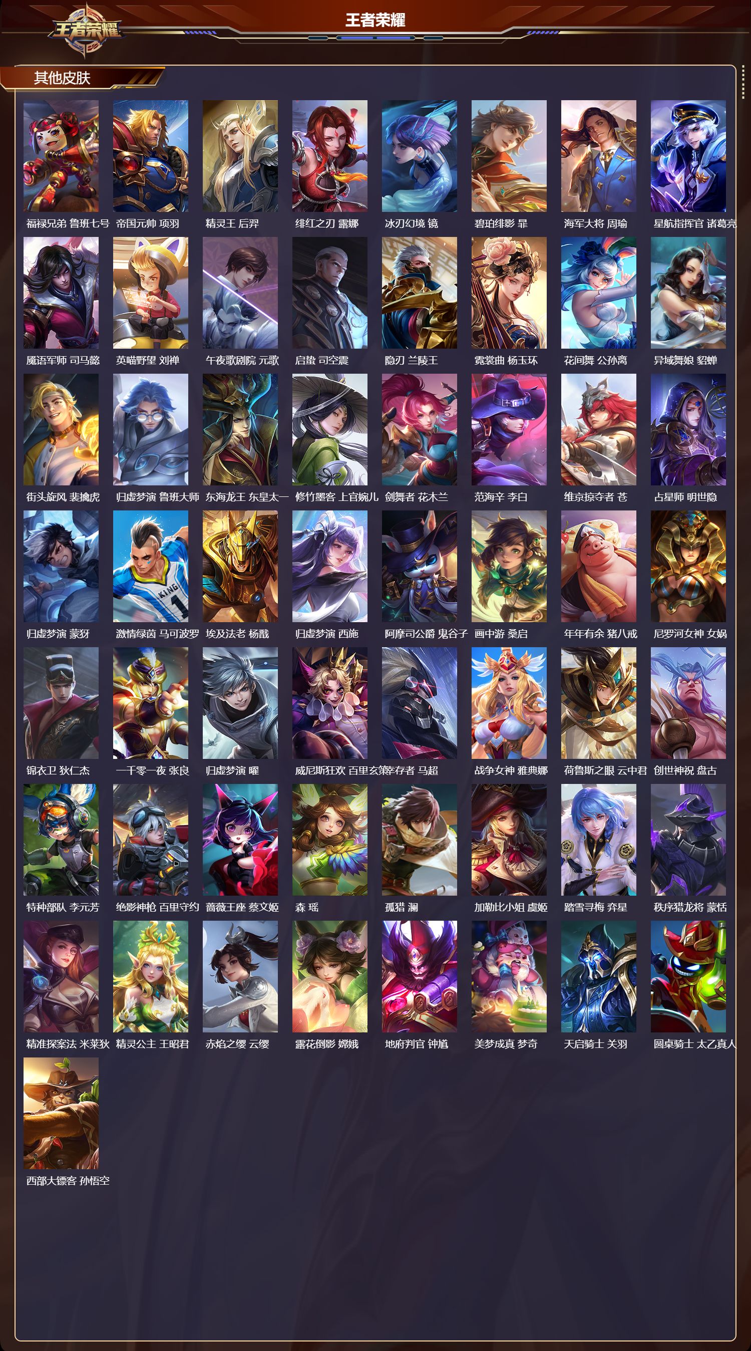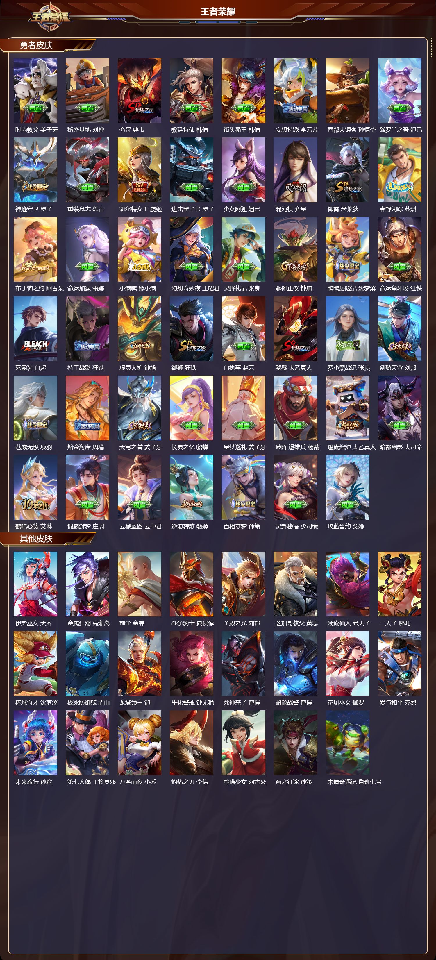 2314023-q/最强王者/337皮肤/126英雄/2典藏/0珍品无双/0无双/0珍品传说/15传说/92史诗/8稀有英雄 【2 典藏皮肤】杀手不太冷 孙尚香星域神启 诸葛亮 【15 传说皮肤】胖达荣荣 梦奇武圣 关羽启明星使 虞姬云霓雀翎 虞姬地狱火 孙悟空凤求凰 李白地狱之眼 宫本武藏炽阳神光 镜黄金射手座 后羿时之恋人 刘备末日机甲 孙尚香异界灵契 孙尚香