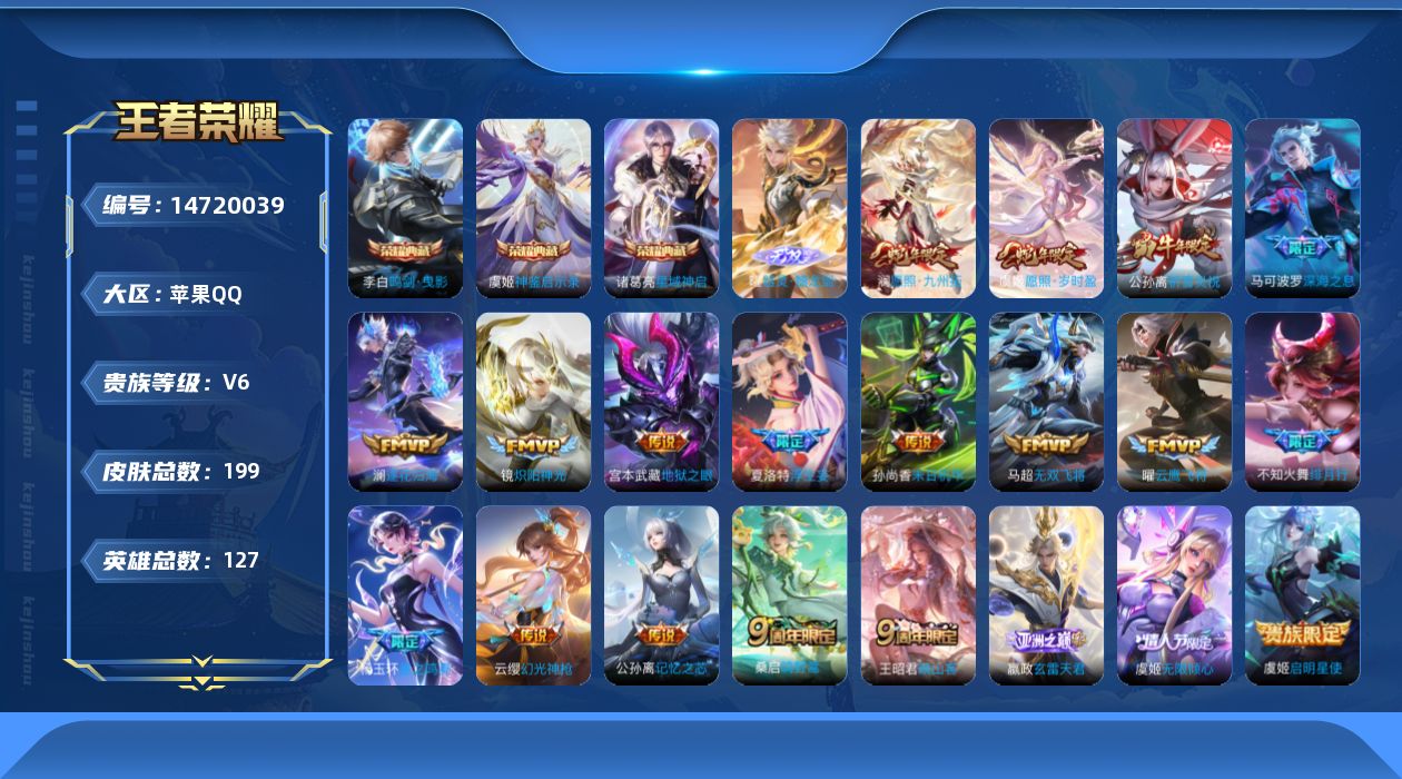[14720039]贵族8-贵族积分89642-199皮3典藏22传说1无双-3个英雄全皮 打野偏小女号 苹果手q122区199皮3典藏22传说1无双v6 营地id1817710173荣耀王者【无双皮肤】:器灵·螭龙剑【荣耀典藏】:星域神启神鉴启示录鸣剑·曳影【优质限定皮肤】:祈雪灵祝无双飞将神威【传说皮肤】:神树通天祈雪灵祝无双飞将云鹰飞将幻光神呛逐花归海地狱之