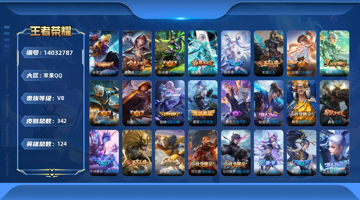 [14032787]苹果q-v-342皮肤-1典藏 11传说 1典藏已兑换 全息碎影 神威 幻光神呛 至尊宝 鸣野蒿 朱雀志 启明星使 时雨天司 寅虎赤拳 岱宗 武圣 天狼溯光者 纯白花嫁 默契交锋女 傲雪梅呛 青春决赛季 冰霜恋舞曲 时之祈愿男 异界灵契 拒霜思 匿光追影者 孙行者 蓝屏警告 银河之约 暗影游猎 原初追逐者 黎明之约 梁祝 狂想玩偶喵 云间偶戏 苍穹之光 暗夜猫娘 诗语