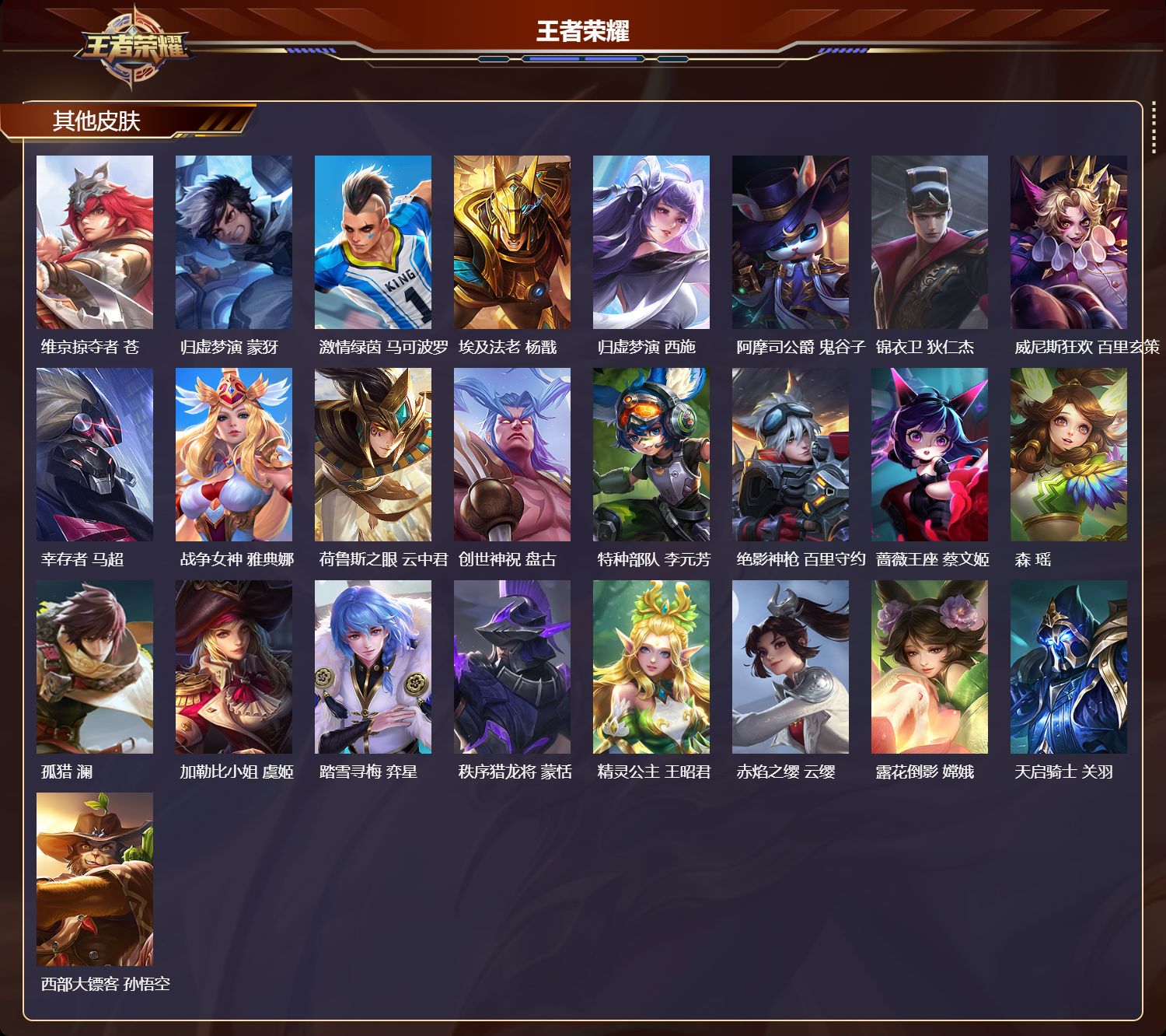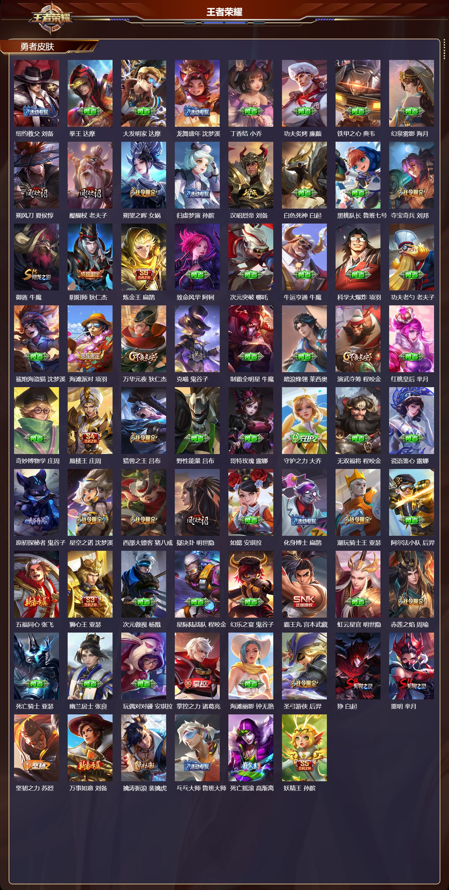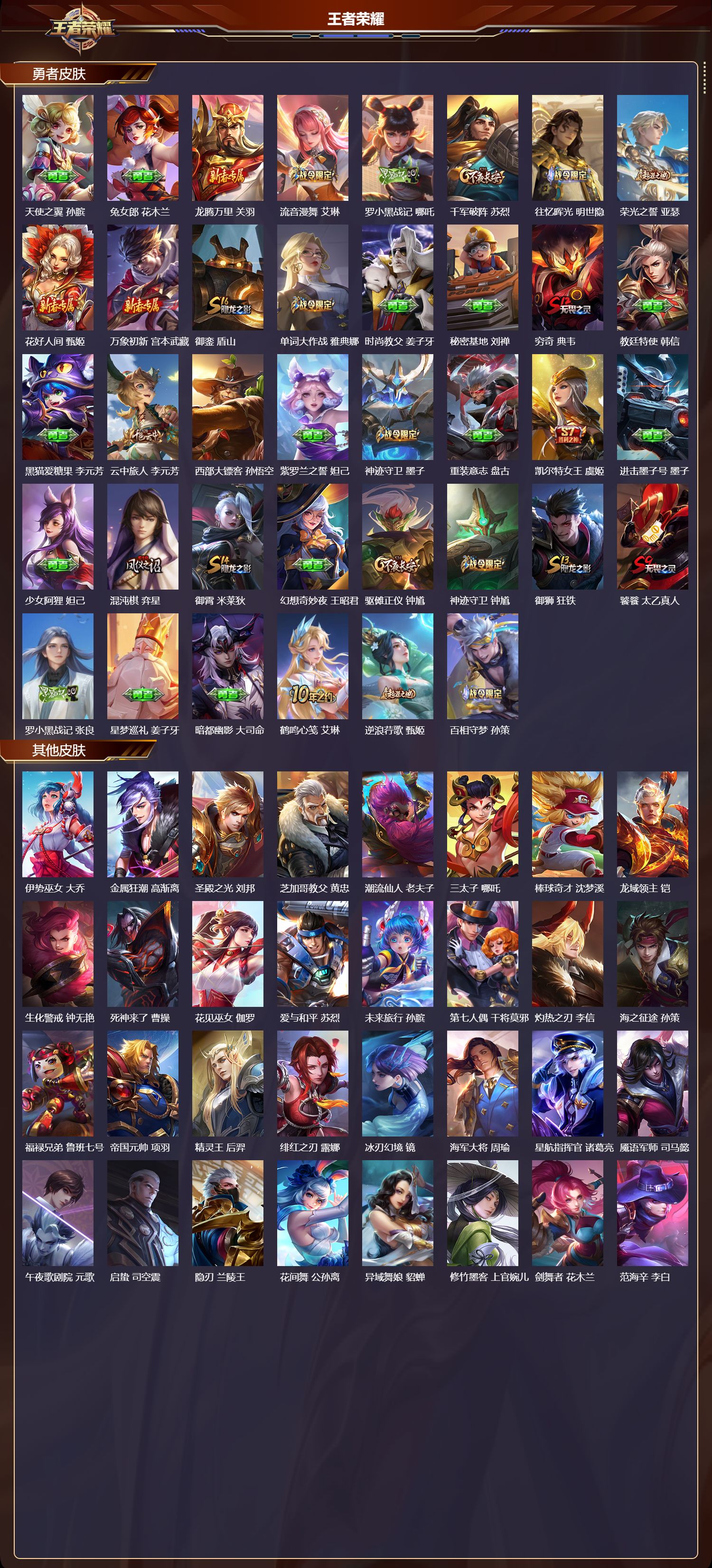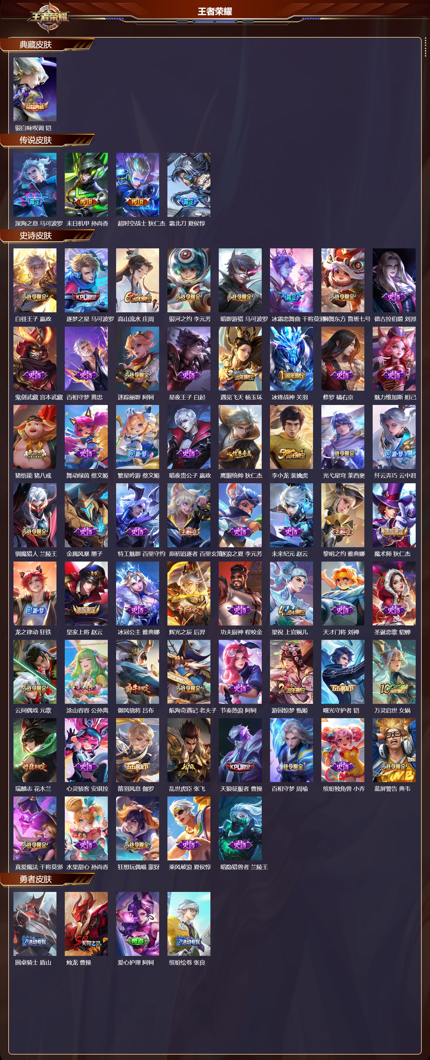 安卓qq/荣耀王者/237皮肤/126英雄/1典藏/0珍品无双/0无双/0珍品传说/4传说/61史诗/8稀有英雄【1 典藏皮肤】银白咏叹调 铠【4 传说皮肤】深海之息 马可波罗末日机甲 孙尚香超时空战士 狄仁杰霜北刀 夏侯惇【61 史诗皮肤】白昼王子 嬴政逐梦之星 马可波罗高山流水 庄周银河之约 李元芳暗影游猎 马可波罗冰霜恋舞曲 干将莫邪狮舞东方 鲁班七号德古拉伯爵 刘邦